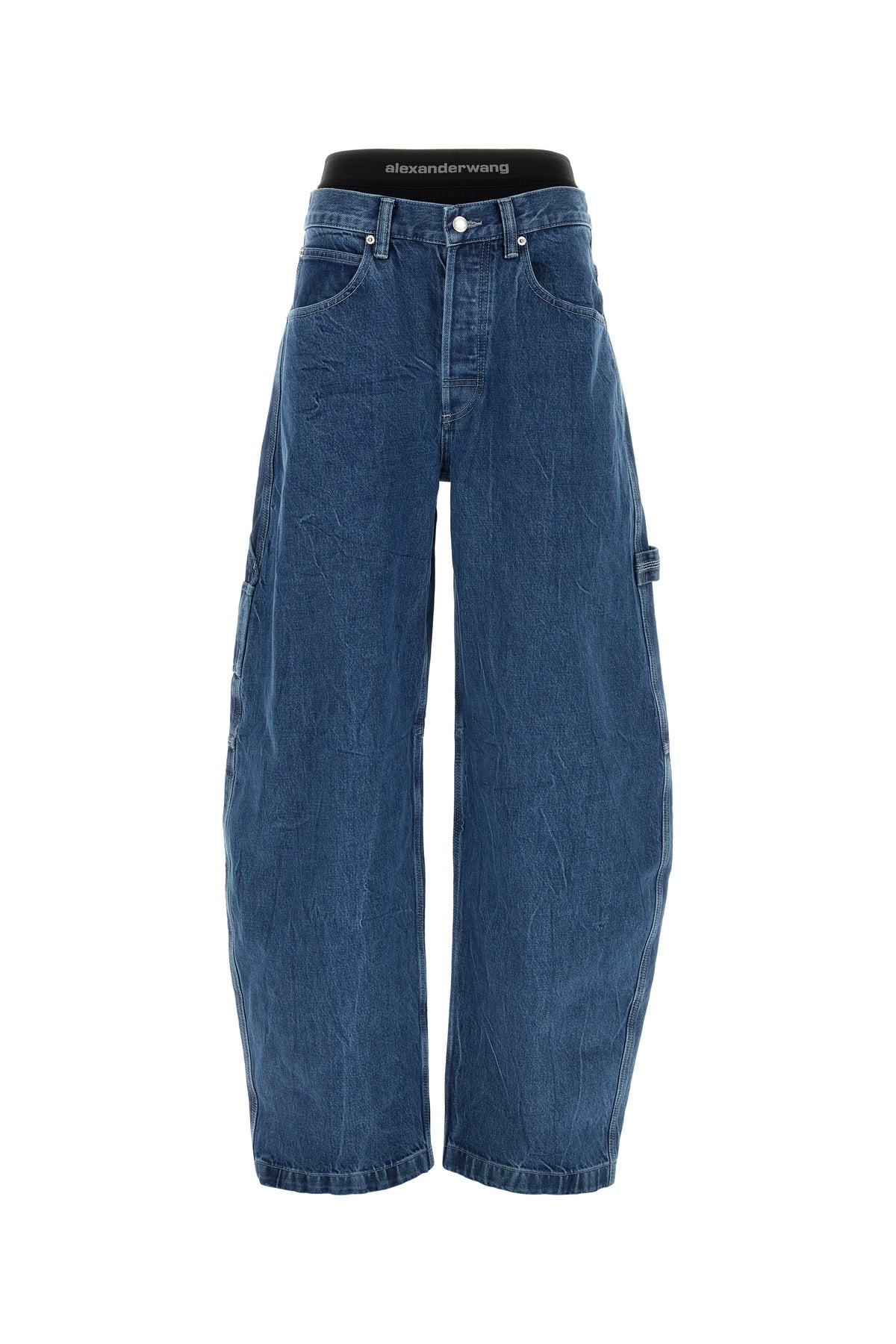 Wide-leg jeans realized in stonewashed pure cotton denim with logoed insert at the top enriched by logoed label at the back.