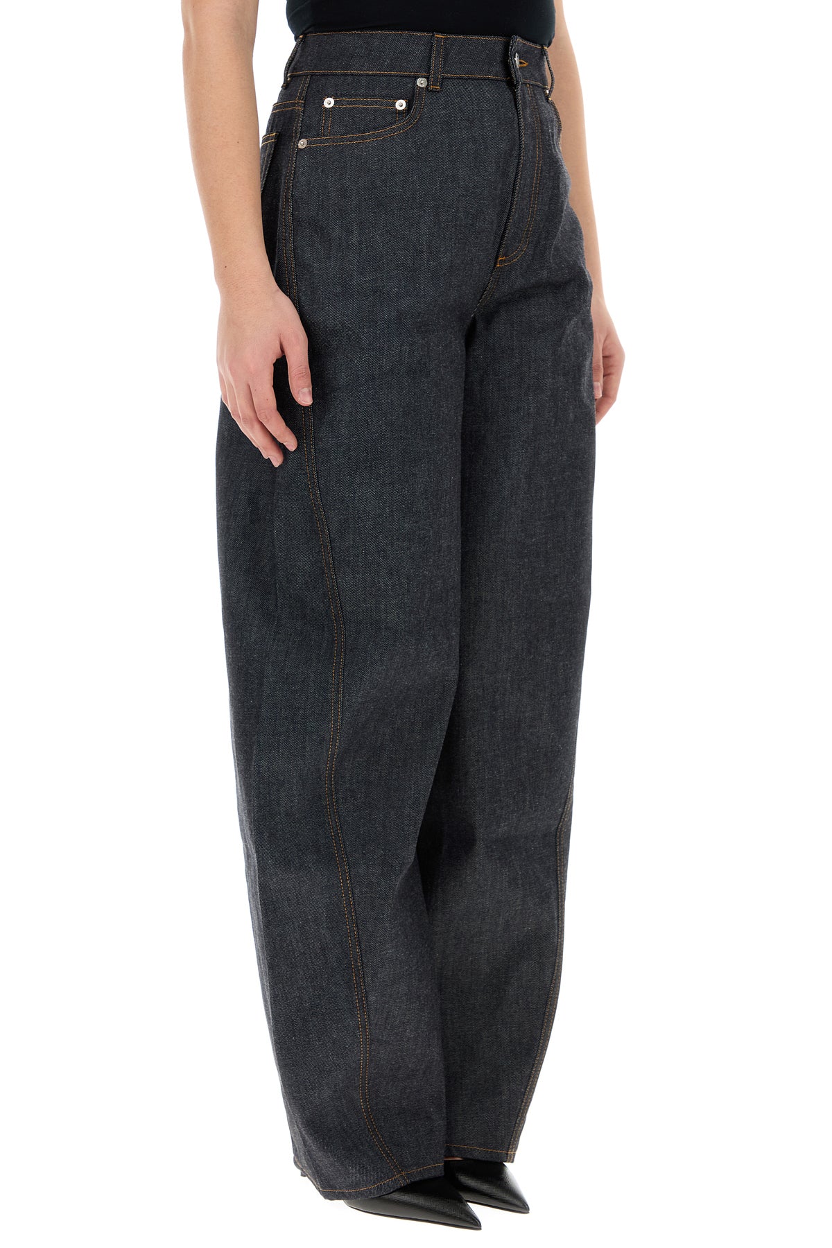 Wide-leg jeans realized in pure cotton denim enriched by logoed label at the back.