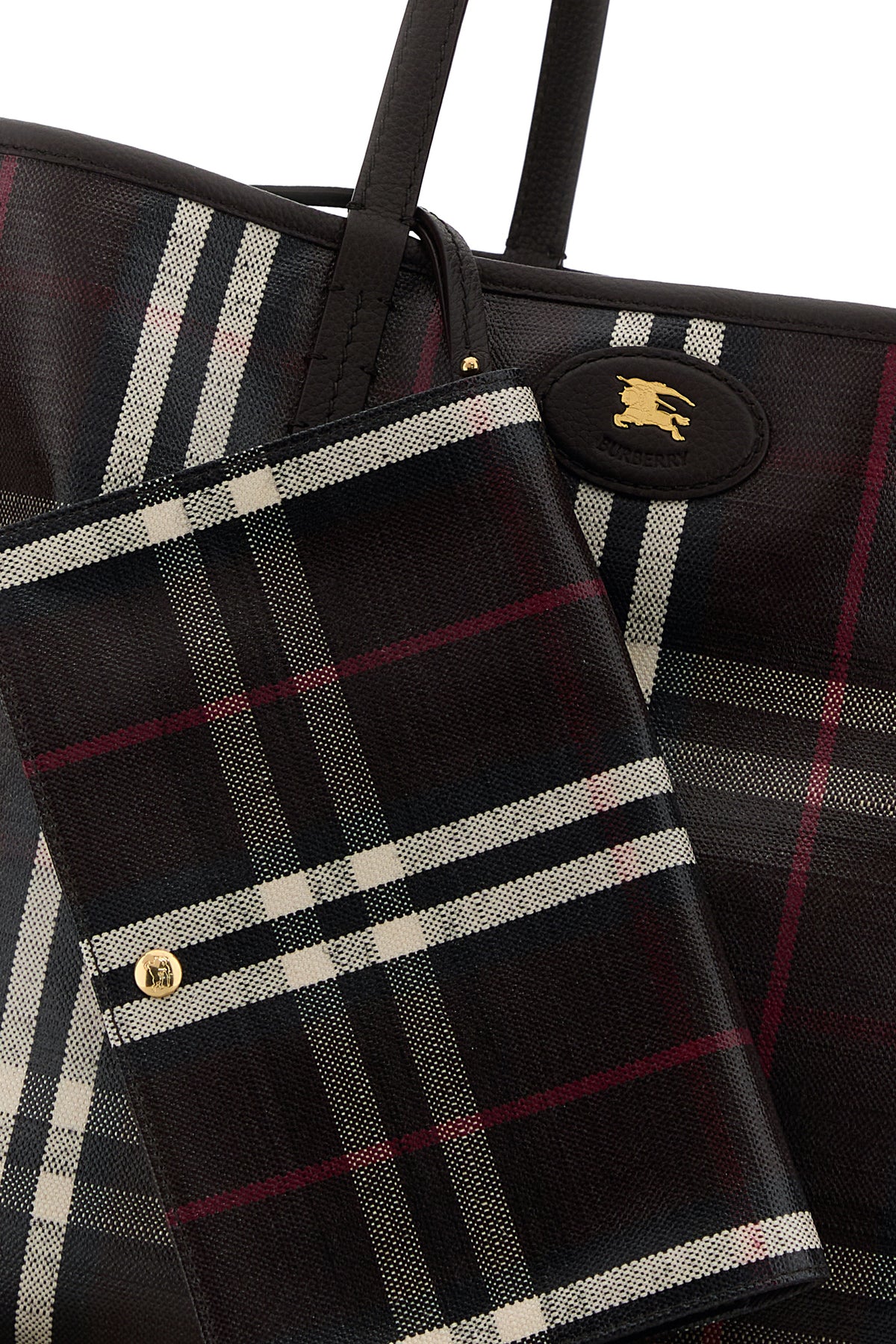 Shopping bag realized in coated canvass with calf leather trimmings characterized by Burberry Check motif embroidery on the entire surface enriched by Equestrian Knight detail at the front.