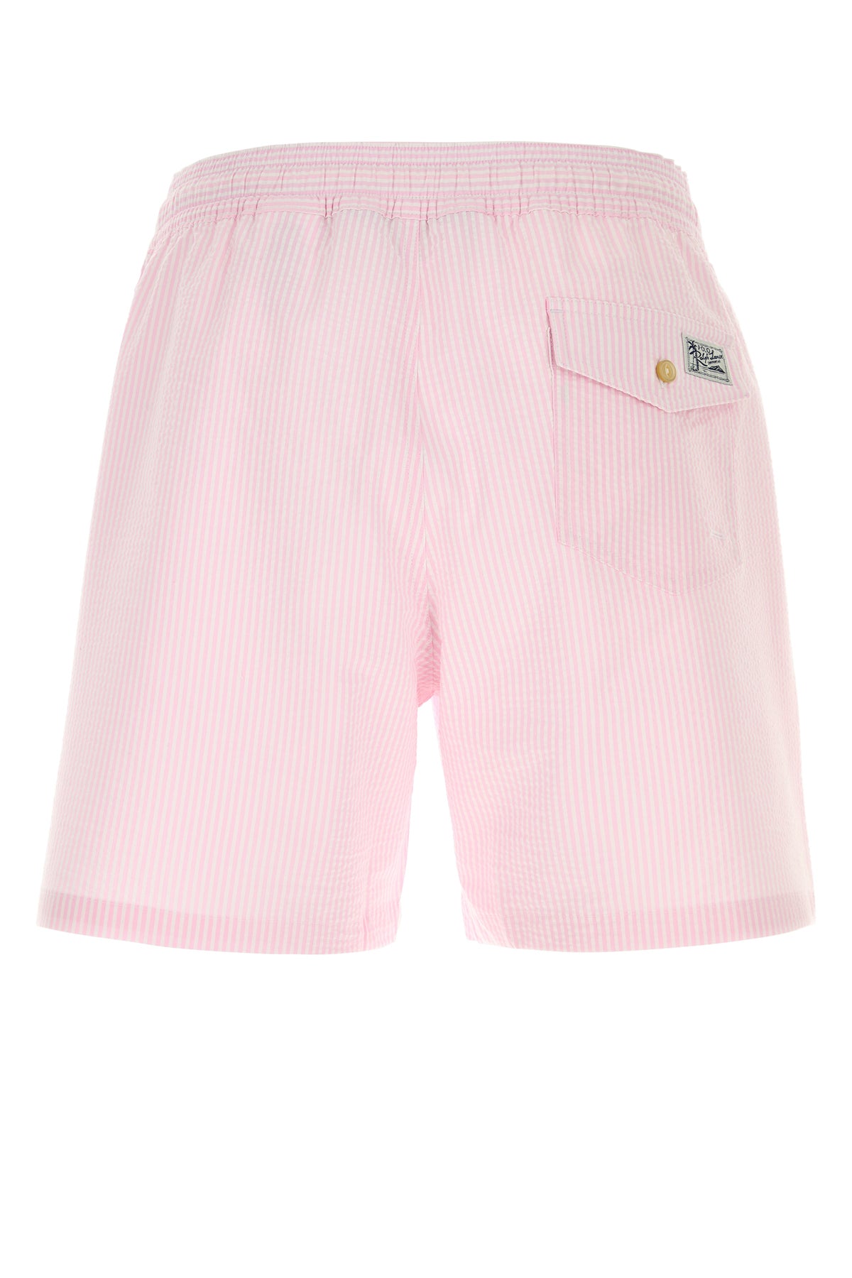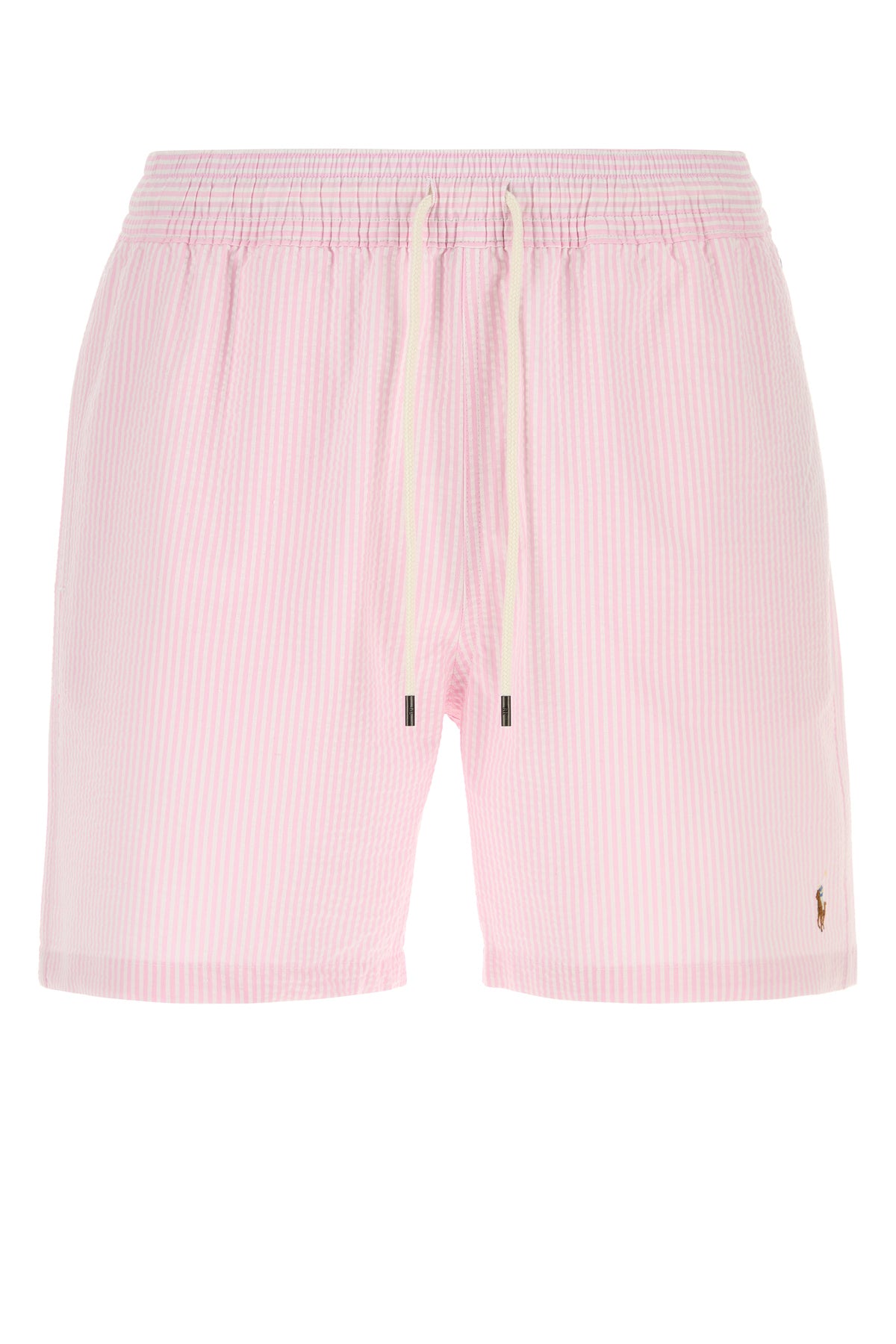 Swimming shorts realized in stretch cotton blend characterized by striped embroidery on the entire surface and iconic embroidered logo on the hemline enriched by logoed label at the back.