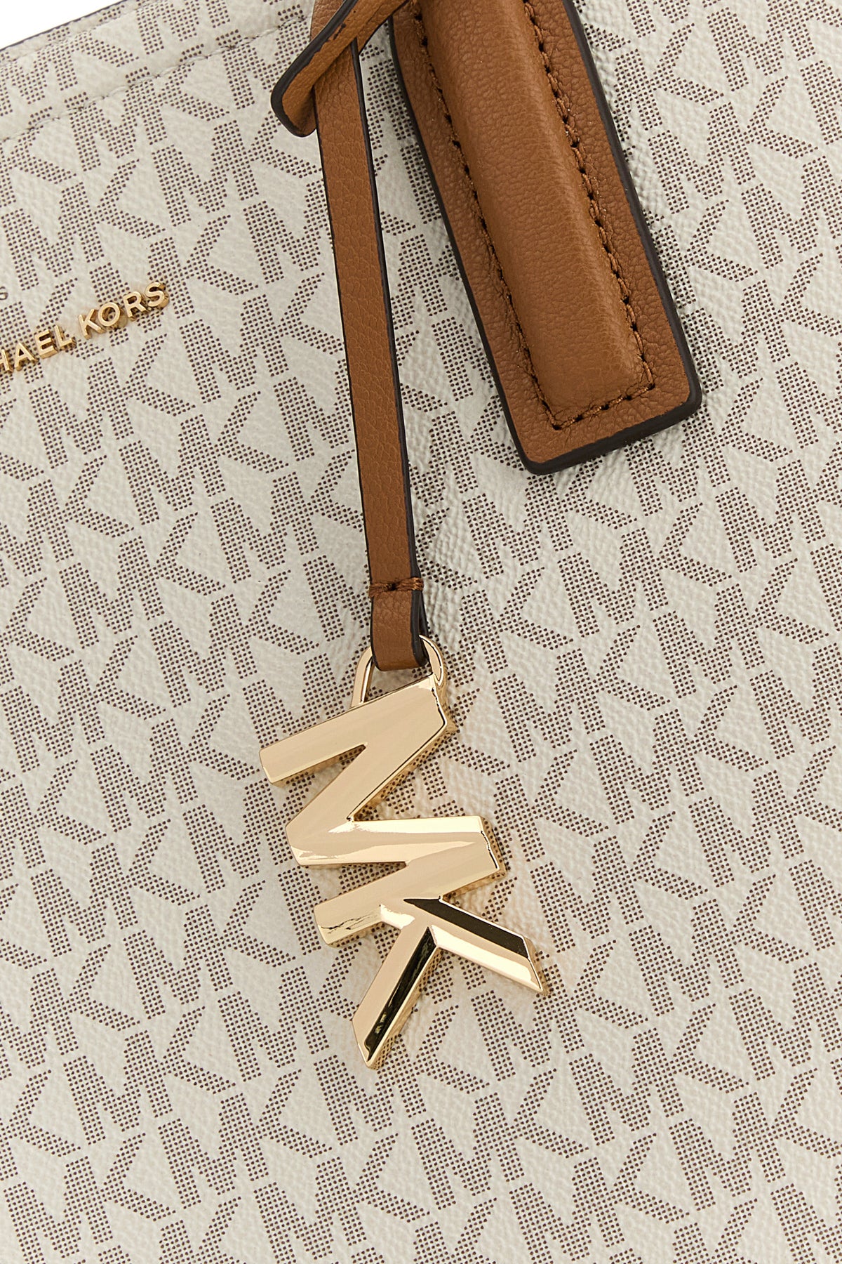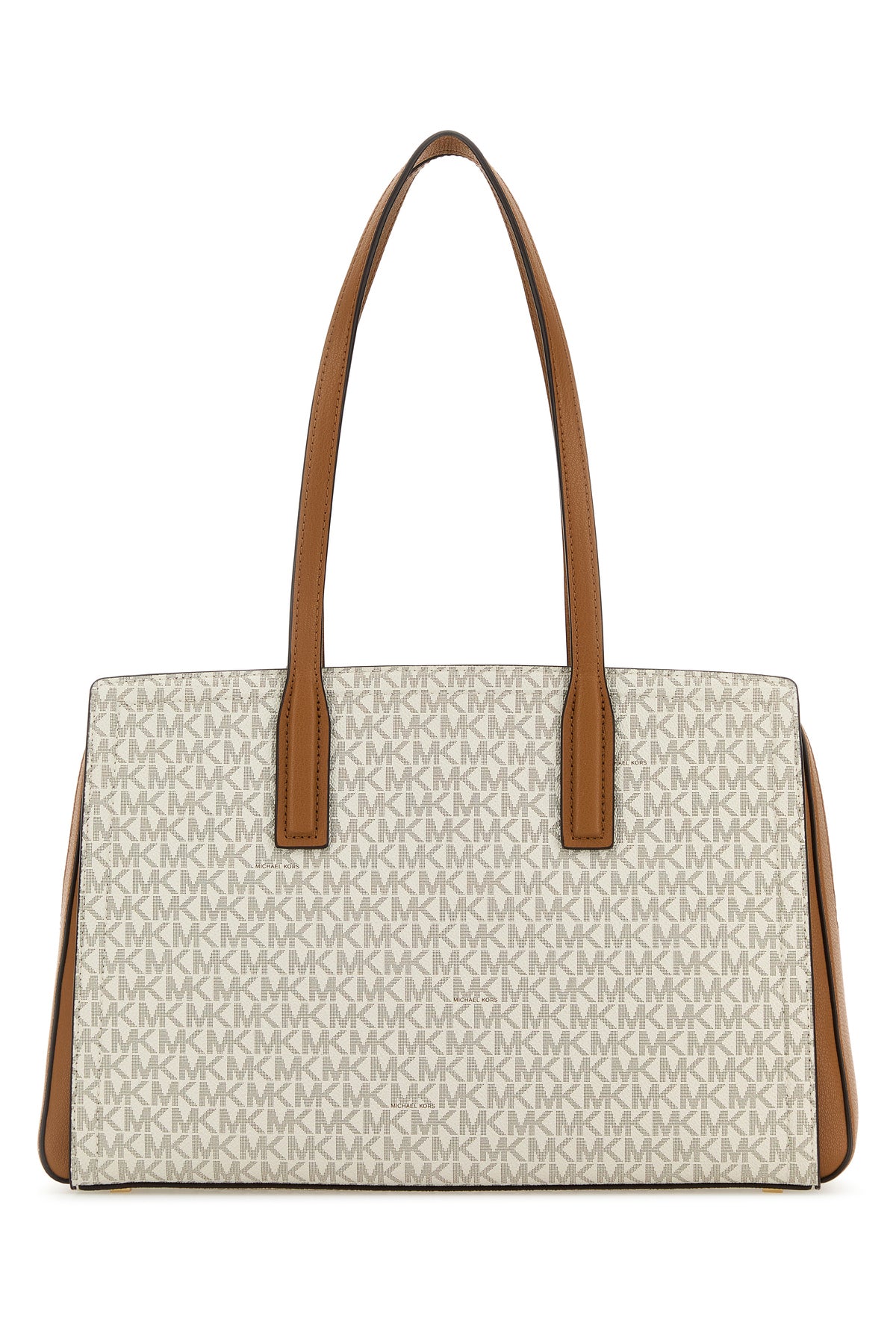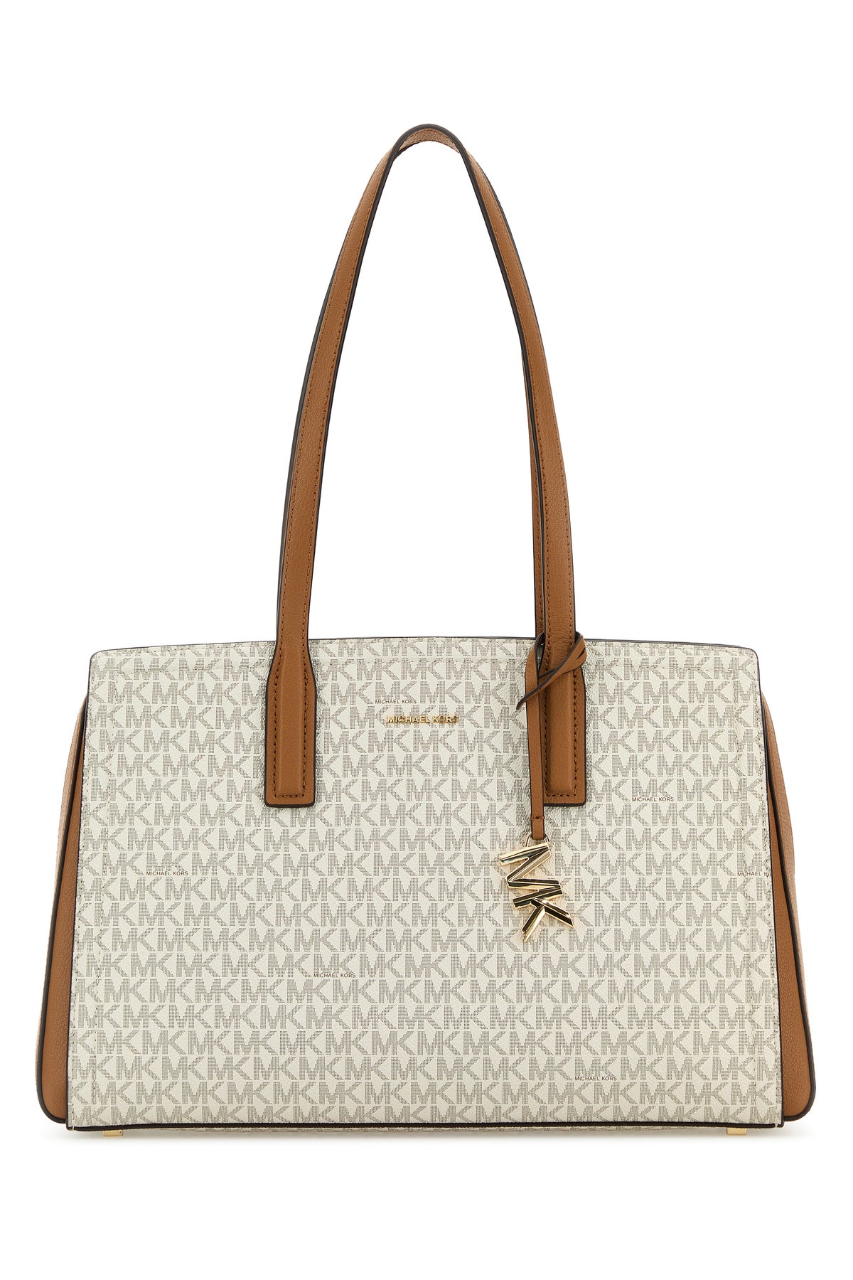 Shopping bag realized in coated canvas characterized by logoed print on the entire surface enriched by metal lettering logo at the front.