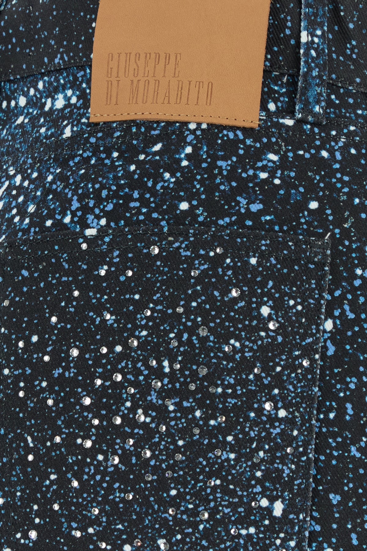Jeans realized in stretch cotton denim characterized by peculiar print enriched by rhinestones on the entire surface.