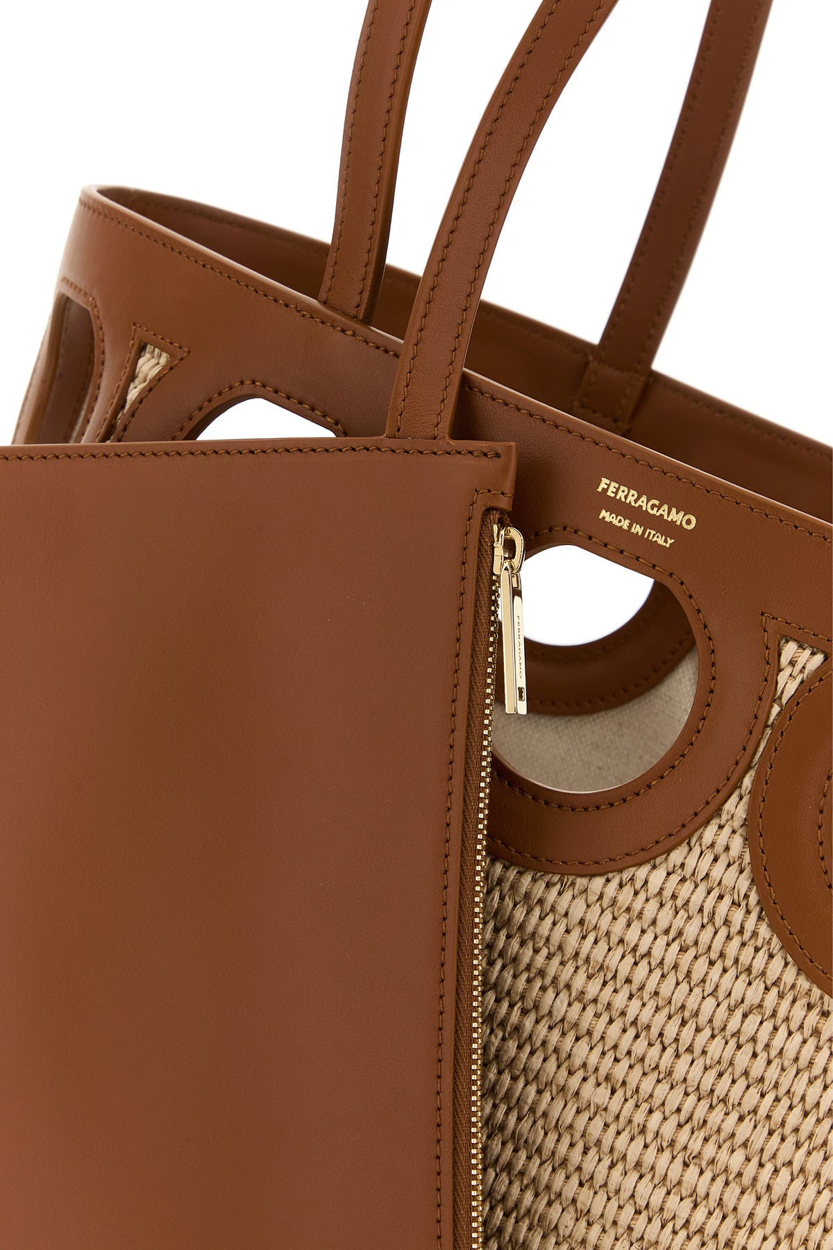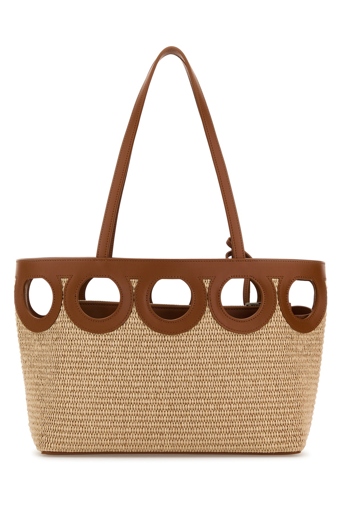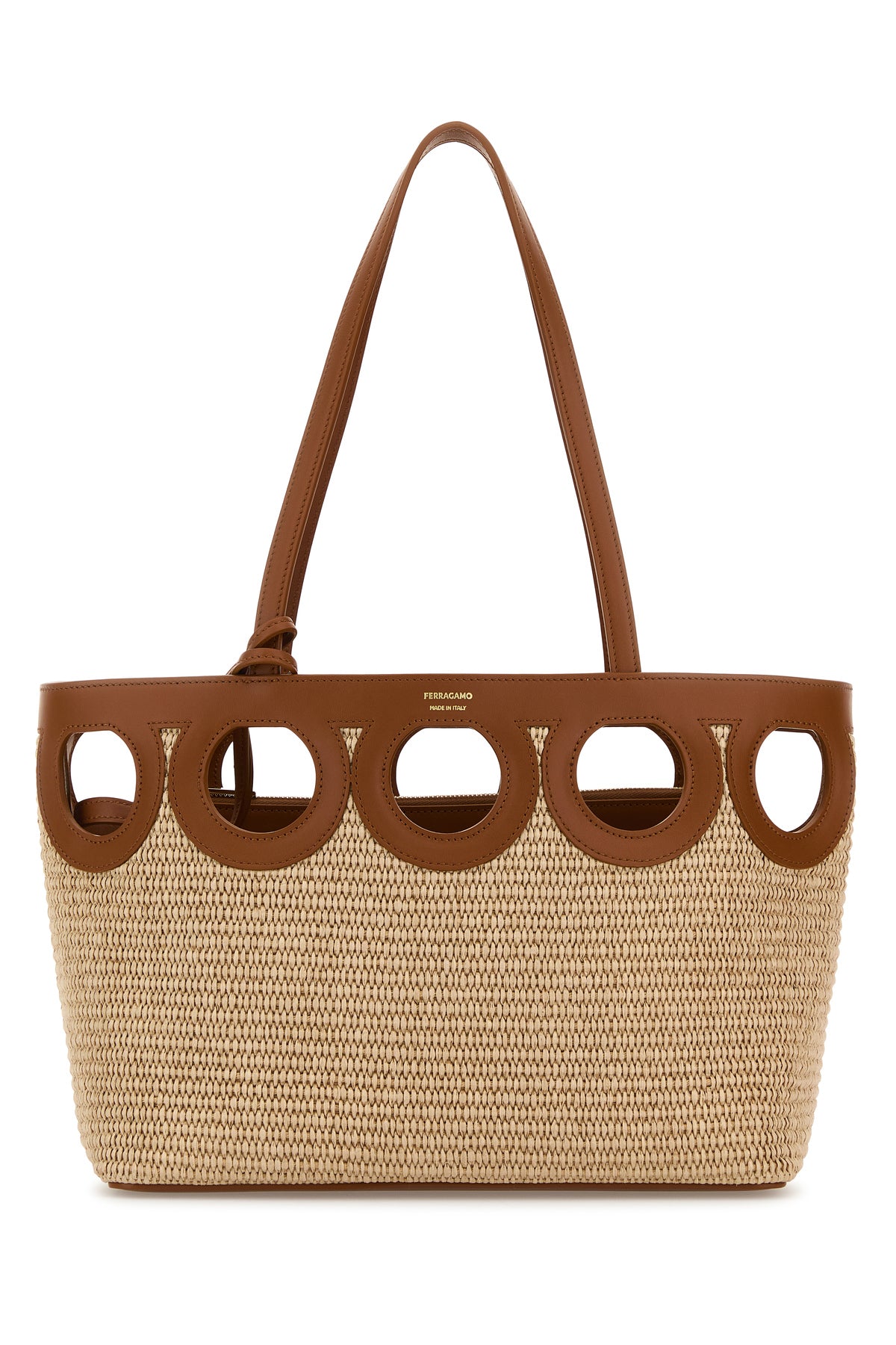 Shopping bag realized in raffia characterized by laminated printed logo at the front.