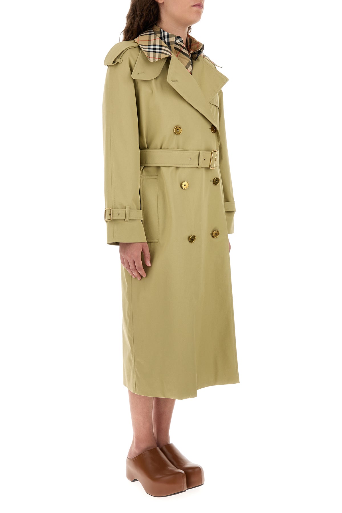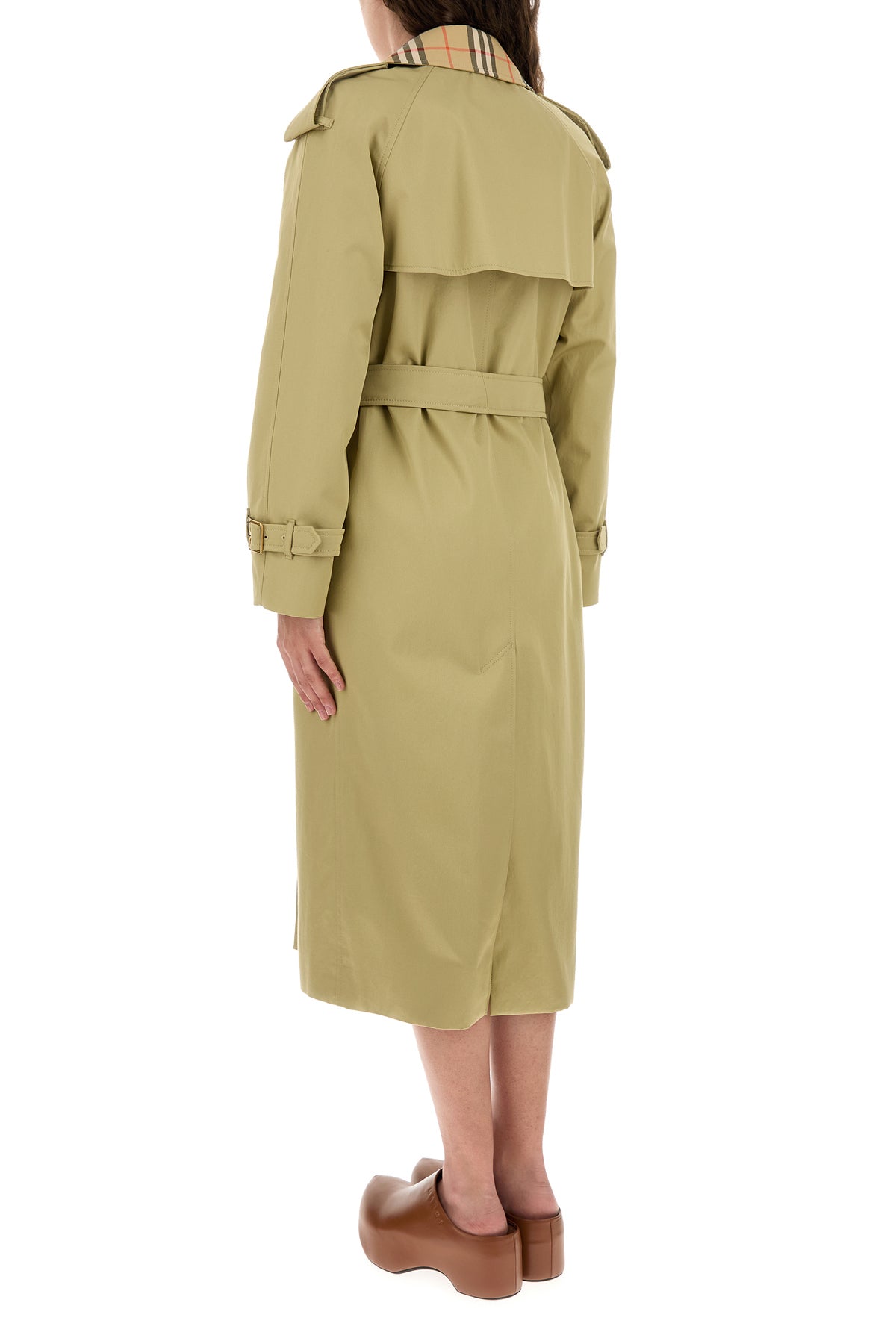 Trench coat realized in pure cotton gabardine characterized by collar with Burberry Check embroidery.