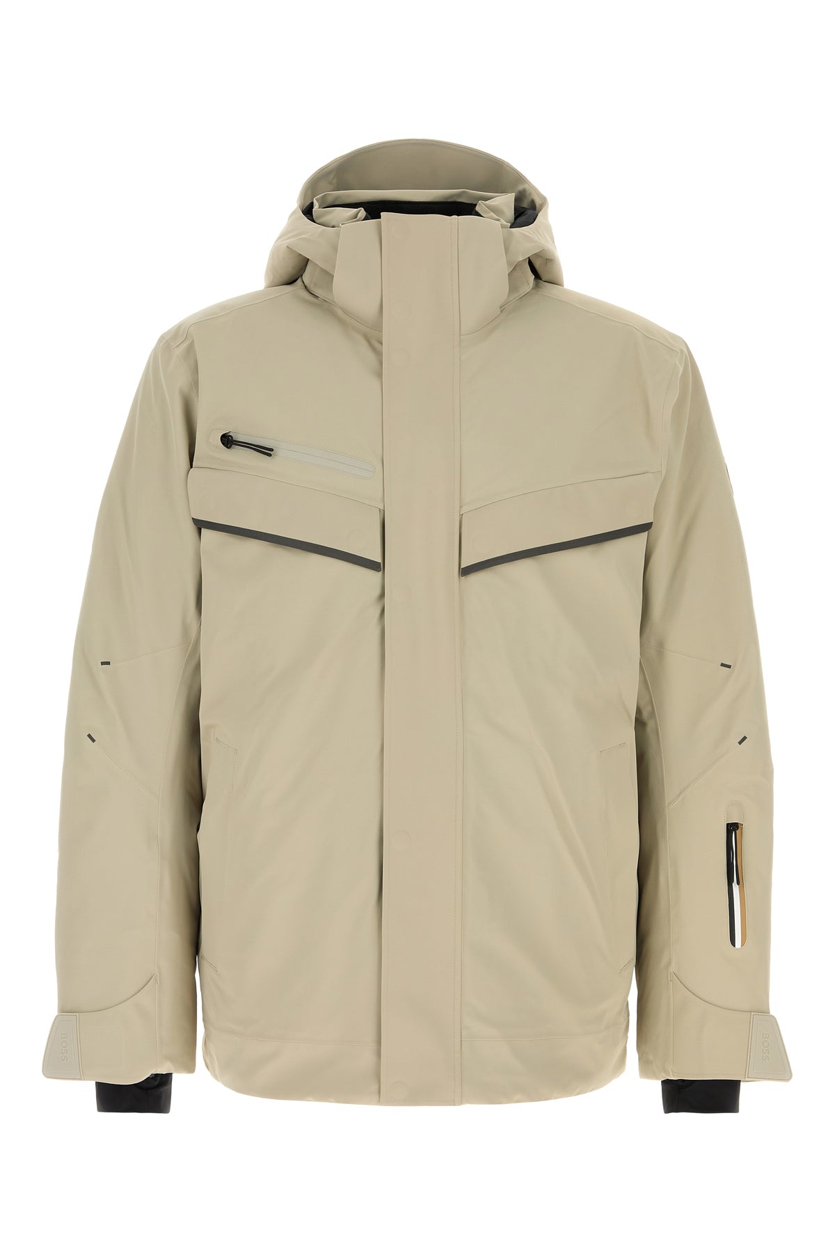 Ski jacket realized in stretch nylon enriched by logoed patch on the sleeve.