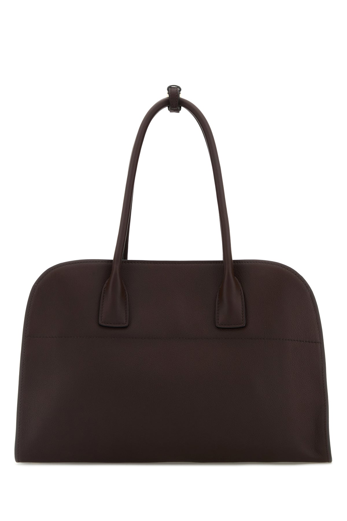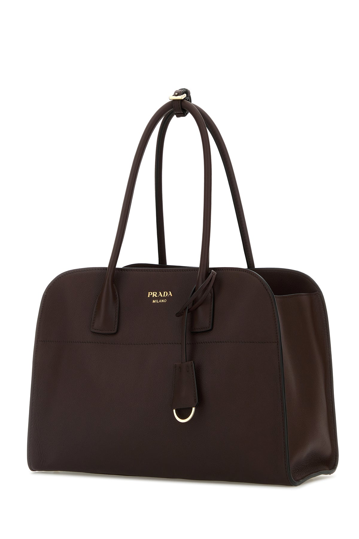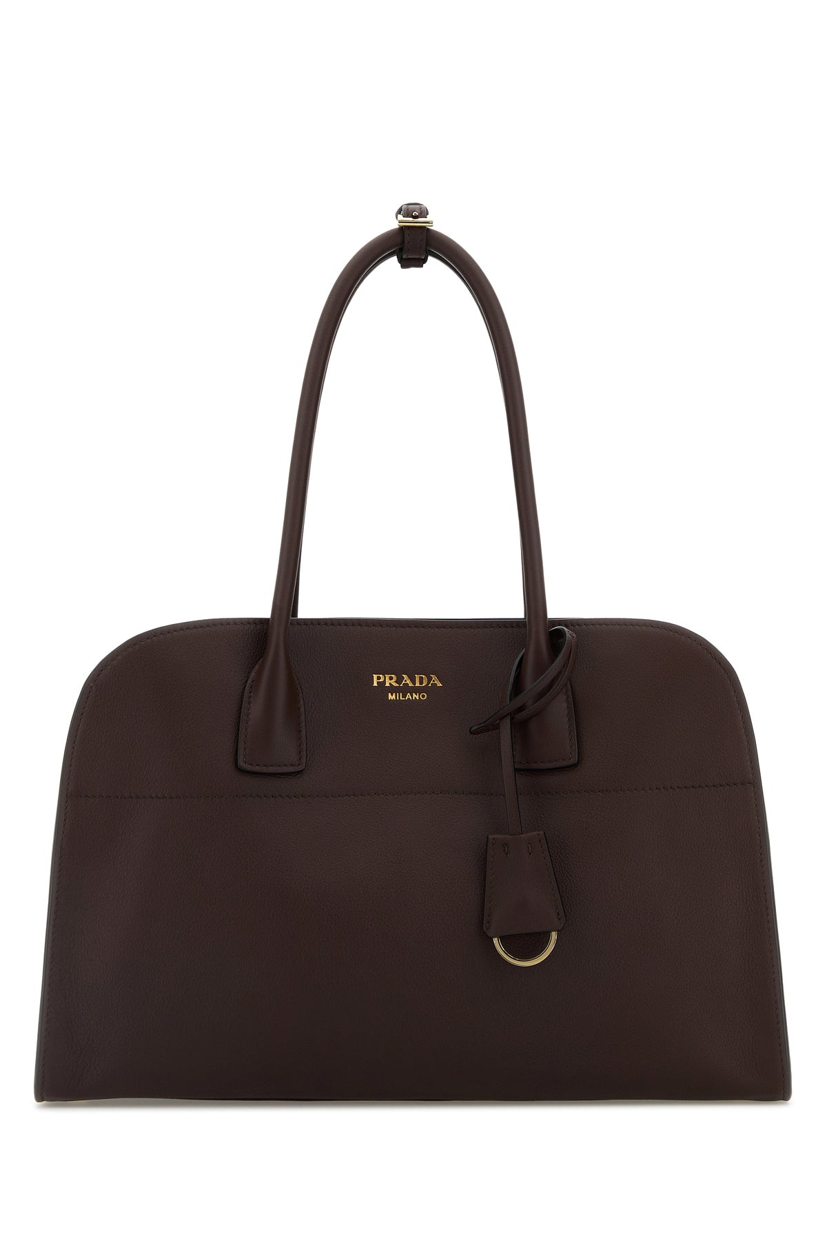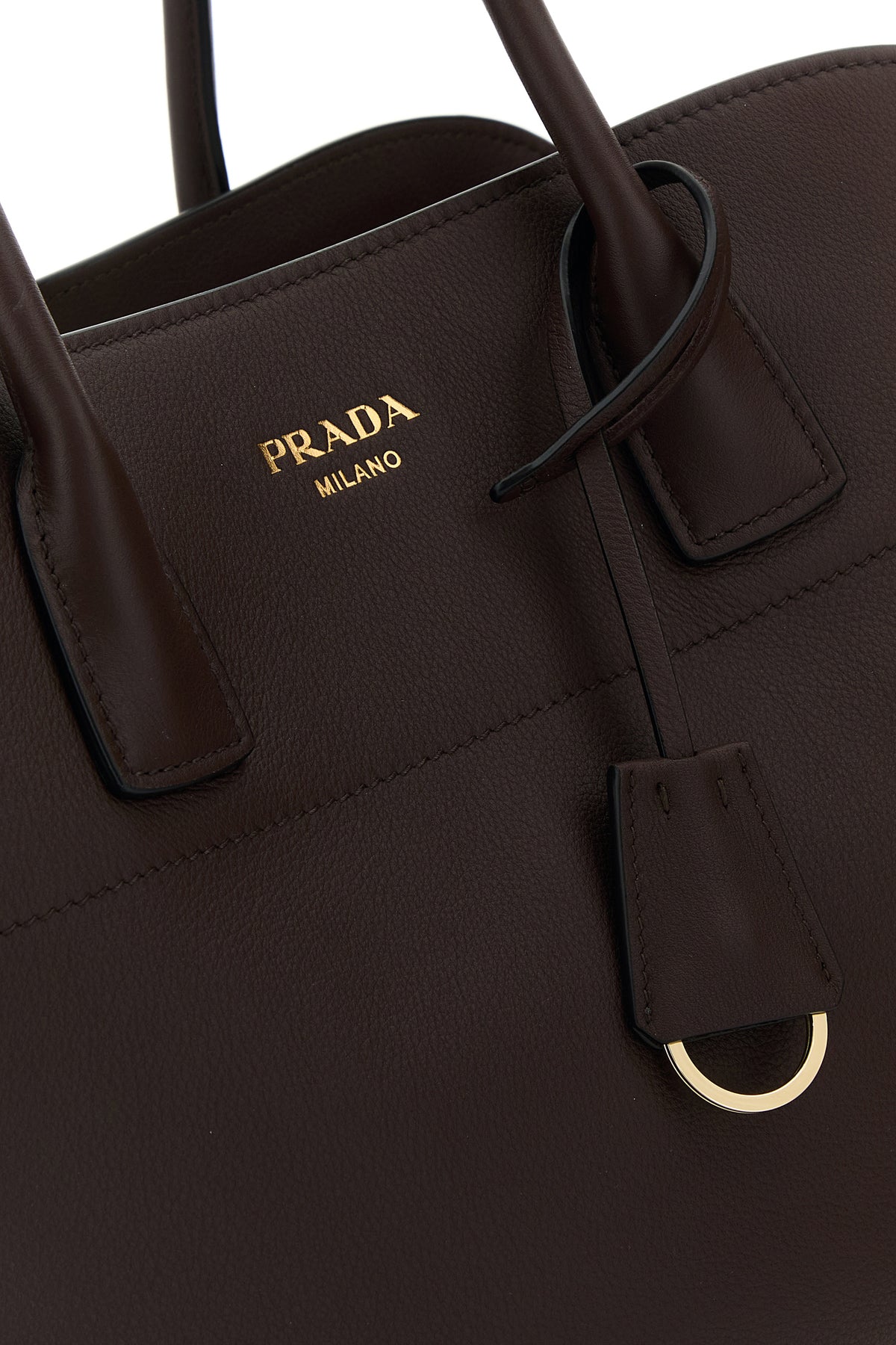 Shopping bag realized in pebble leather characterized by laminated printed logo at the front.