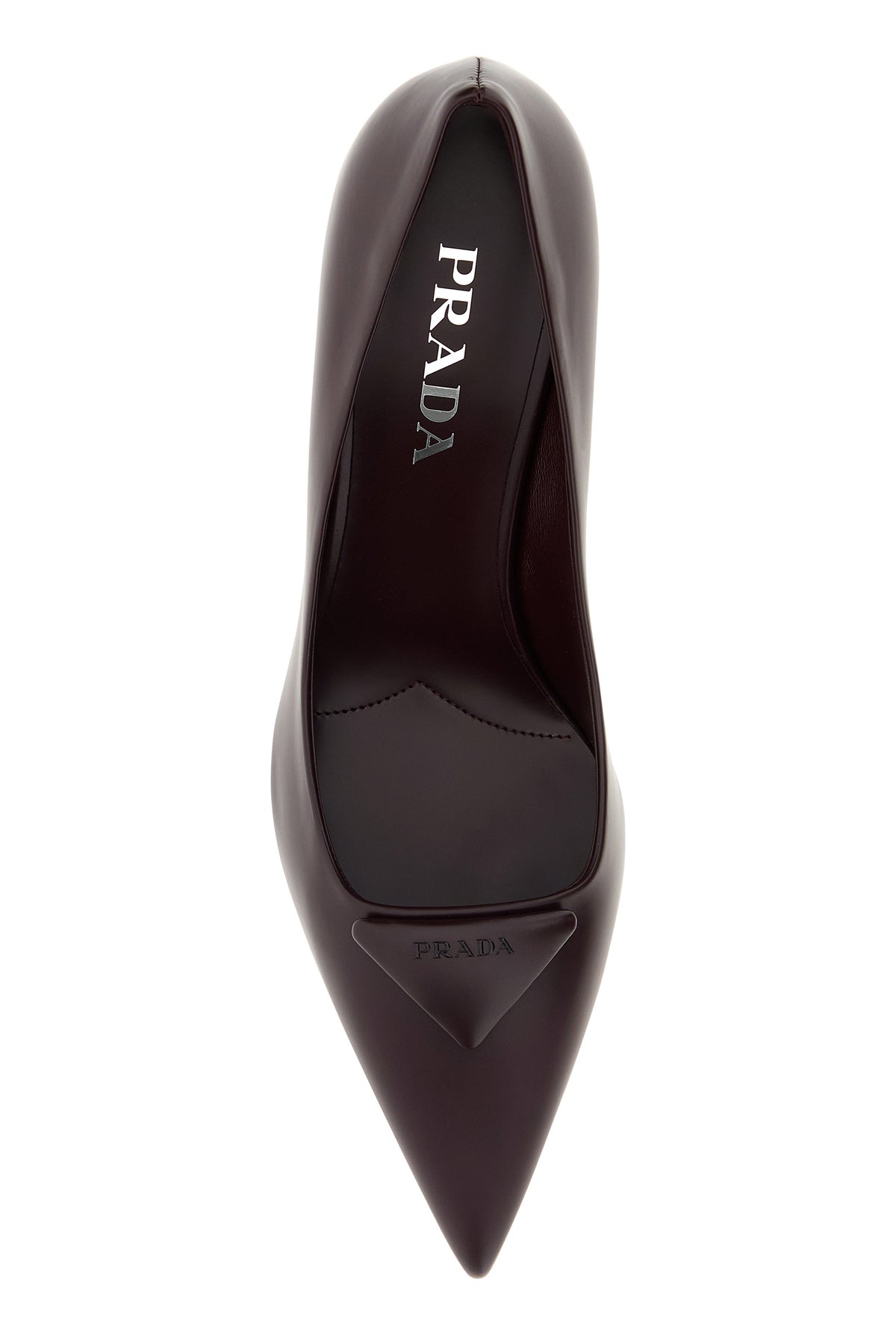 Pumps realized in polished finish smooth leather characterized by iconic logoed triangle in relief at the front.