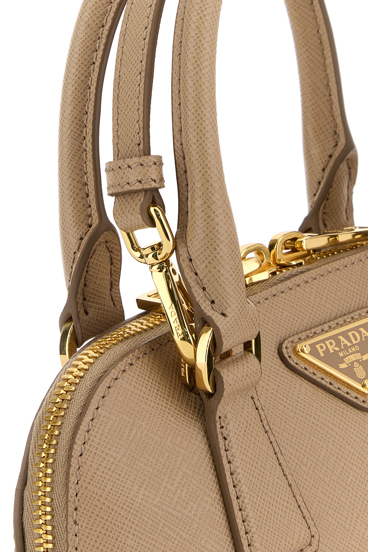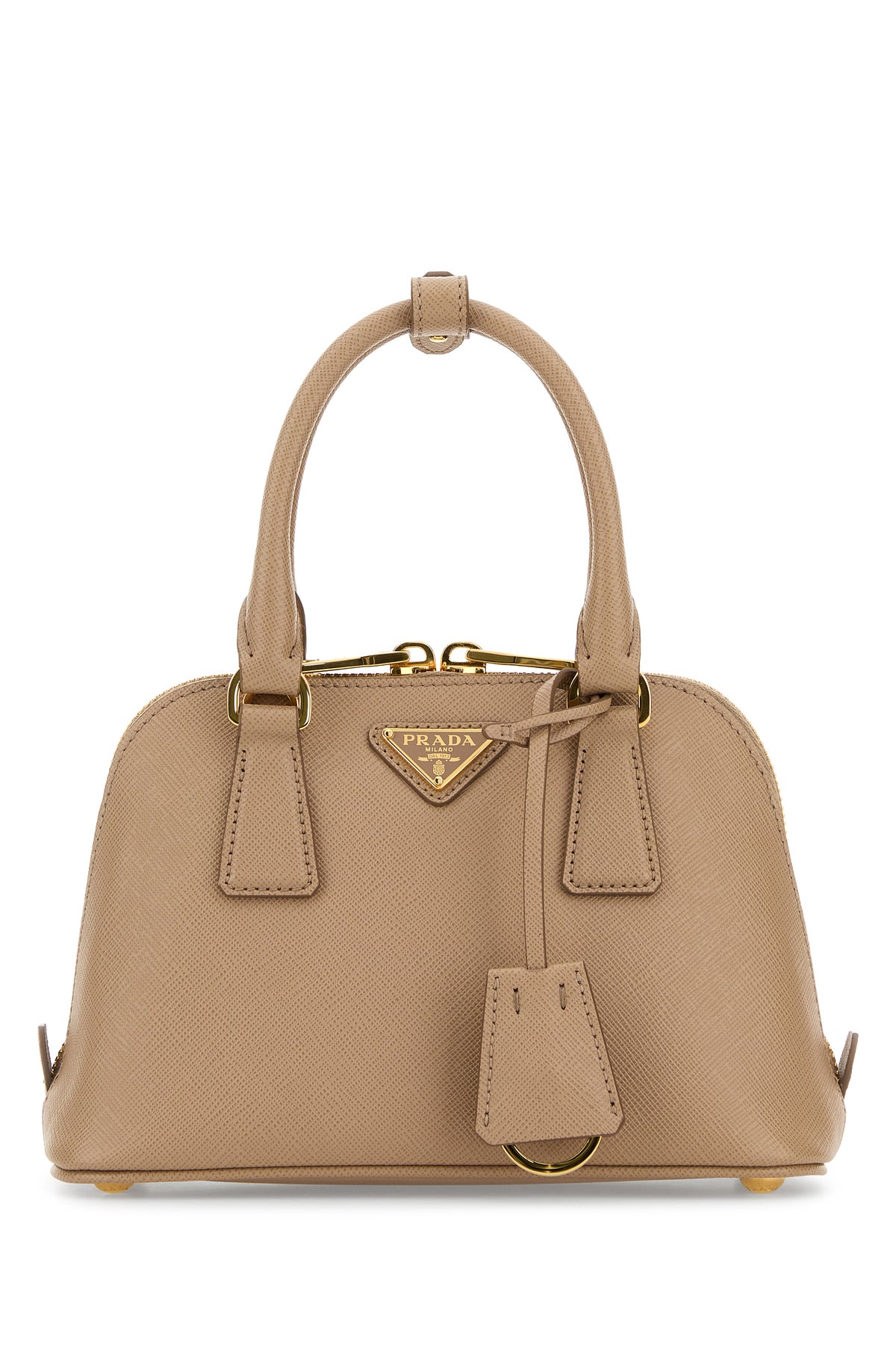Handbag realized in Saffiano leather enriched by iconic logoed metal triangle at the front.