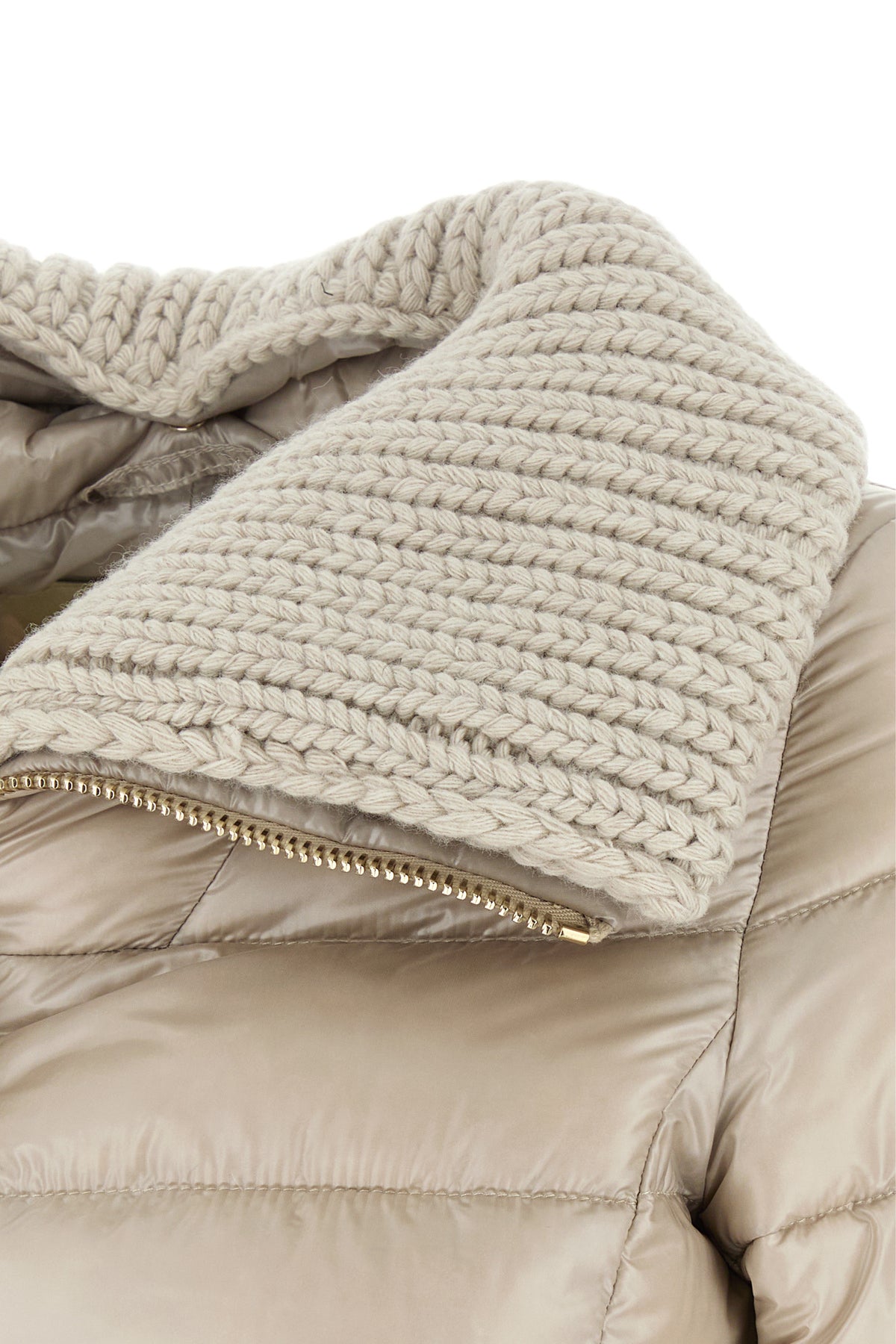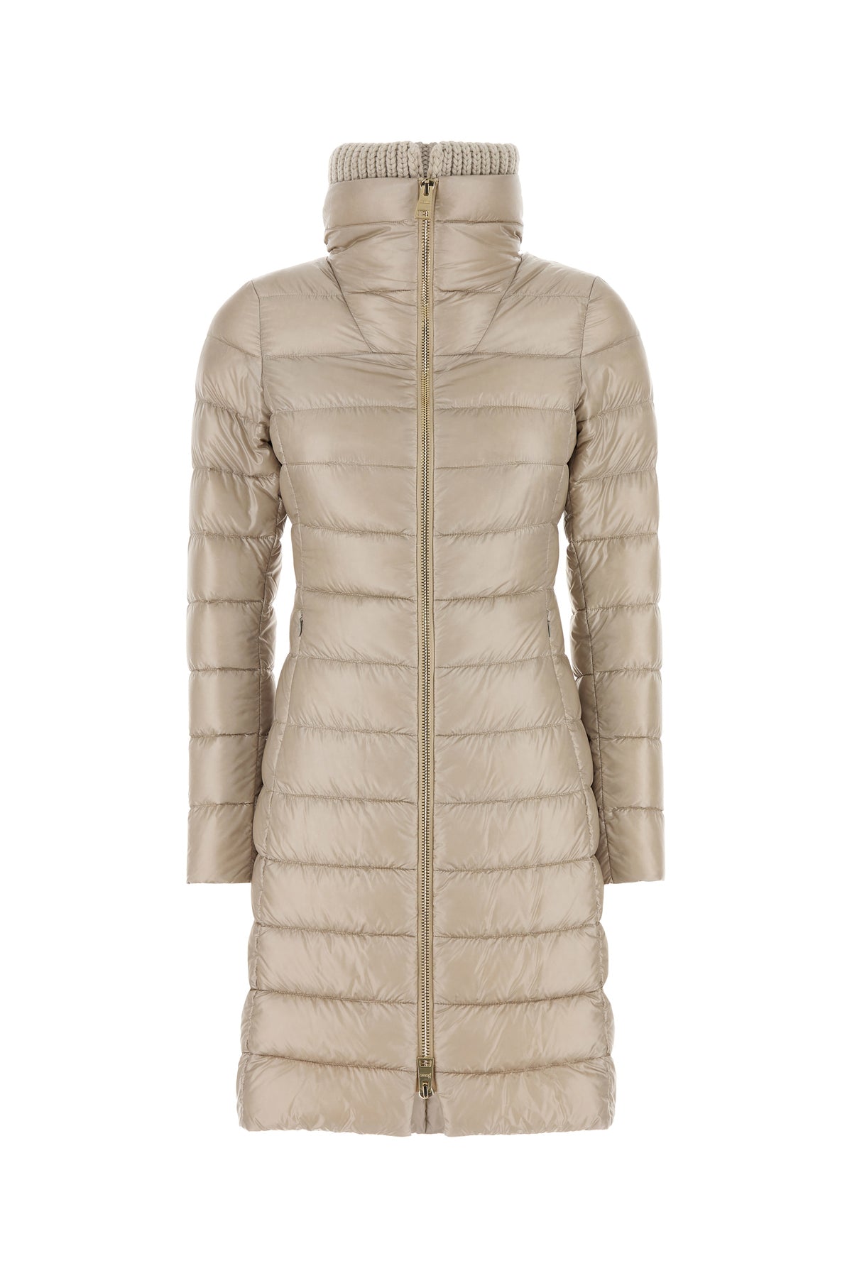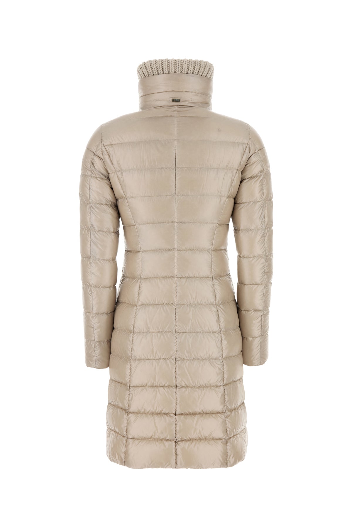 Long-cut down jacket realized in quilted nylon enriched by metal logoed plate at the back.