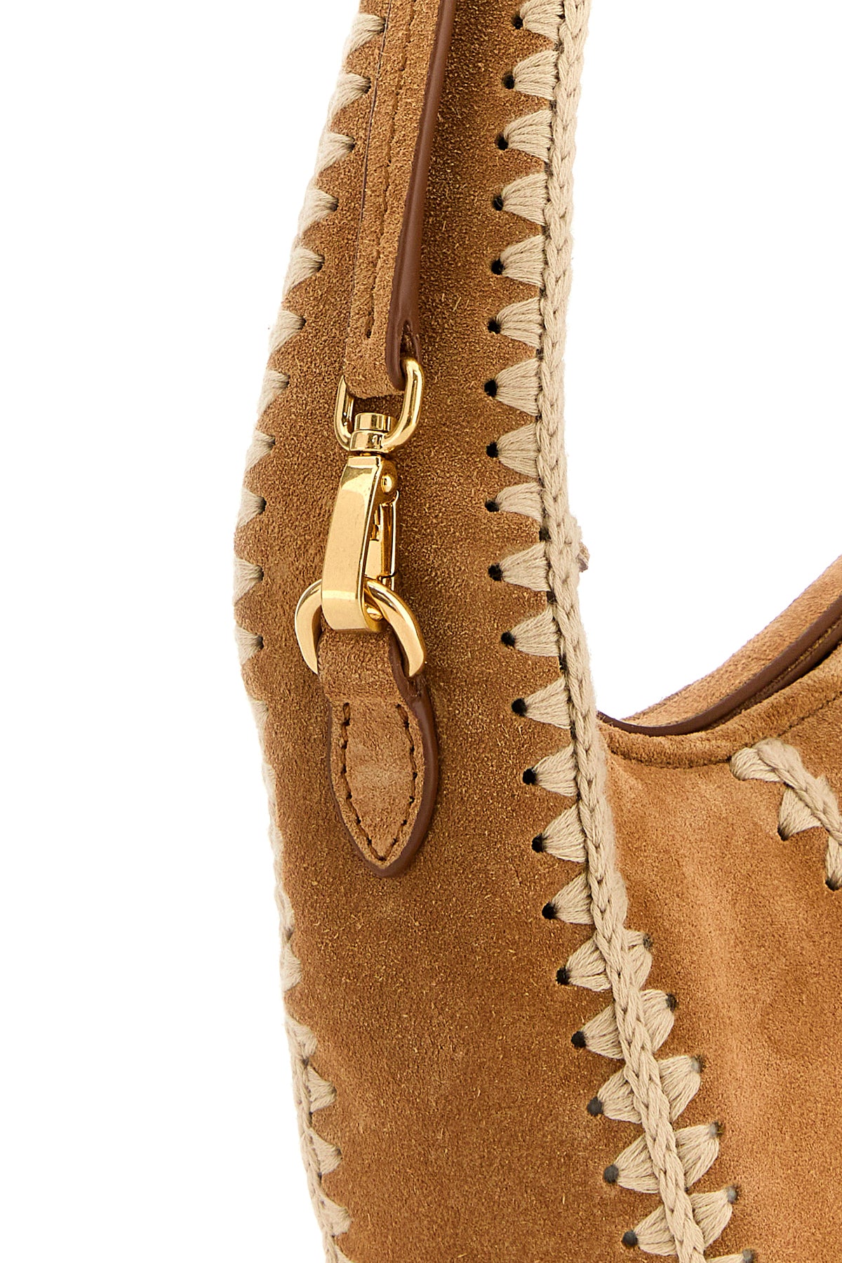 Handbag realized in suede enriched by tonal logoed patch at the front.
