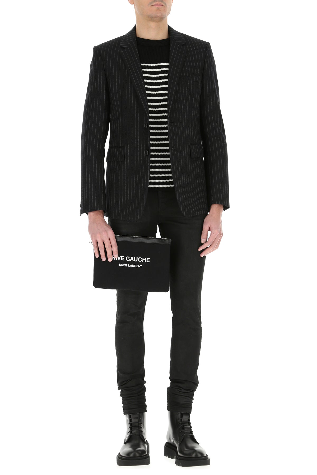 Clutch realized in pure cotton canvas with tonal leather insert characterized by contrasting Rive Gauche print at the front.