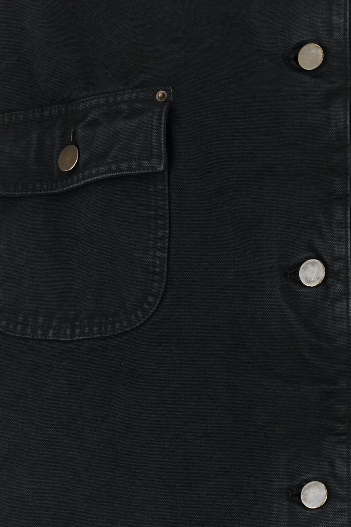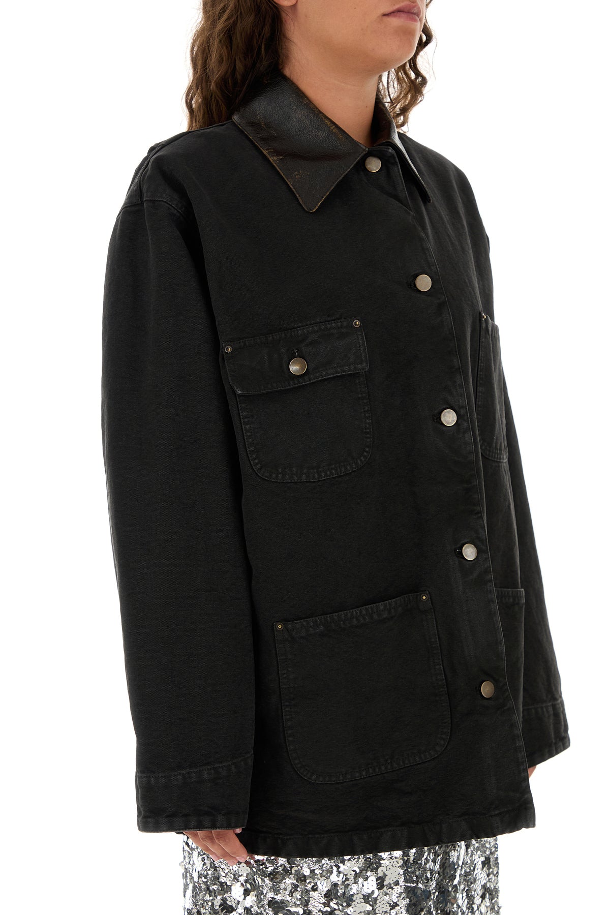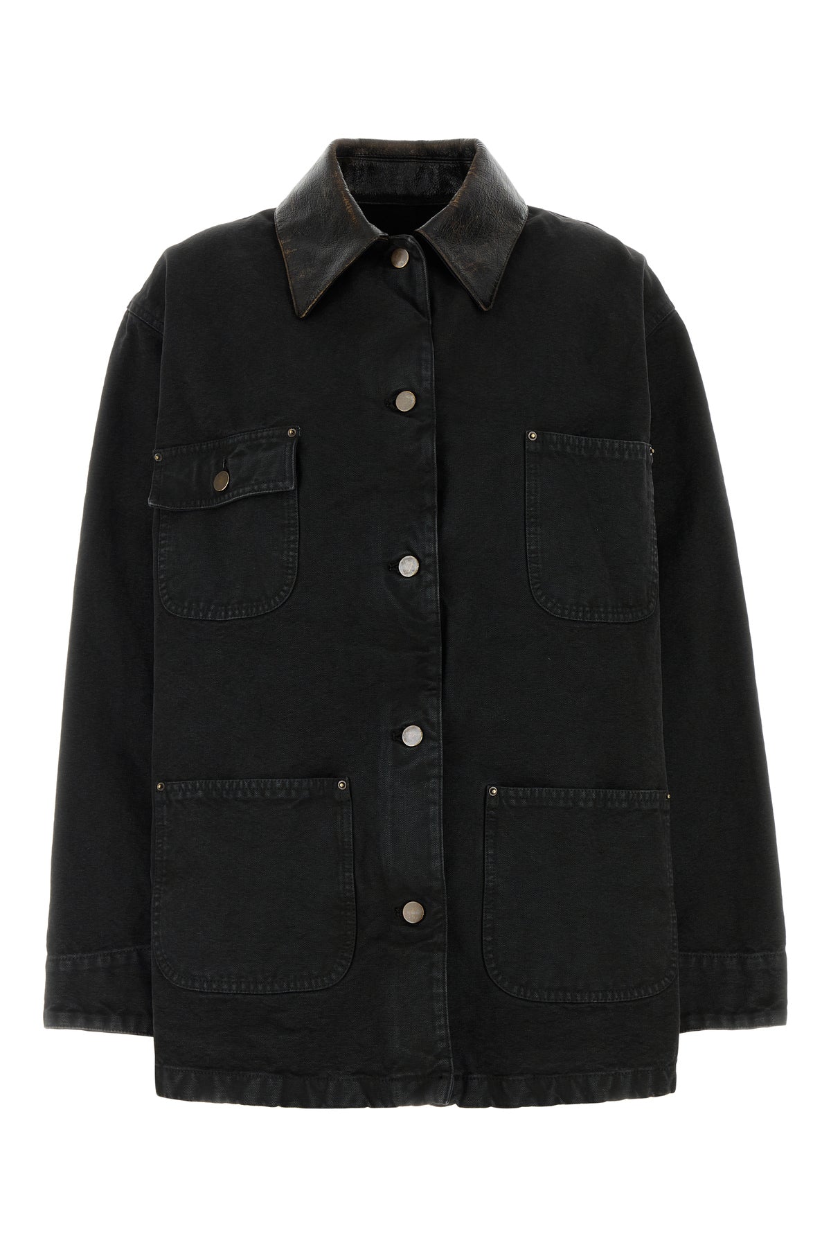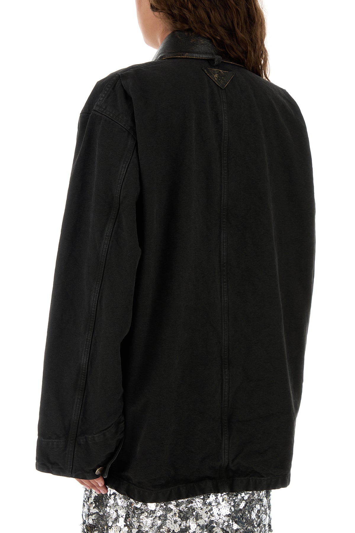 Jacket realized in stonewashed pure cotton denim enriched by leather iconic logoed triangle at the back.