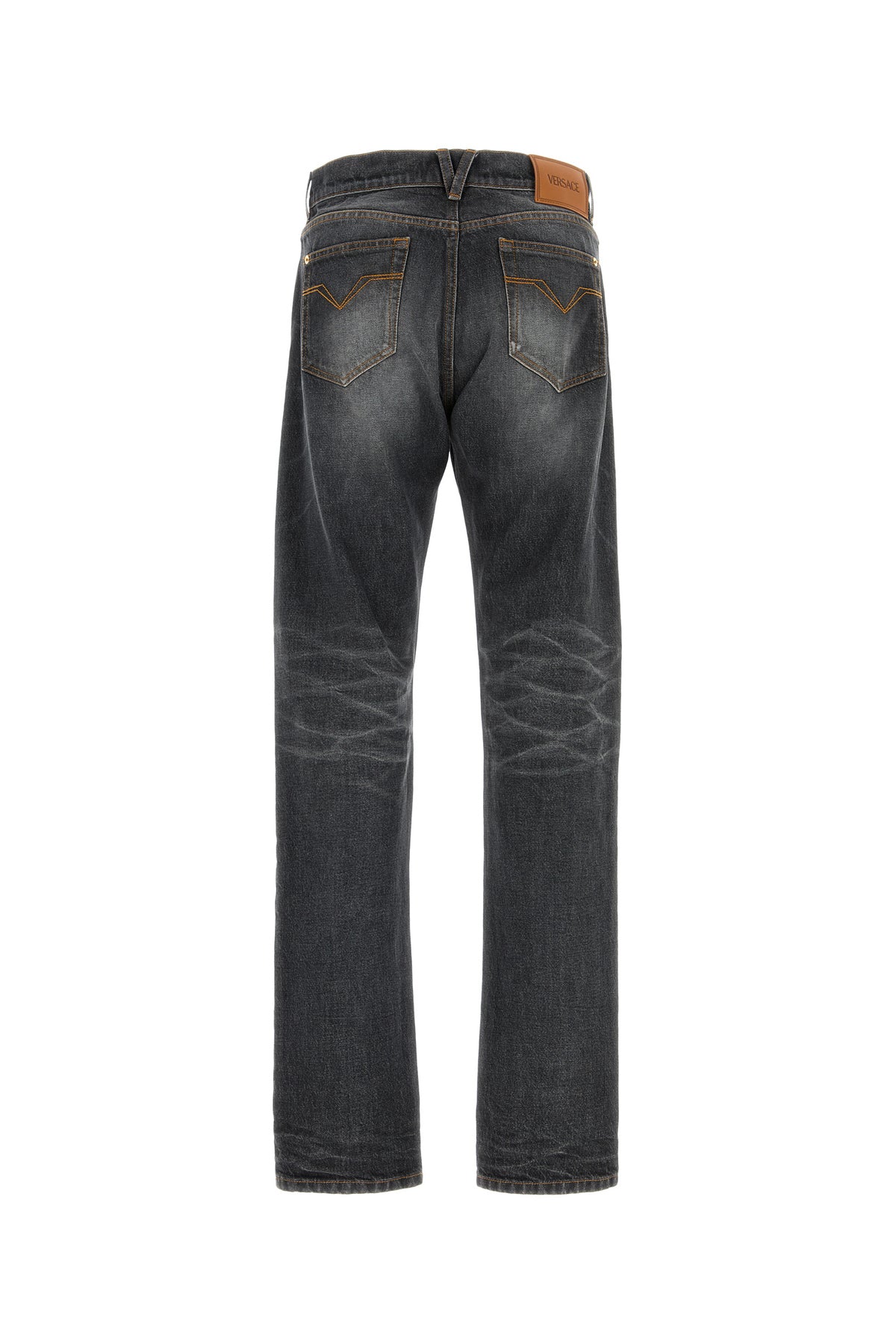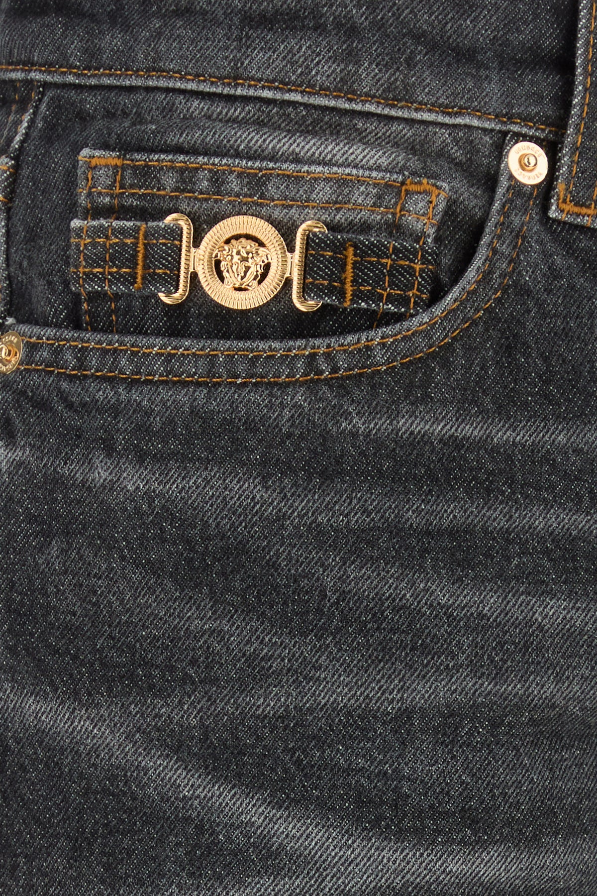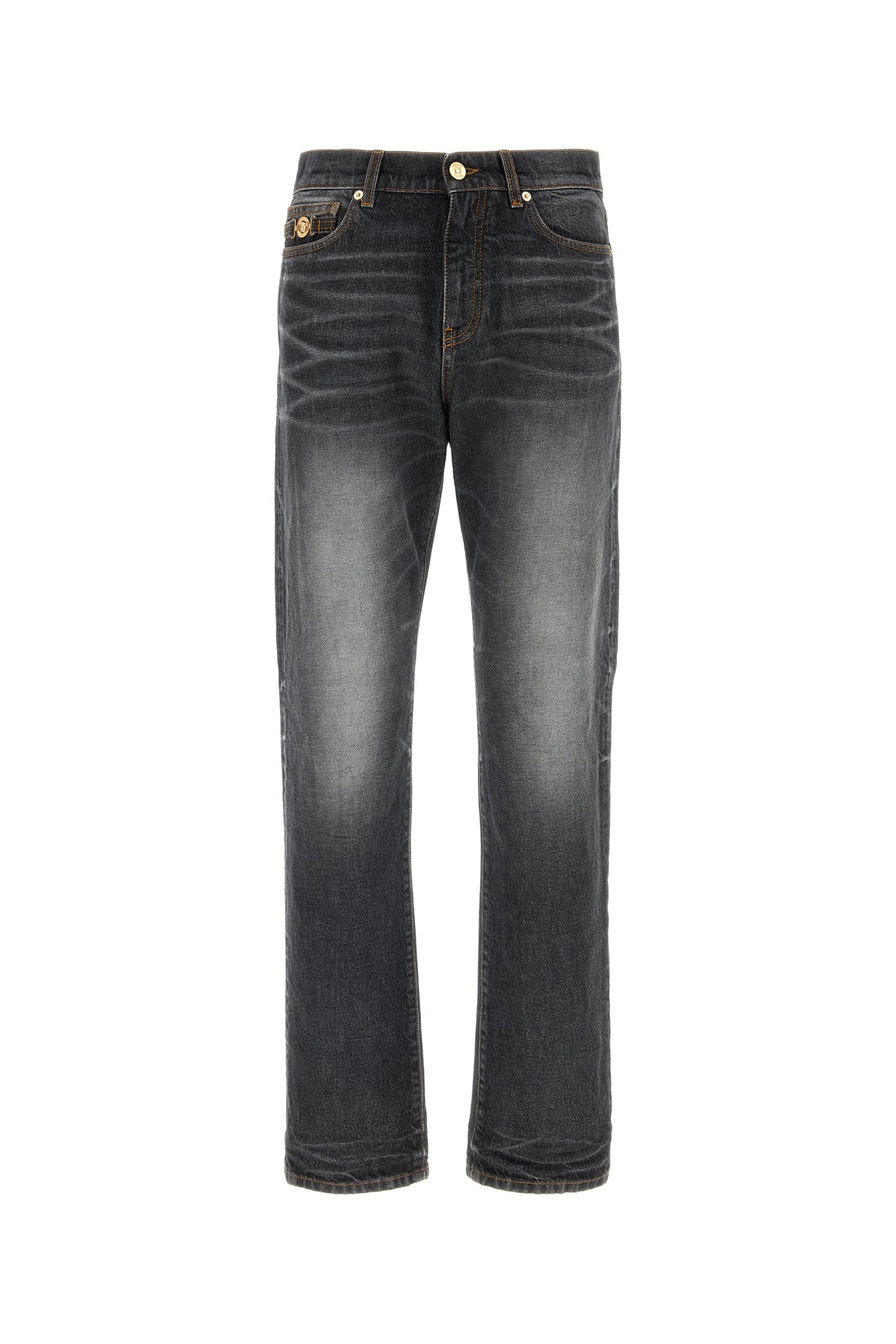 Jeans realized in stonewashed pure cotton denim enriched by metal Medusa Biggie detail at the front.