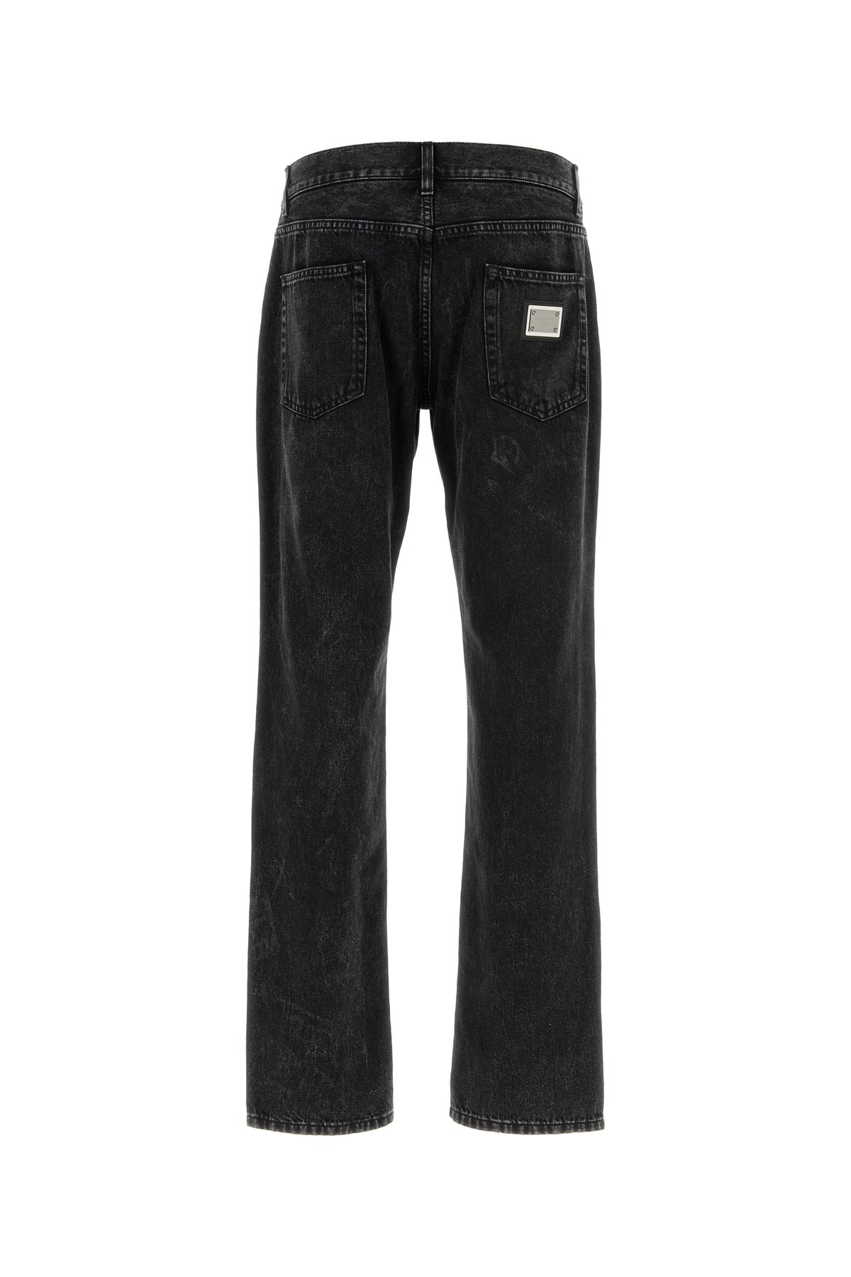 Jeans realized in pure cotton denim enriched by logoed metal plate at the back.