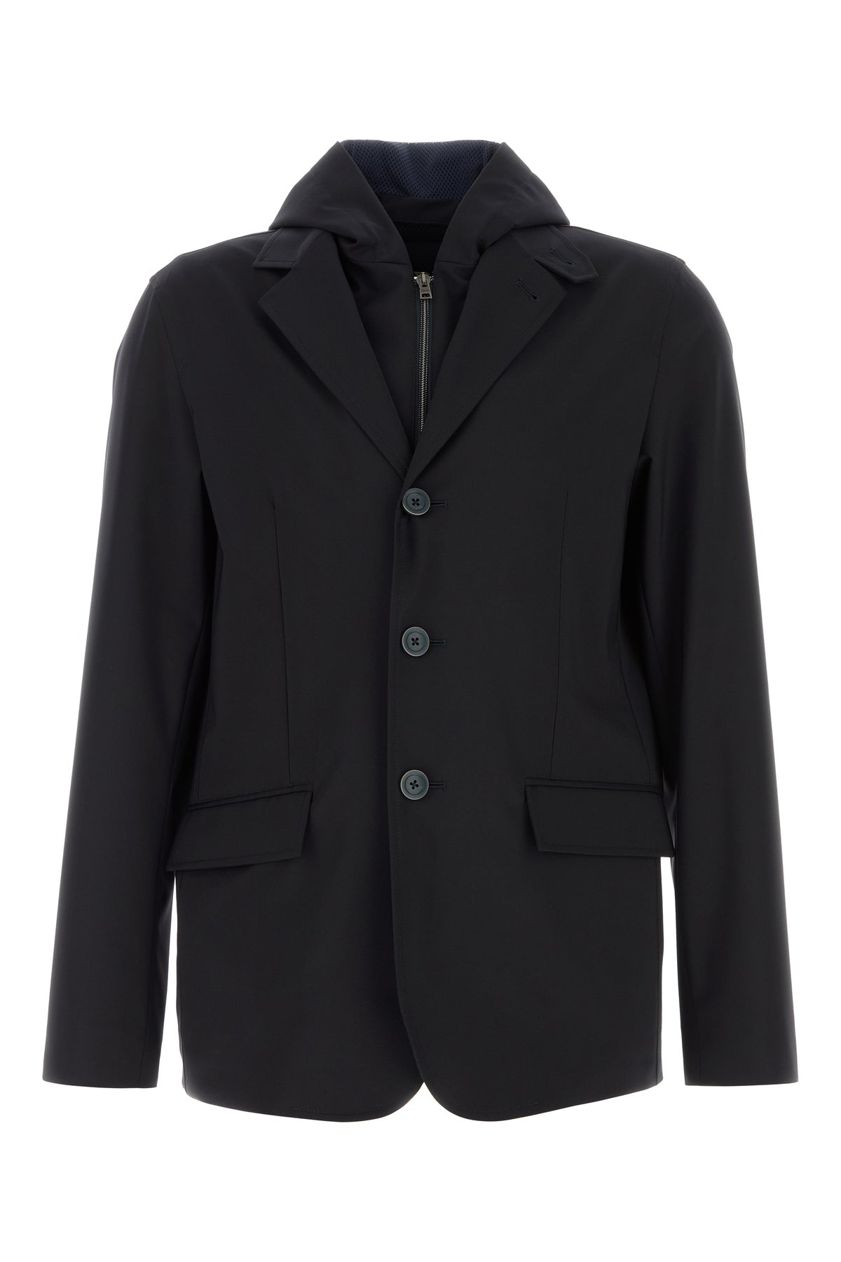 Blazer realized in stretch jersey enriched by metal logoed plate on the hood.