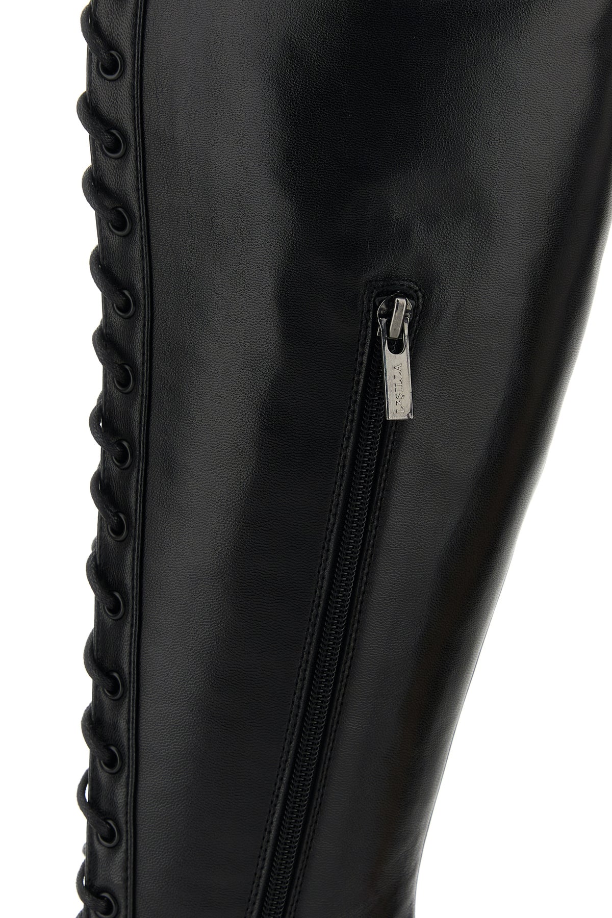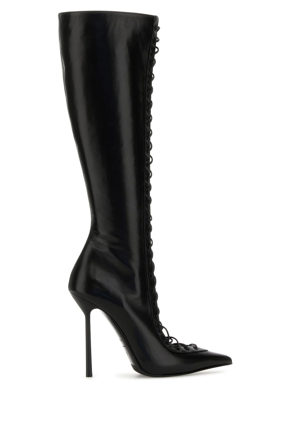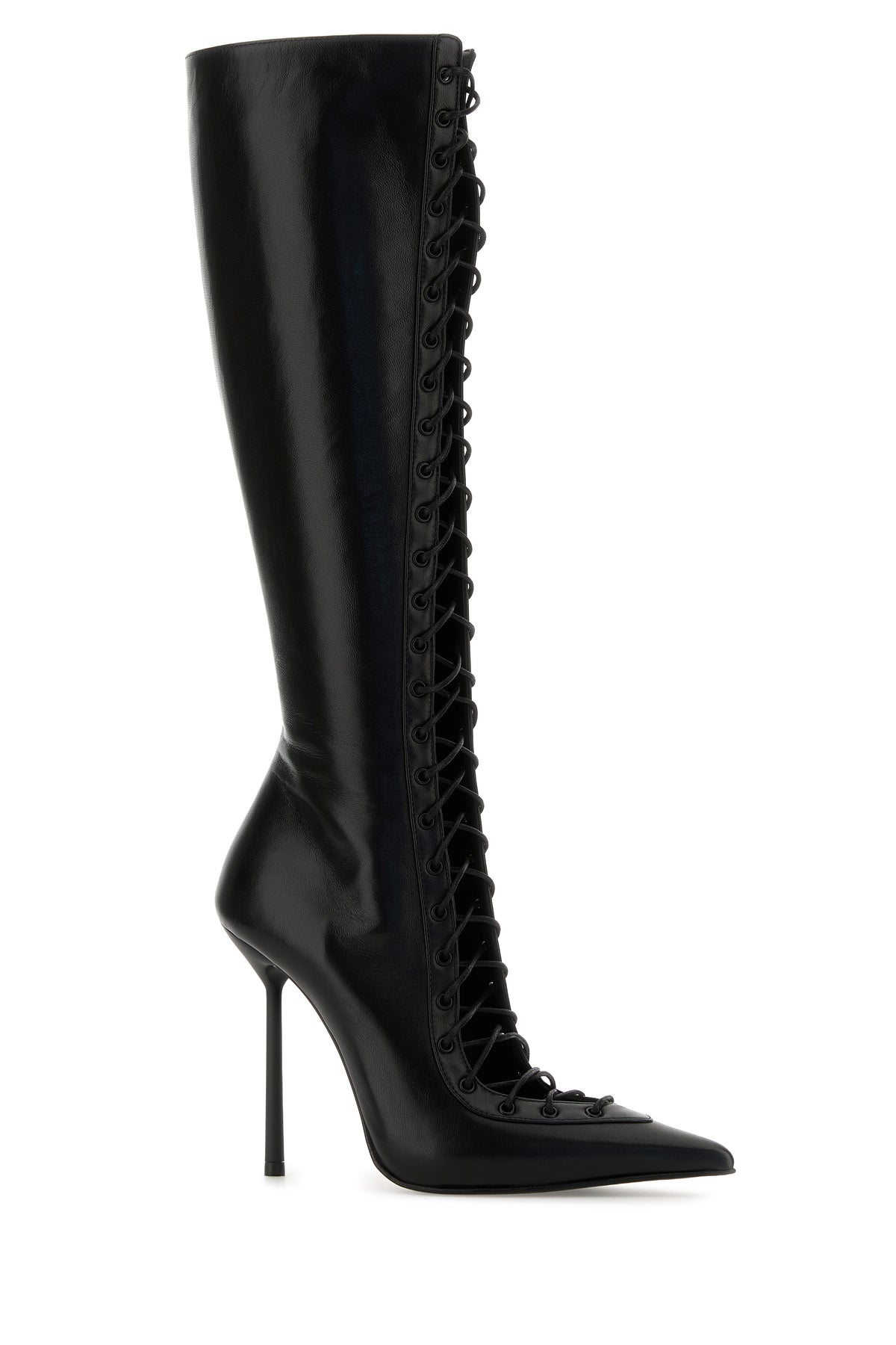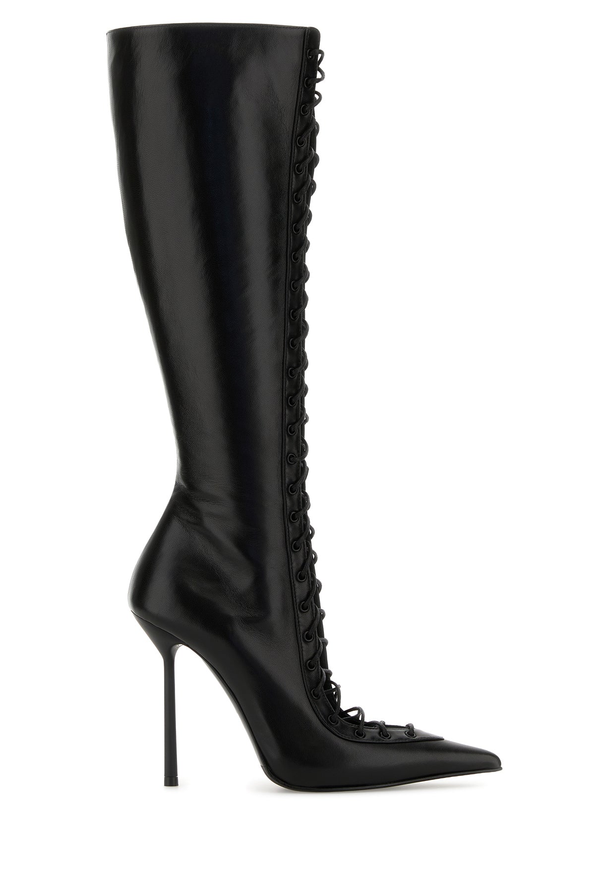 Boots realized in leather characterized by decorative lacing.