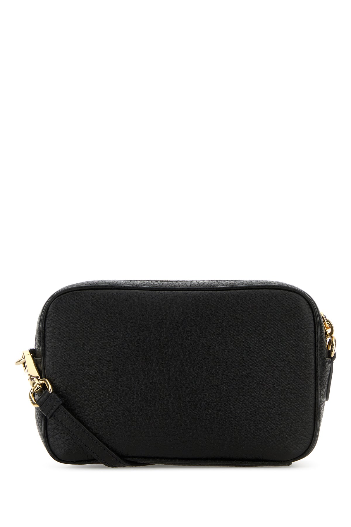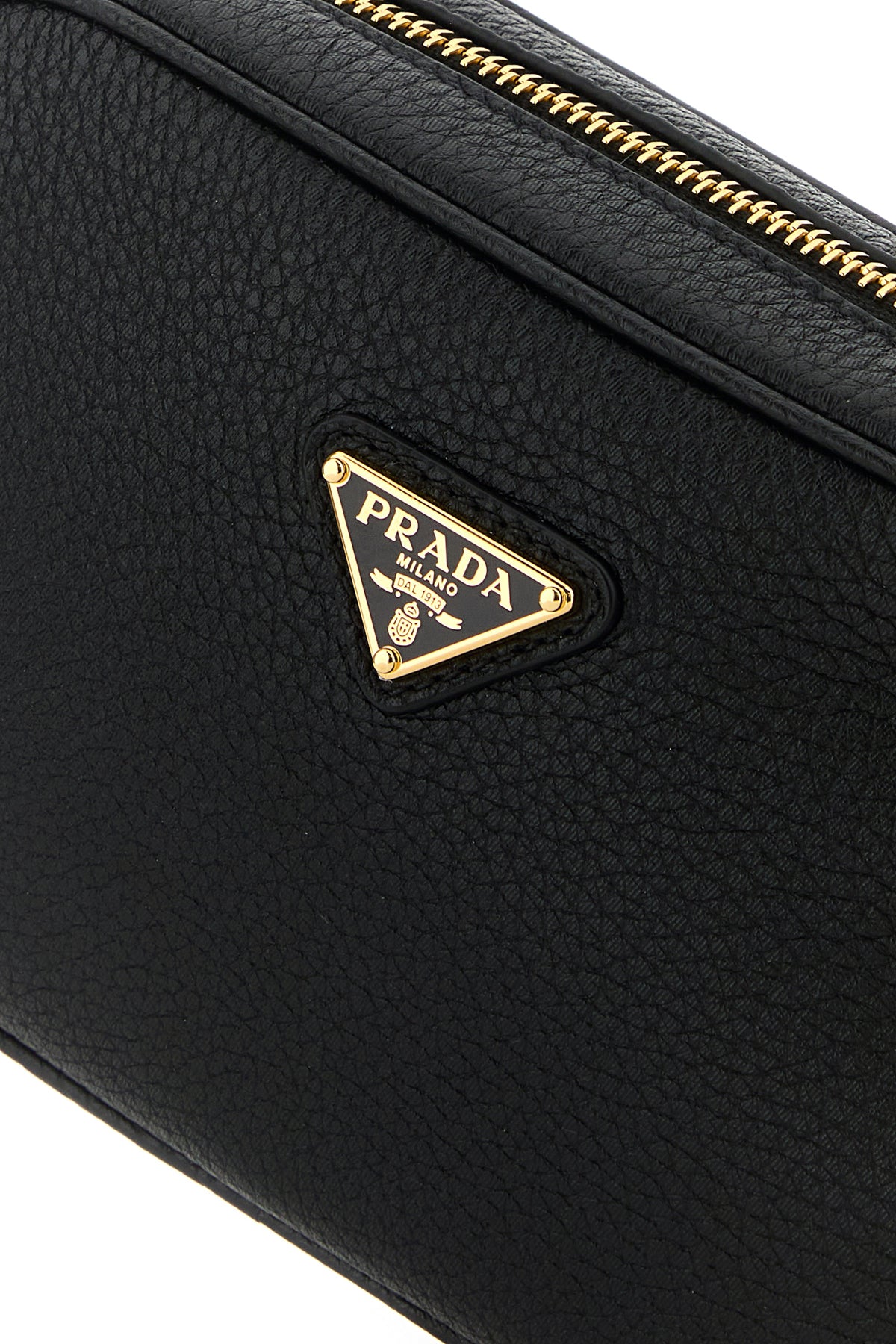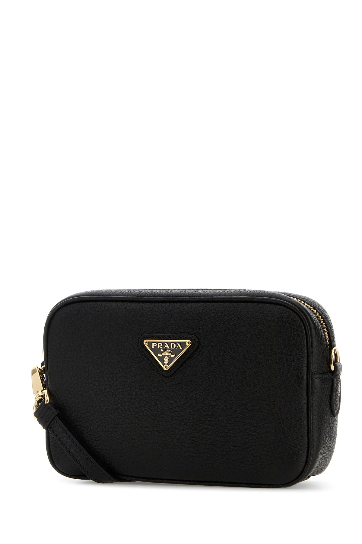 Crossbody bag realized in pebble leather enriched by iconic logoed metal triangle at the front.