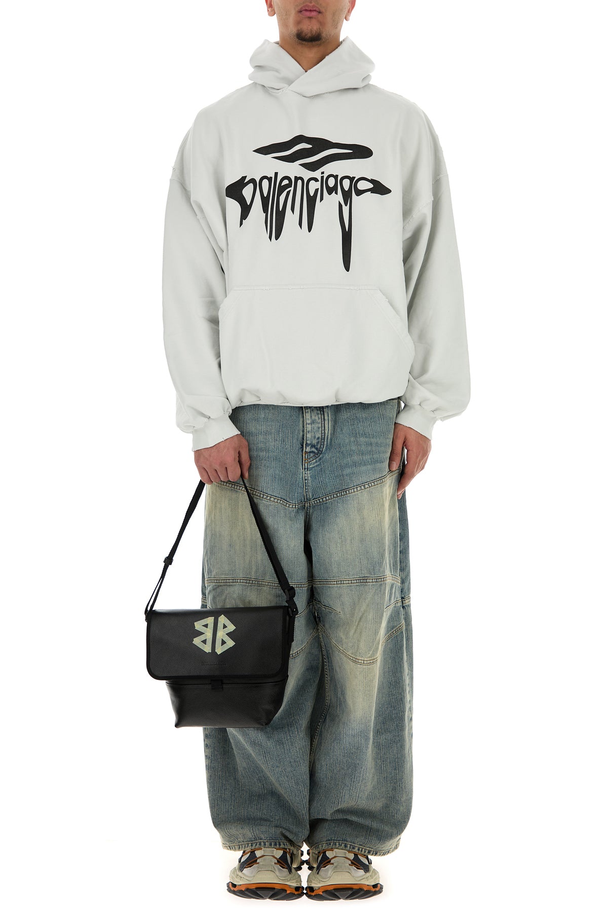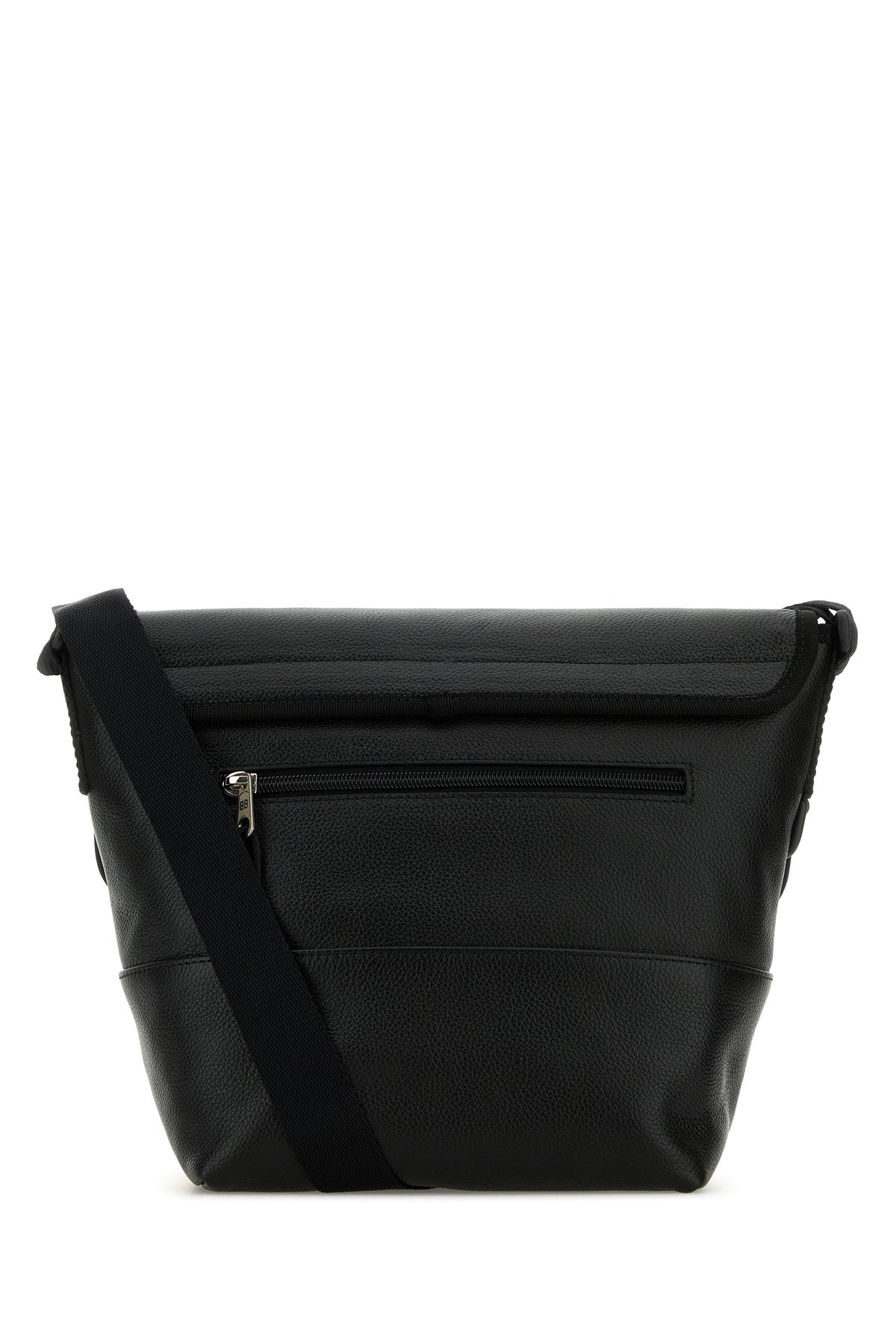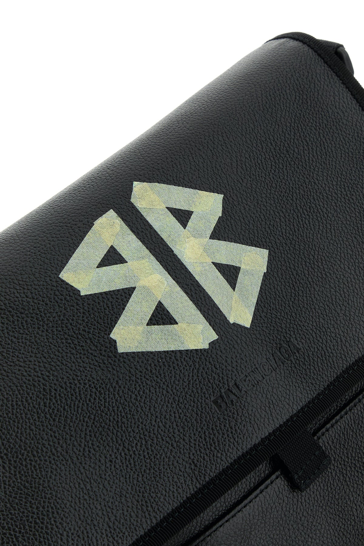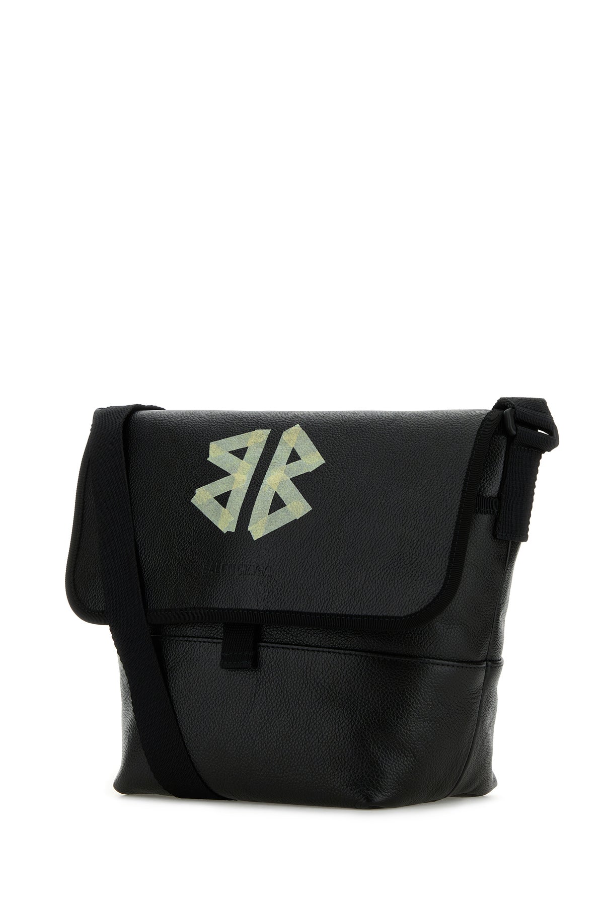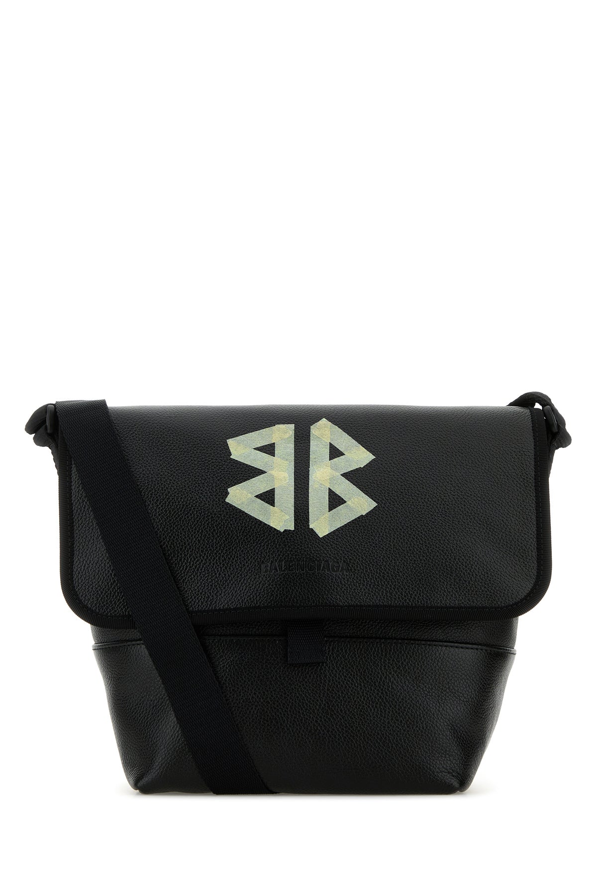 Crossbody bag realized in pebble leather characterized by contrasting printed logo and embossed logo at the front.
