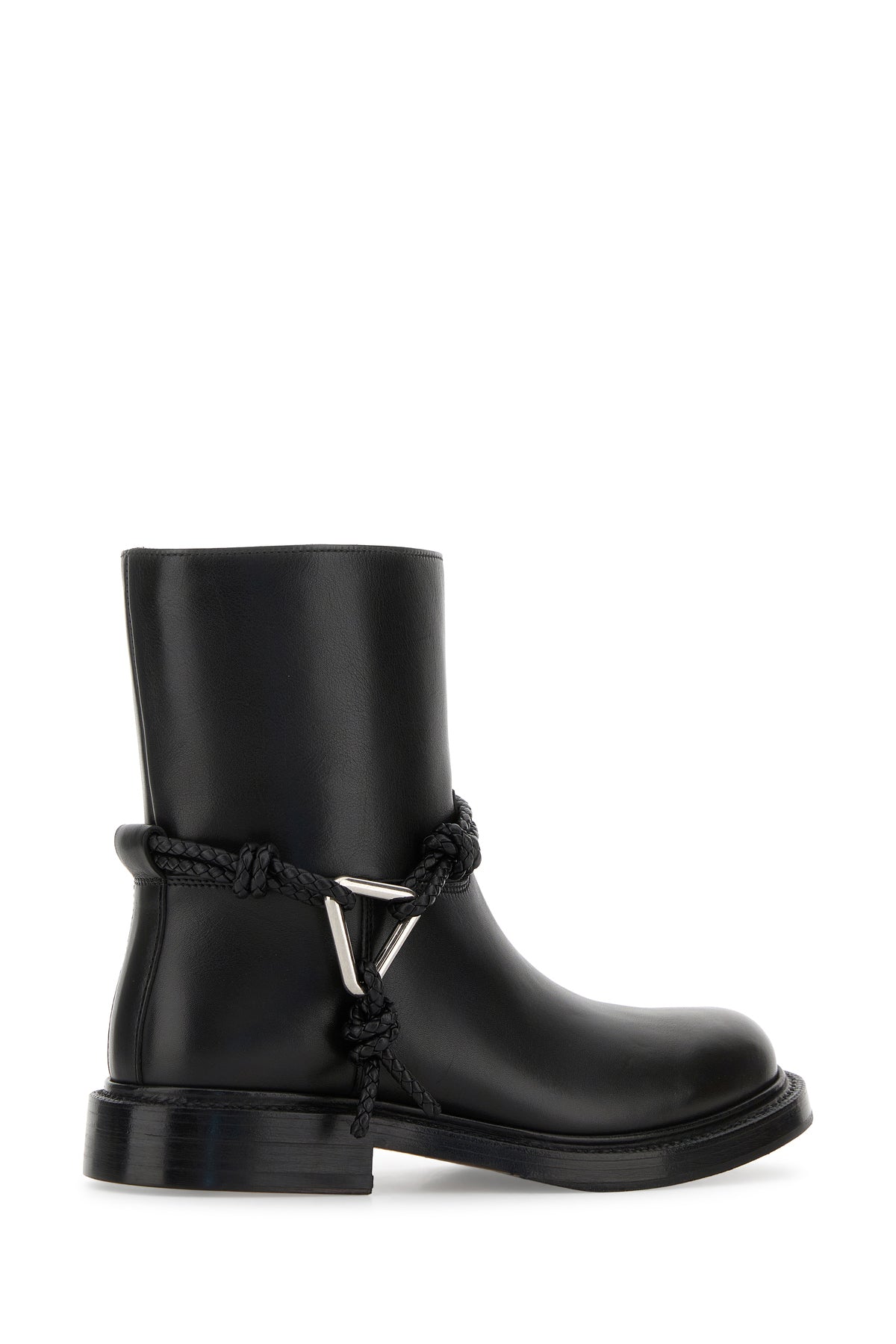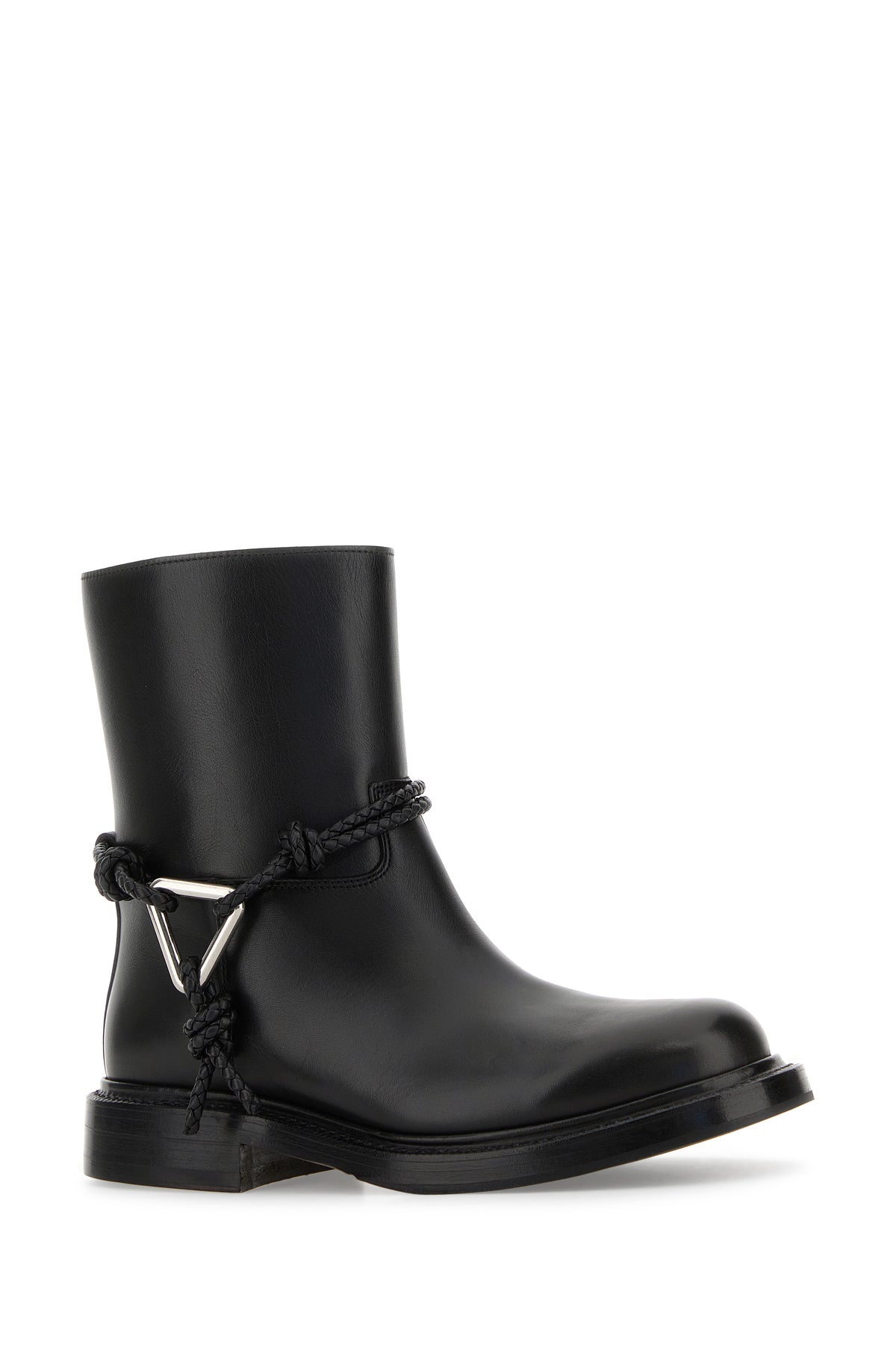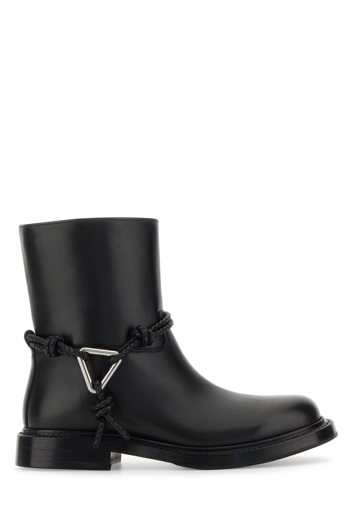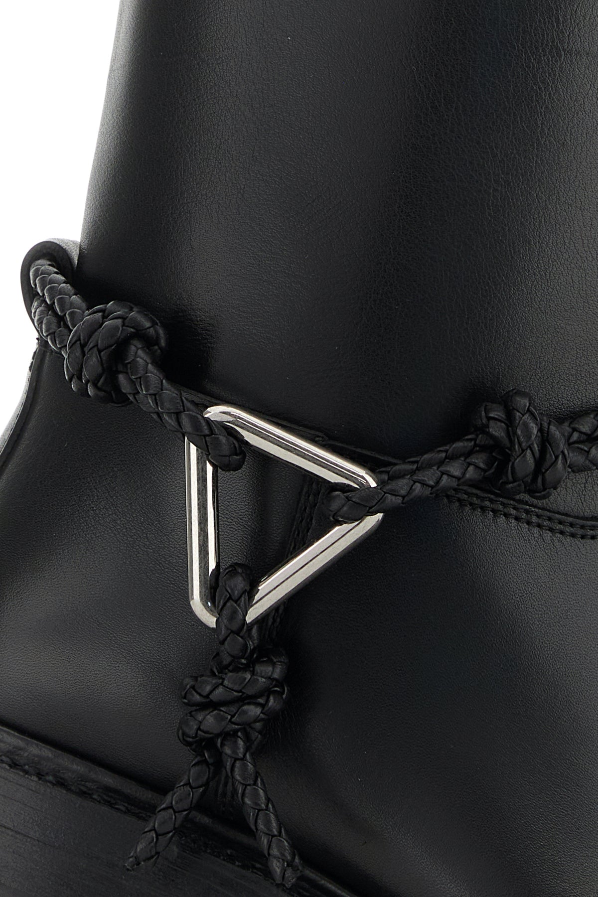 Ankle boots realized in smooth calf leather enriched by straps with iconic Intrecciato motif and metal triangle.