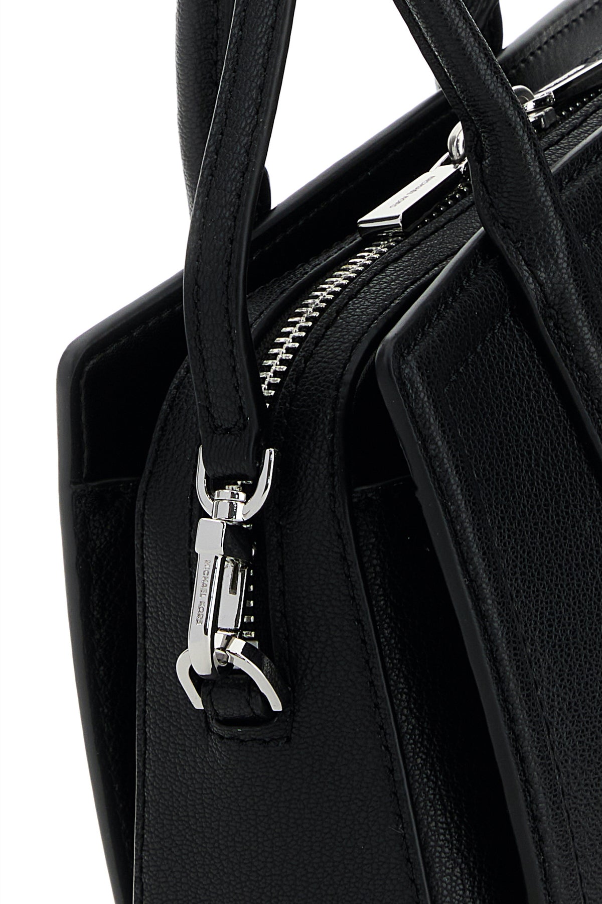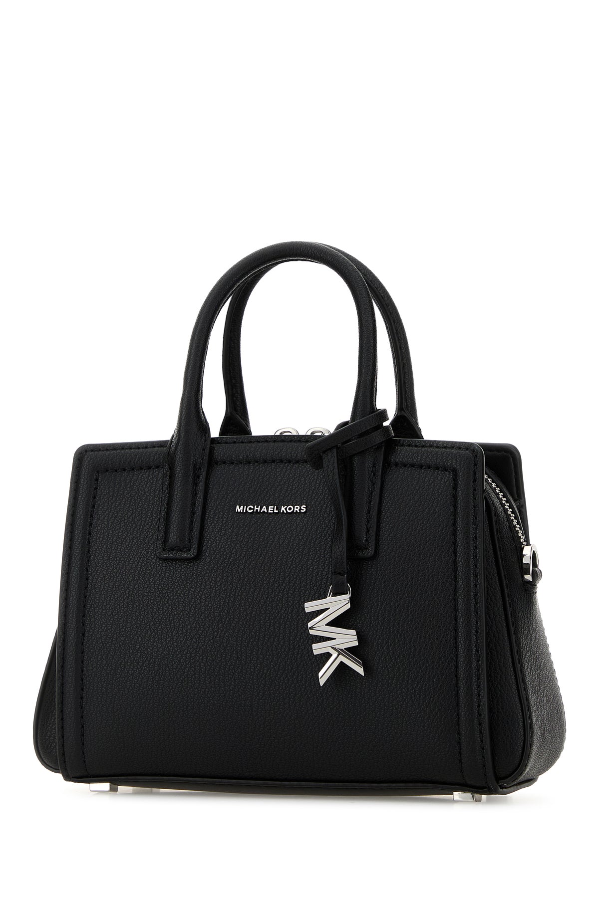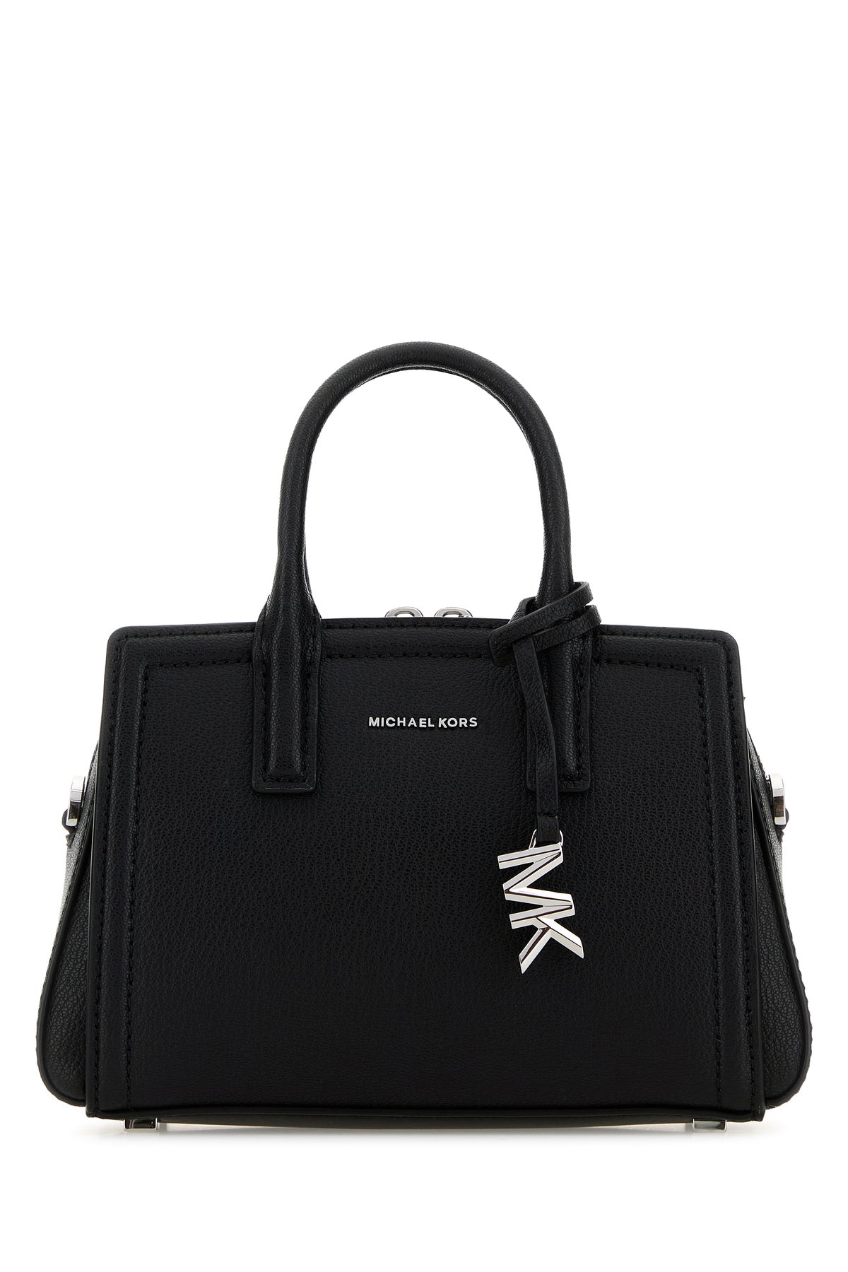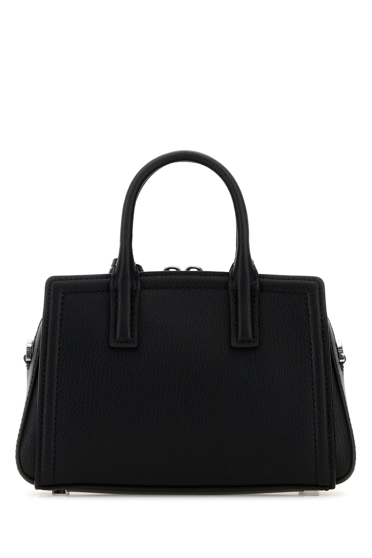 Handbag realized in grained leather enriched by metal lettering logo at the front.