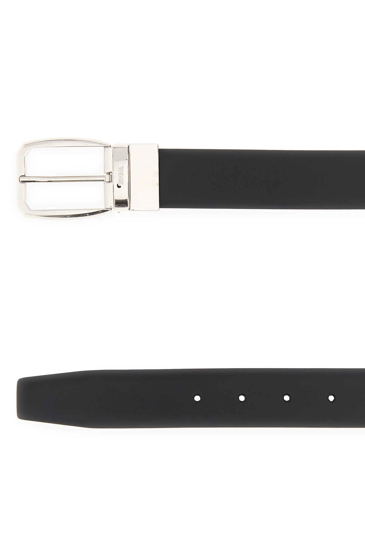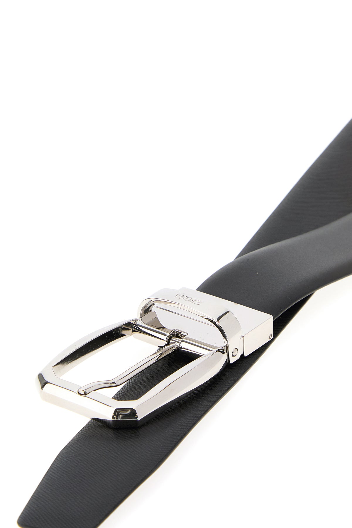 Reversible belt realized in leather characterized by embossed logo on the buckle.