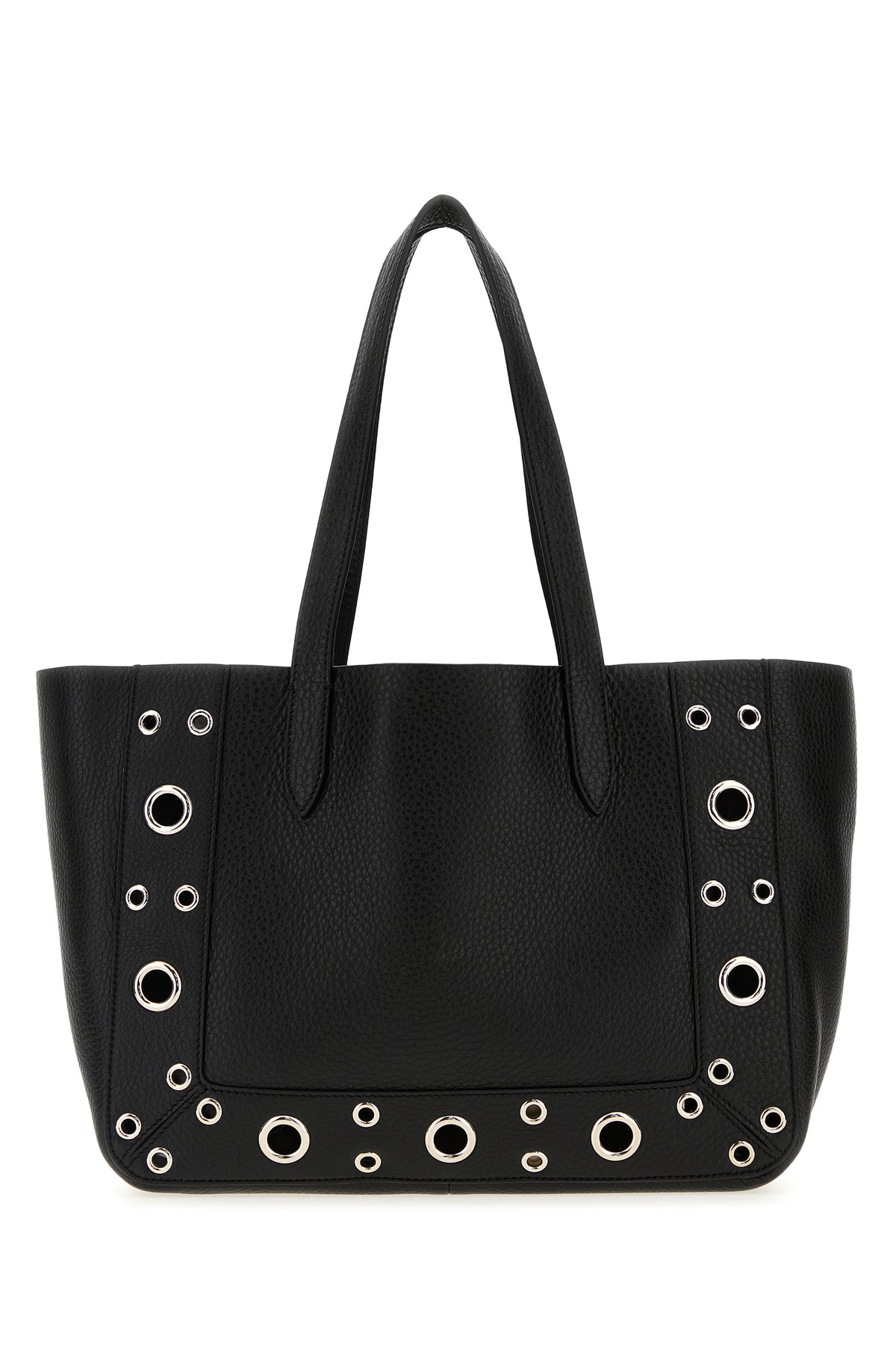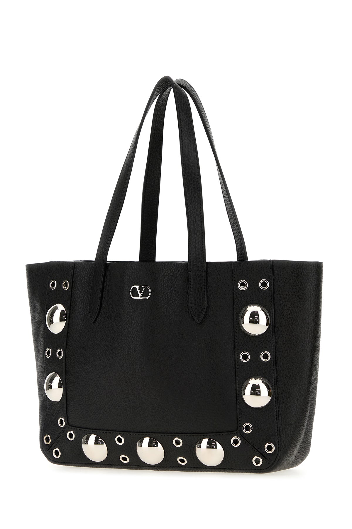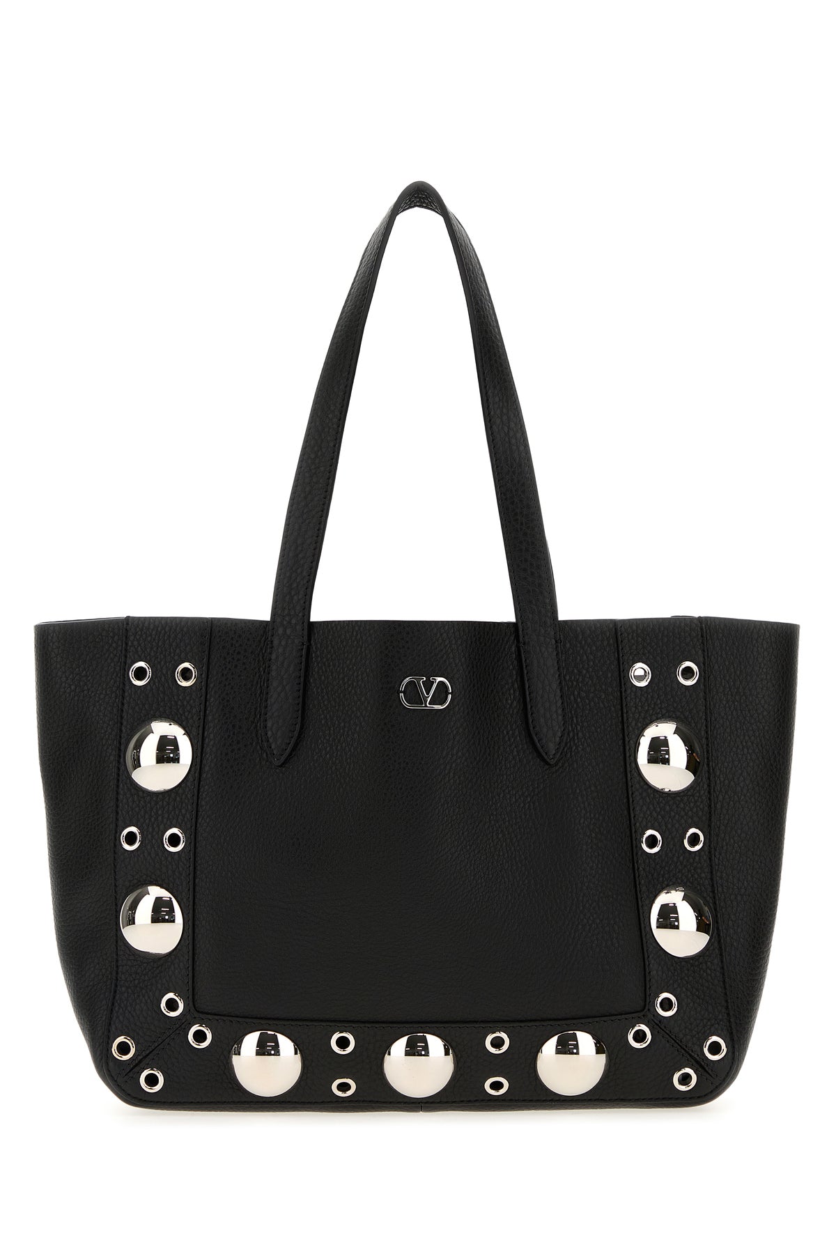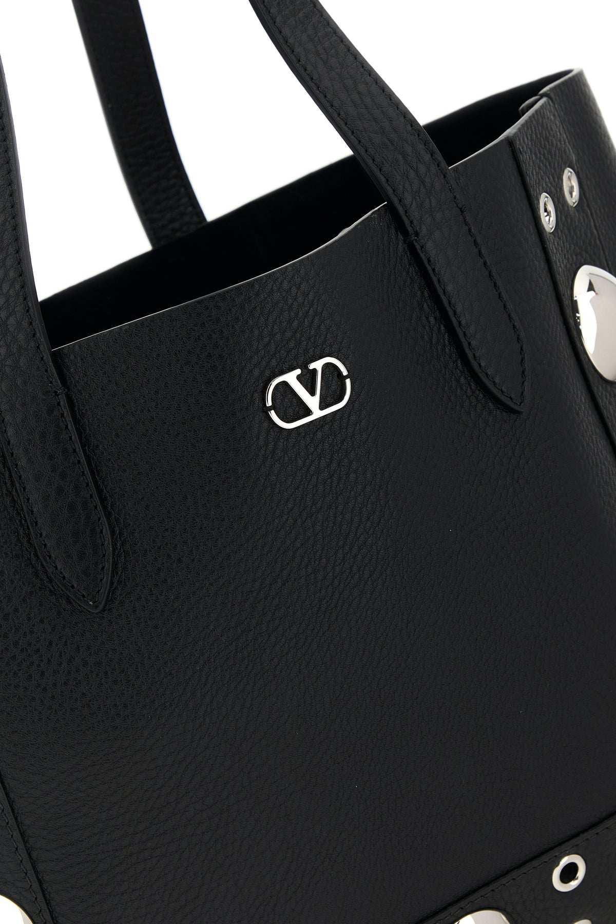 Shopping bag realized in pebble leather enriched by VLogo Signature metal detail at the front and metal studs on the trimmings.