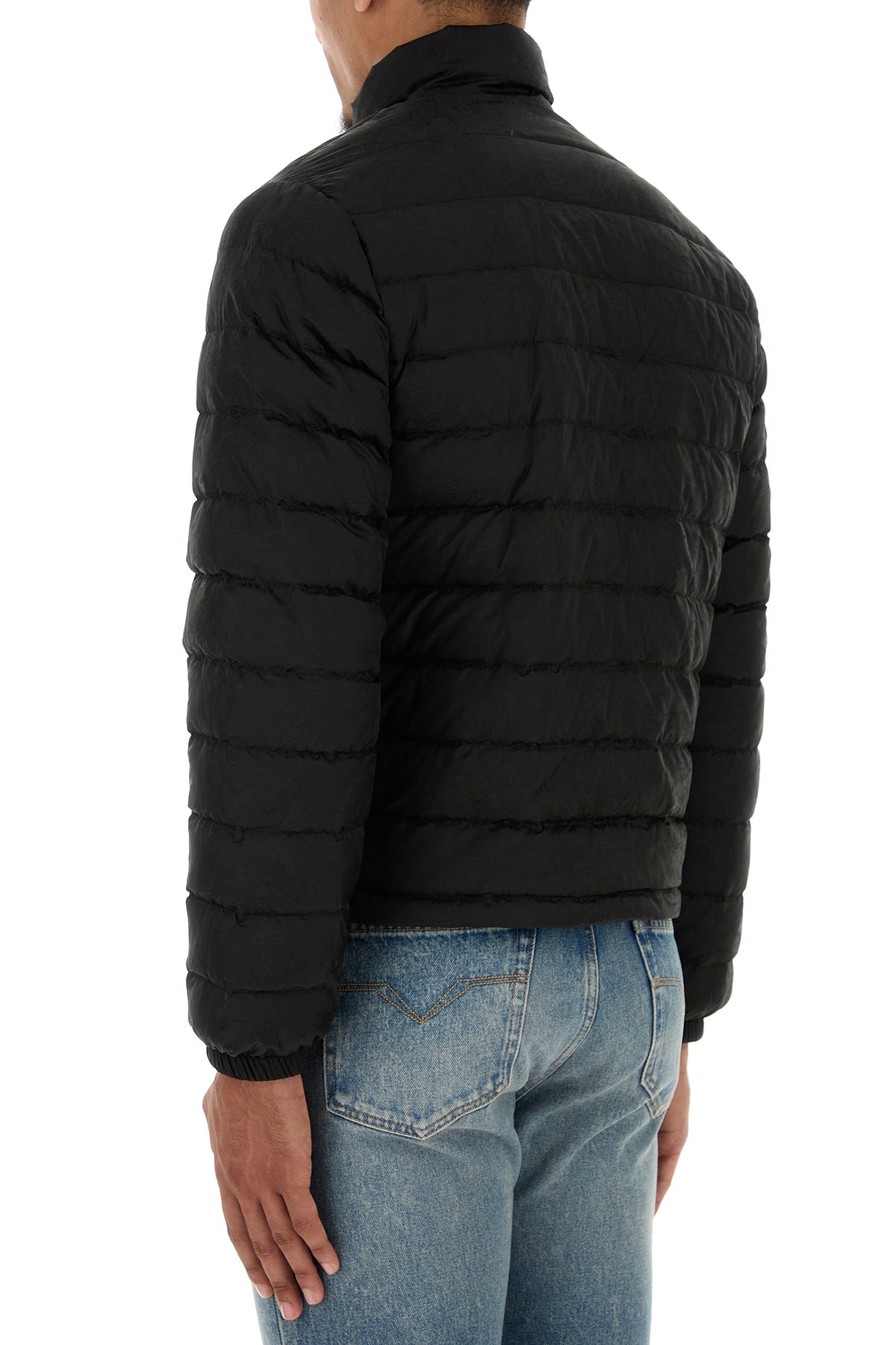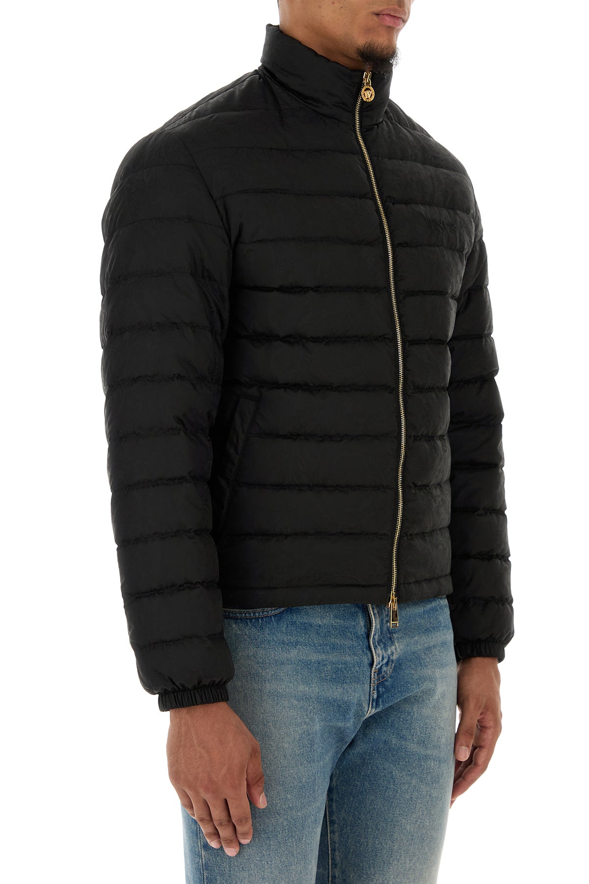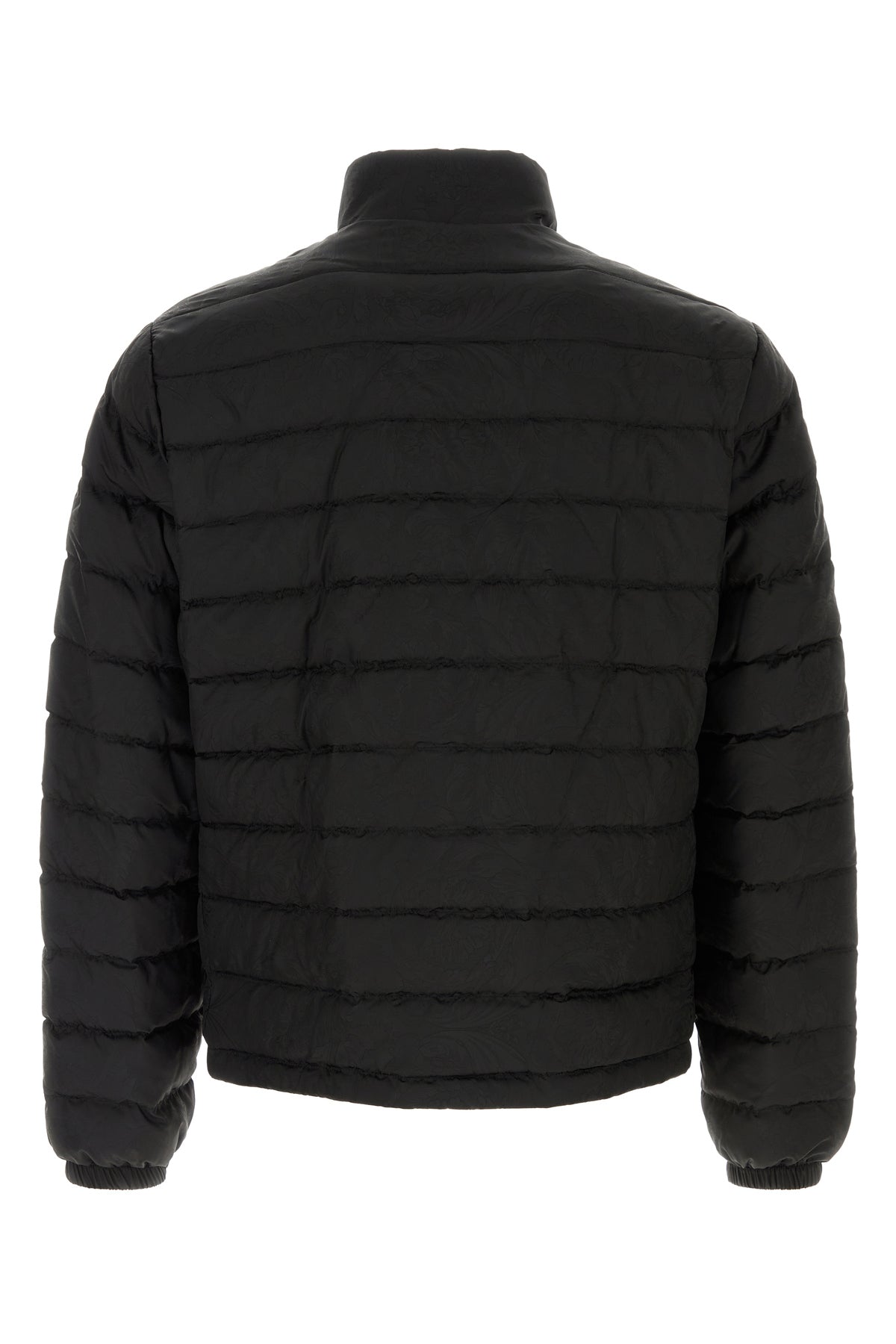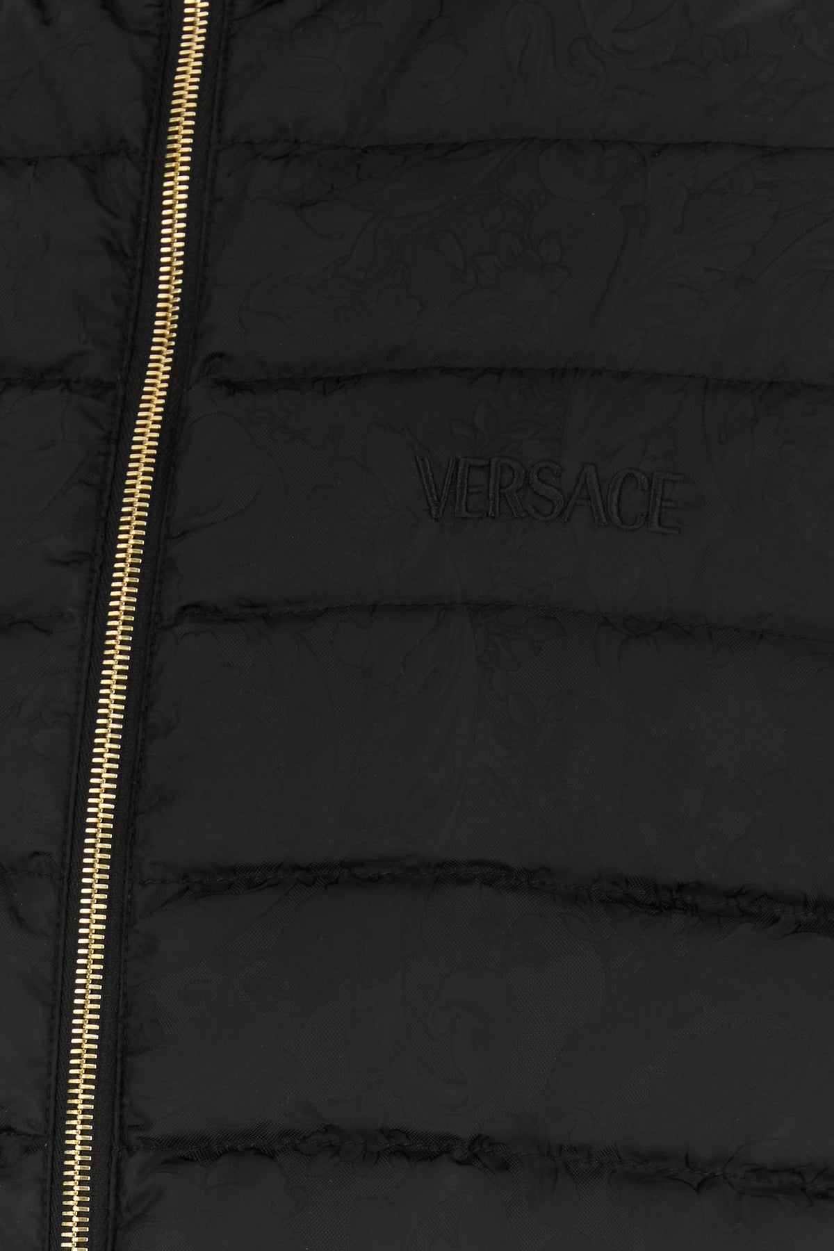 Down jacket realized in quilted nylon characterized by tonal Barocco embroidery on the entire surface and tonal embroidered logo on the chest.