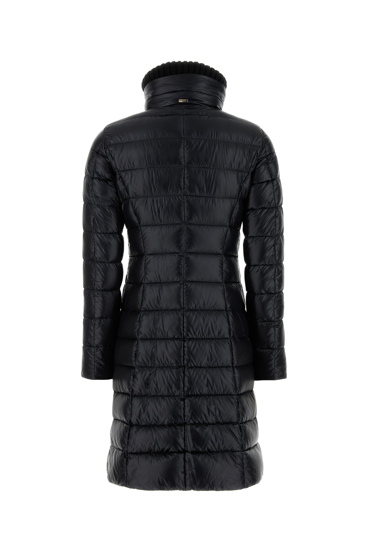 Long-cut down jacket realized in quilted nylon enriched by metal logoed plate at the back.