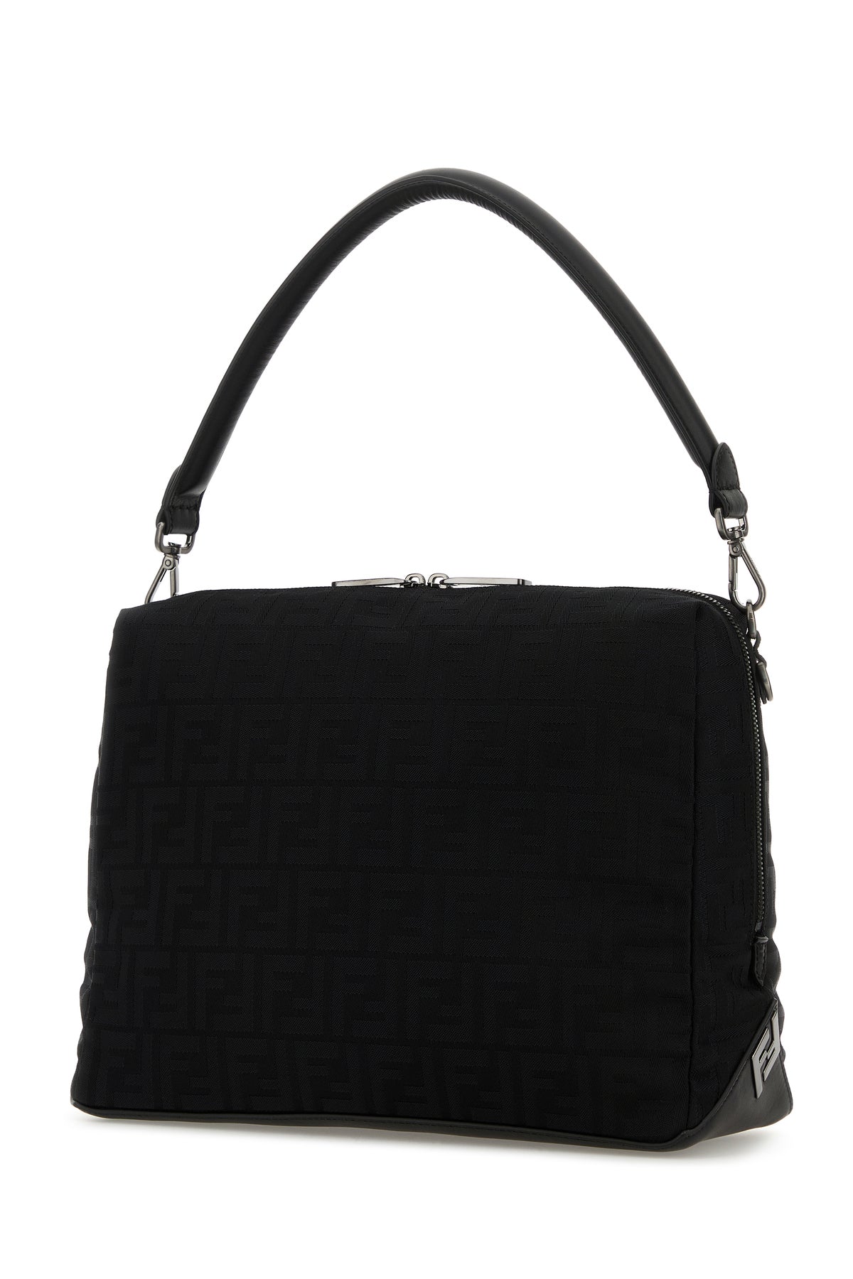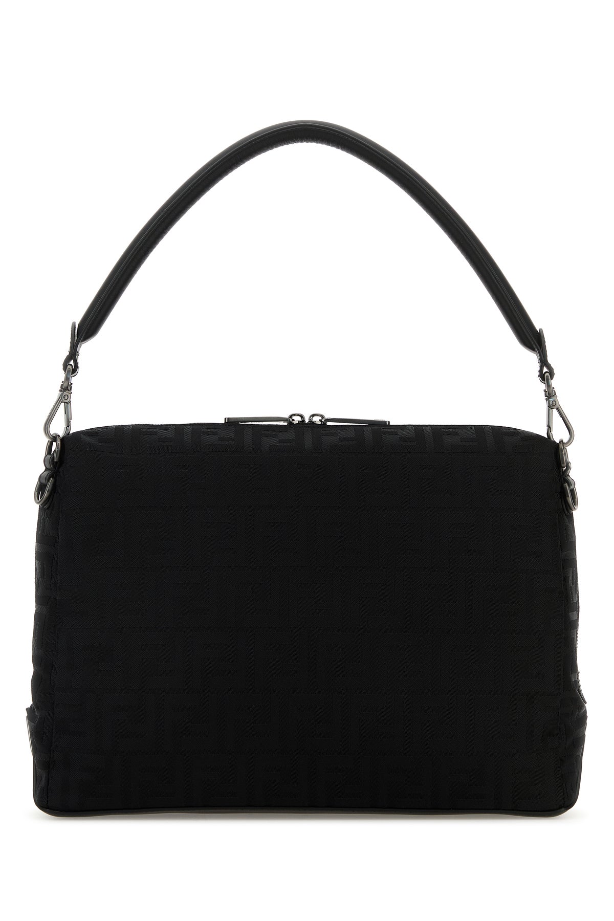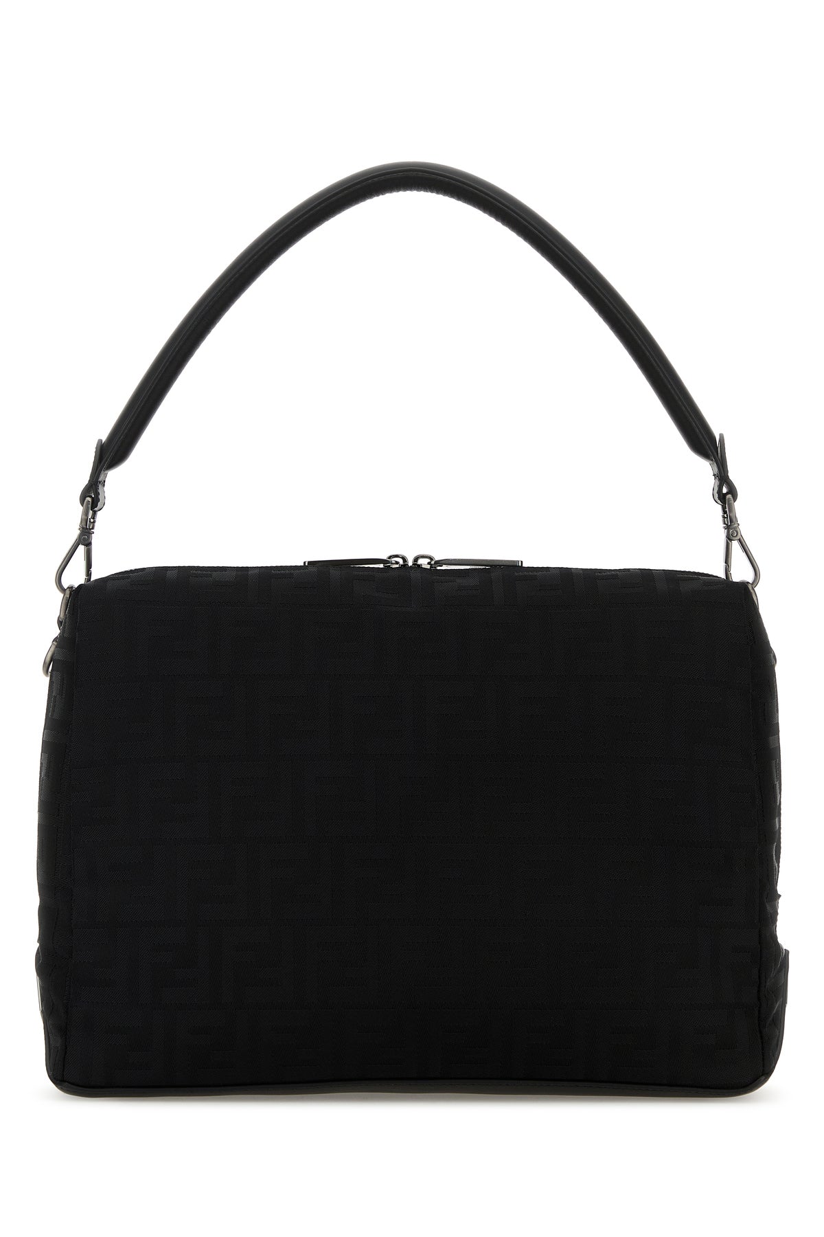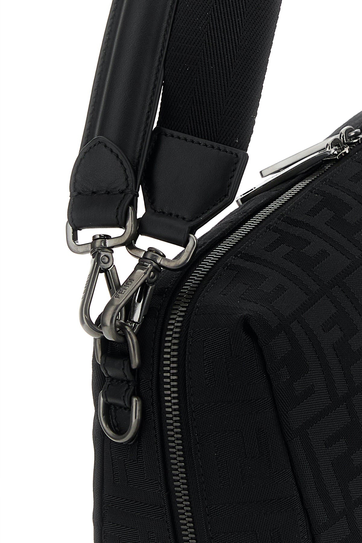 Handbag realized in nylon with smooth calf leather inserts characterized by FF motif embroidery on the entire surface enriched by metal FF detail on the side.