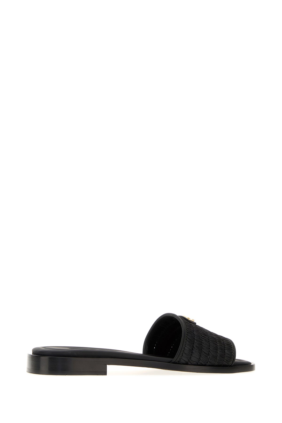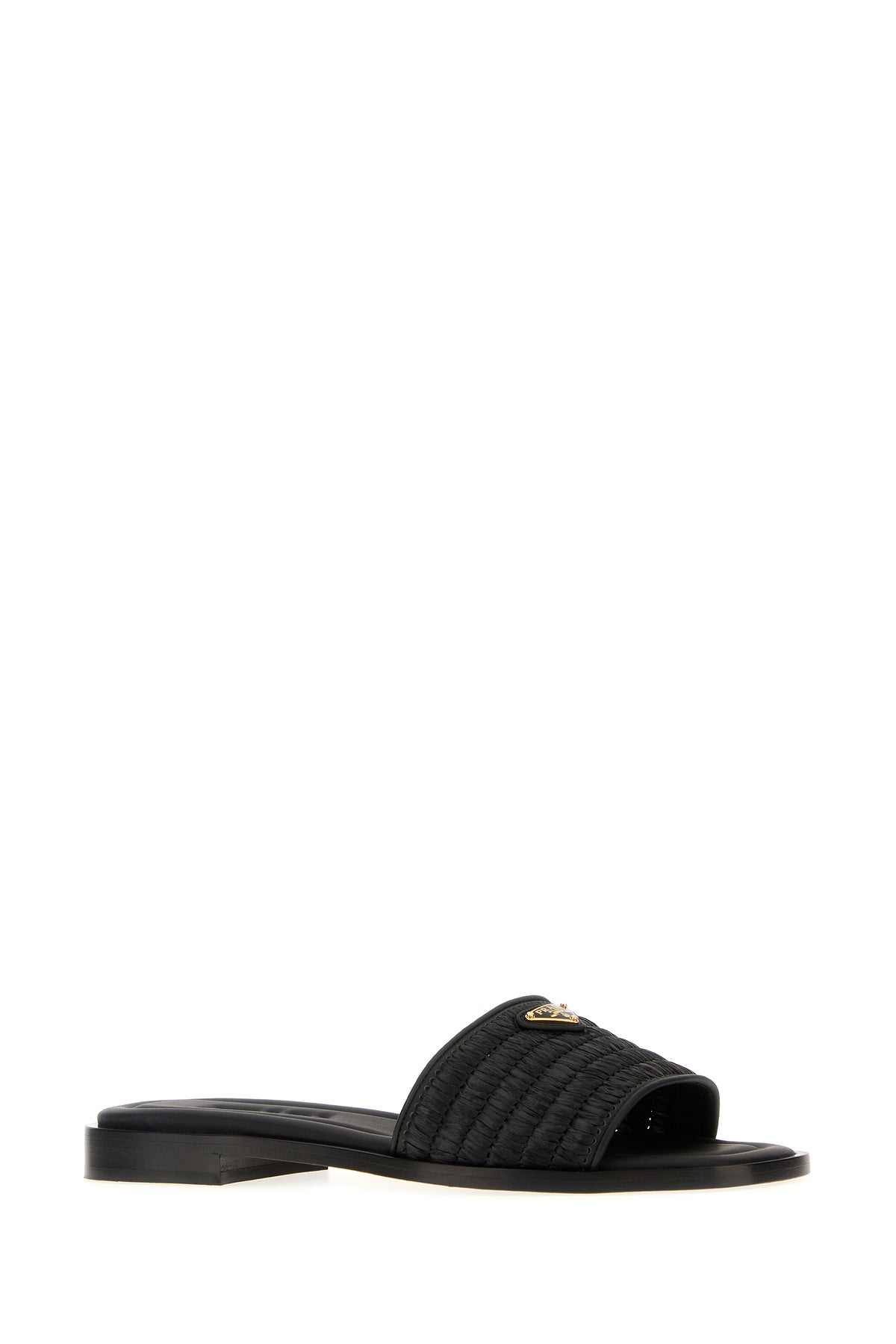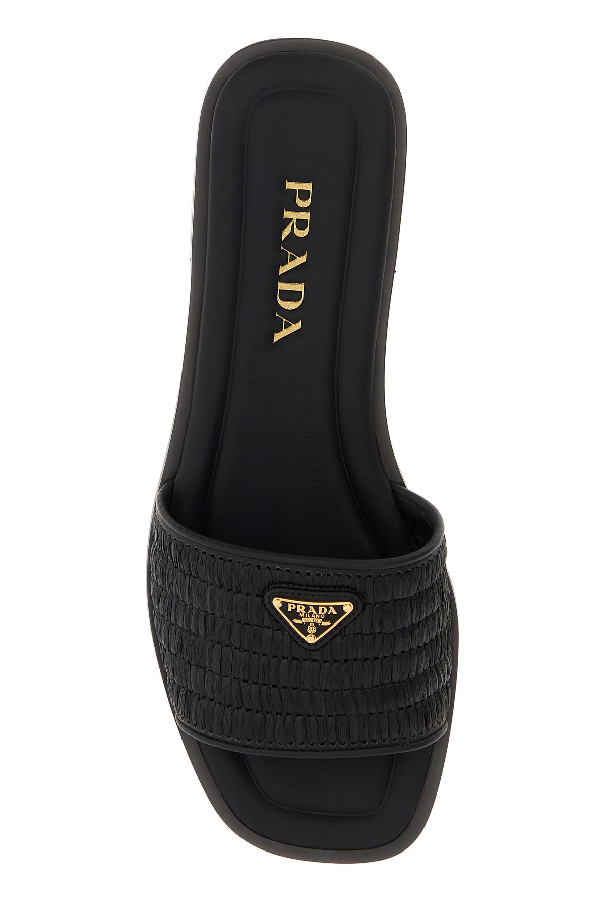 Slippers realized in woven raffia and leather enriched by iconic logoed metal triangle at the front.