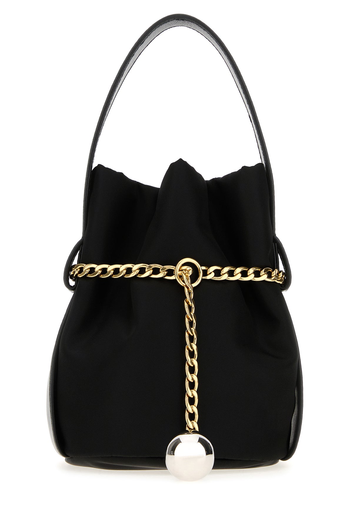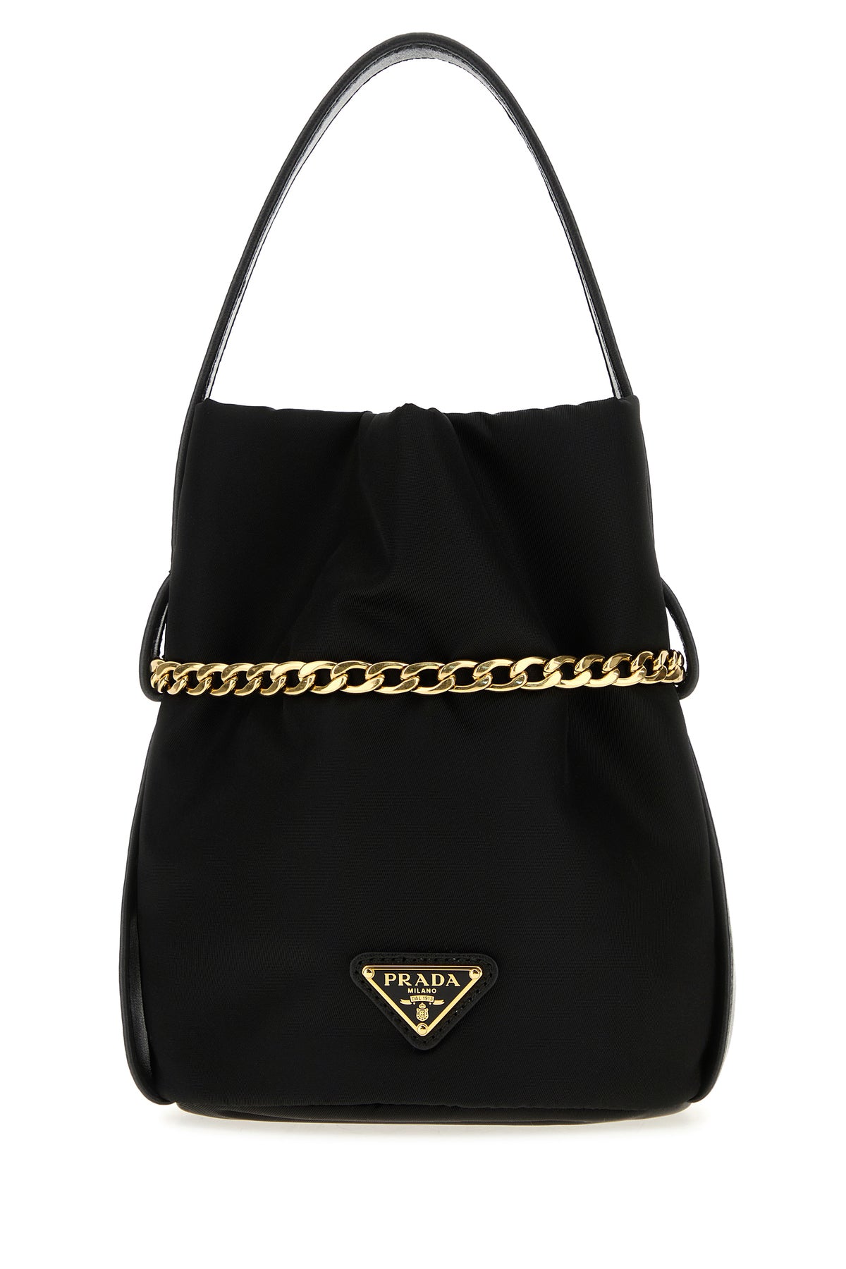 Bucket bag realized in Re-Nylon enriched by iconic logoed metal triangle at the front.