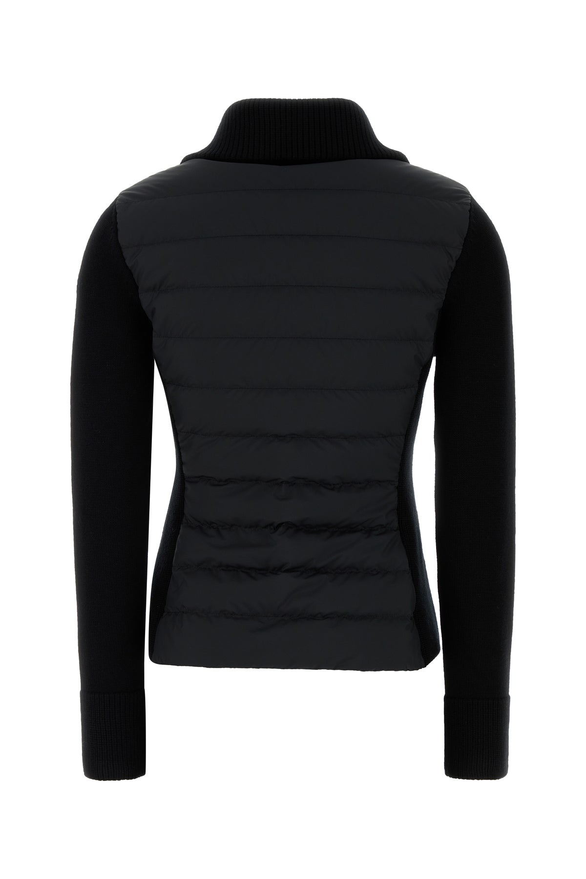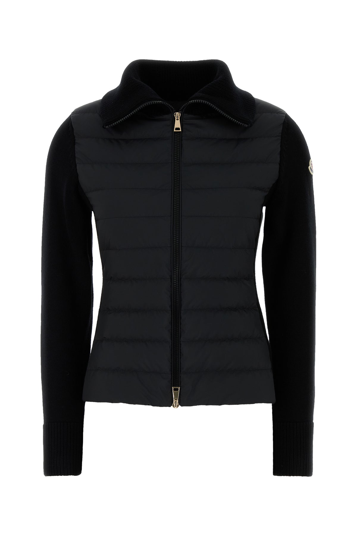 Cardigan realized in pure virgin wool and quilted polyester enriched by contrasting logoed patch on the sleeve.