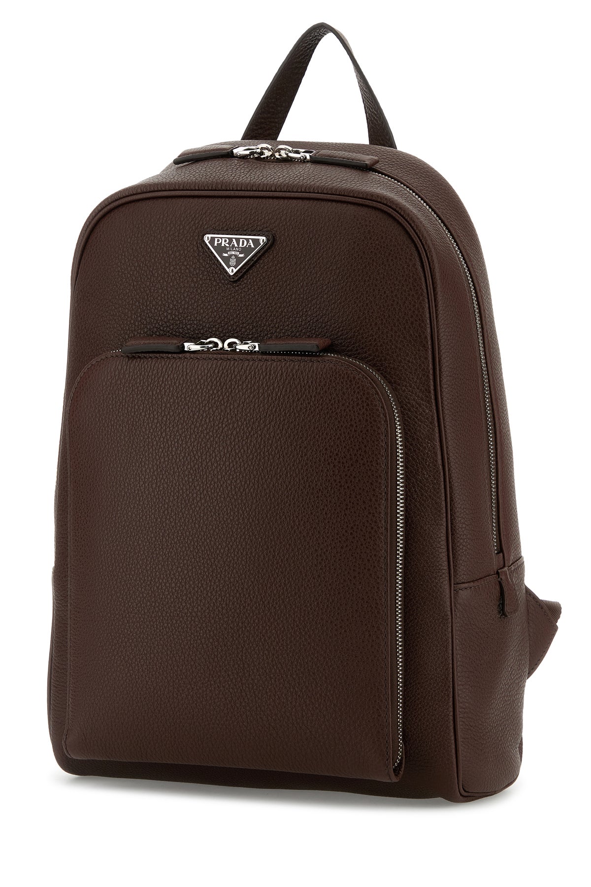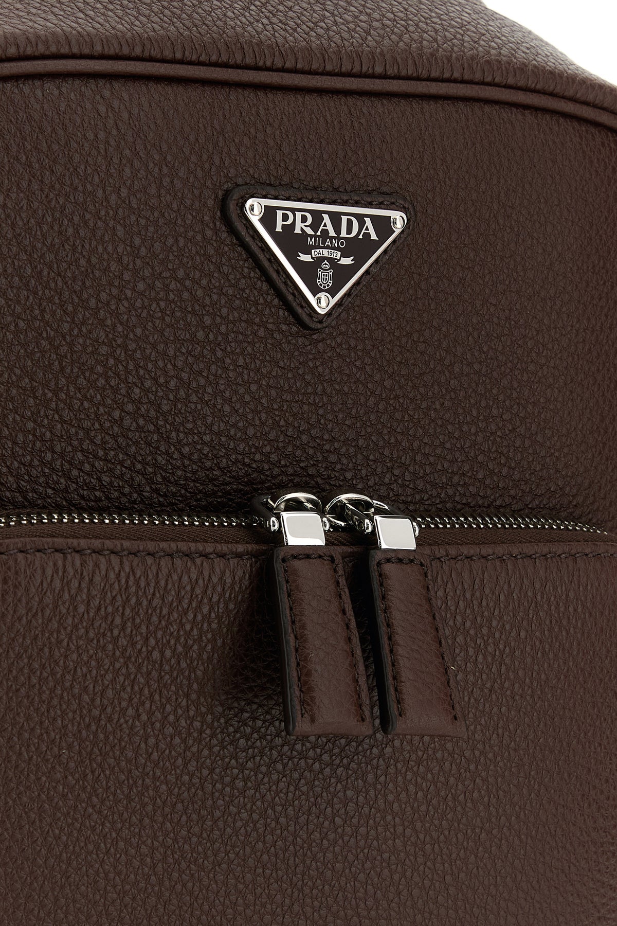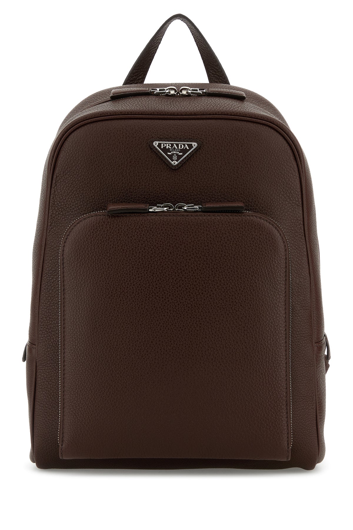 Backpack realized in pebble calf leather enriched by metal iconic logoed triangle at the front.