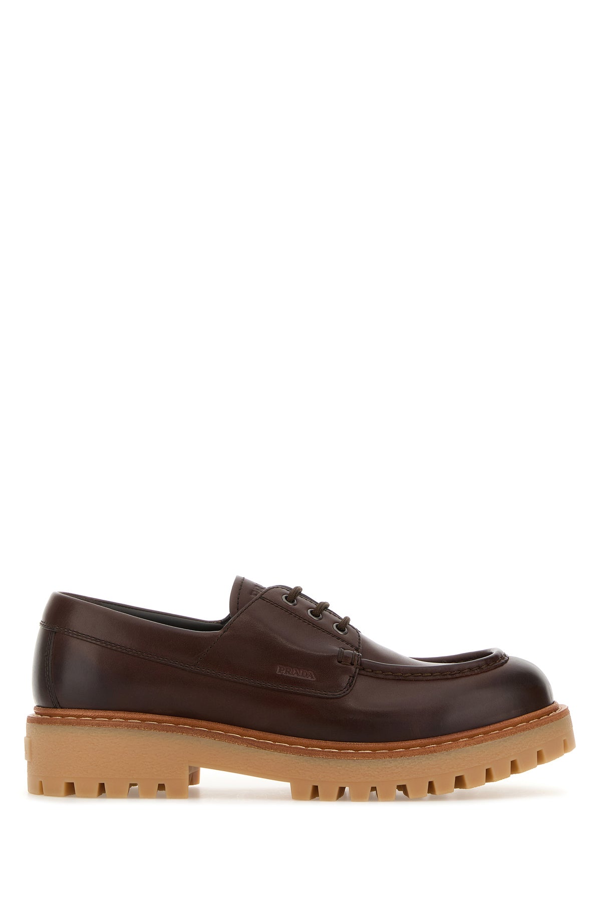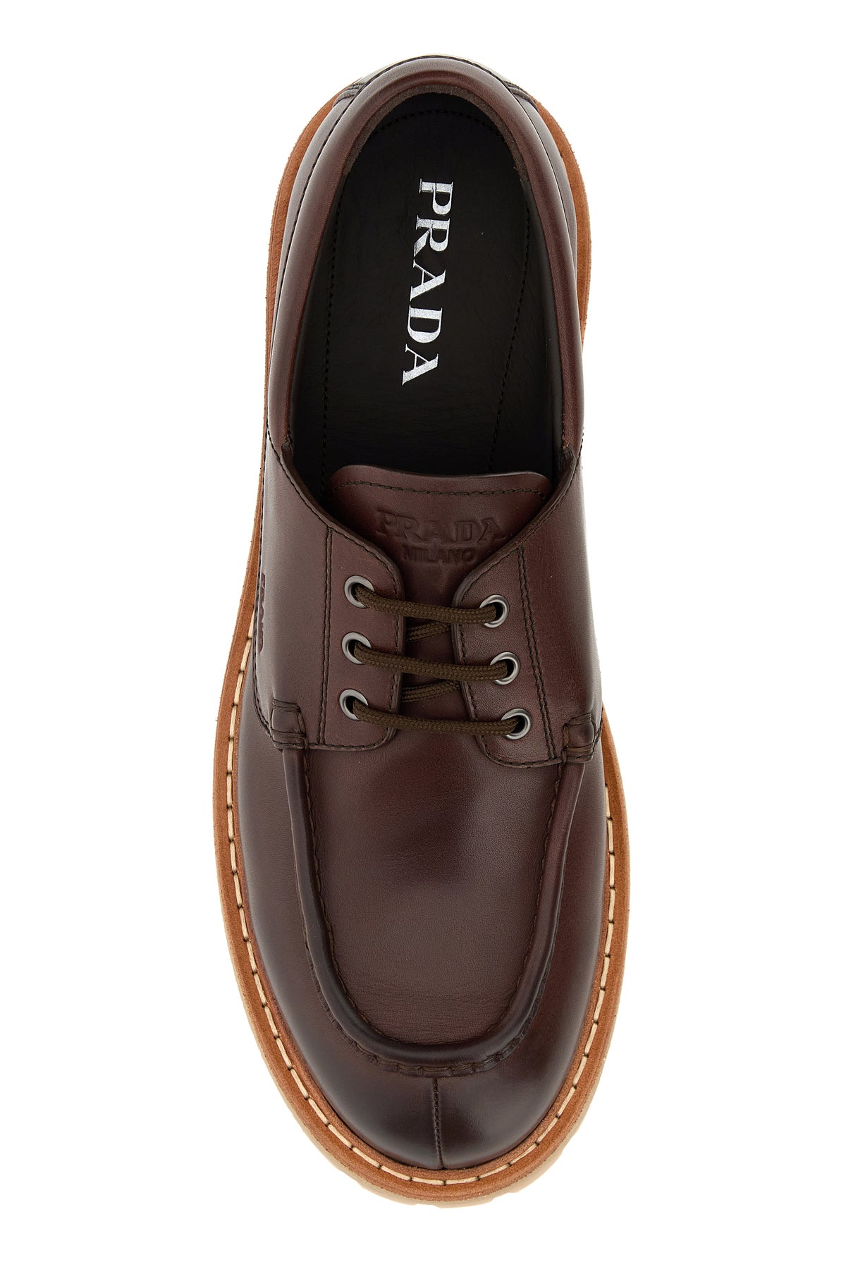 Lace-up shoes realized in smooth calf leather enriched by iconic logoed metal triangle on the vamp.