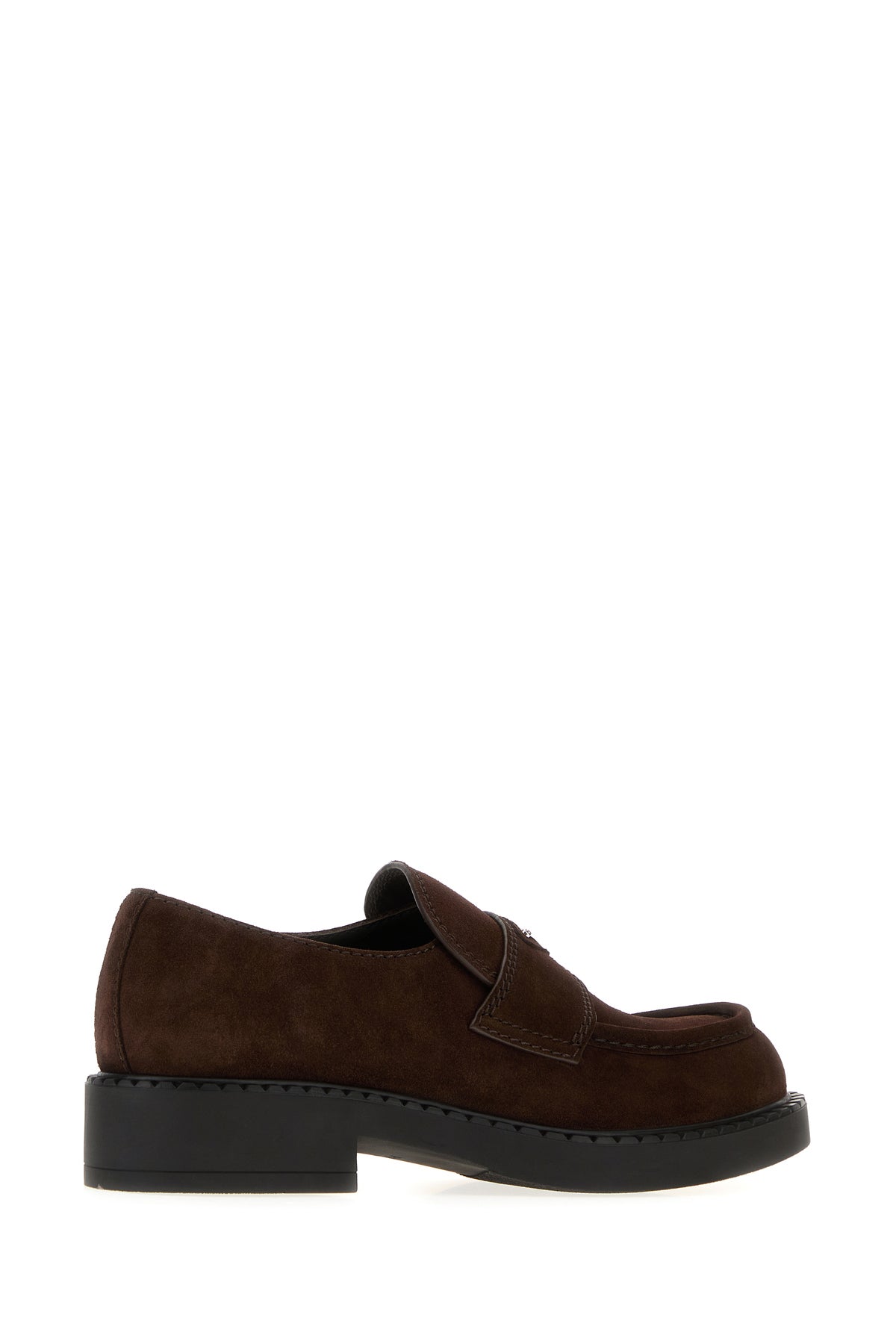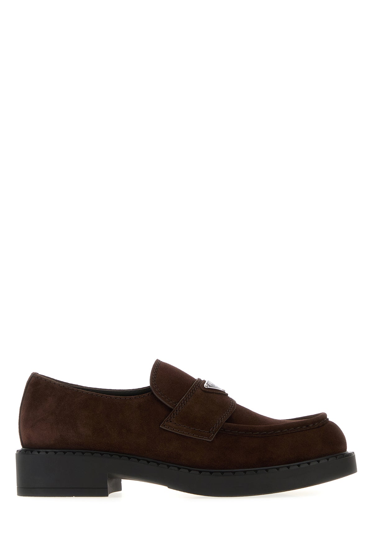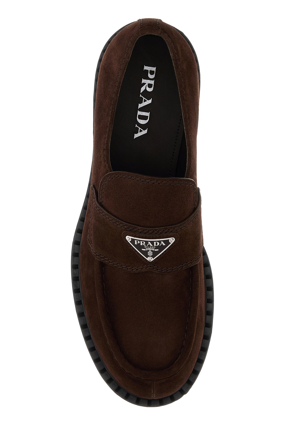 Loafers realized in calf suede enriched by metal iconic logoed triangle on the vamp.