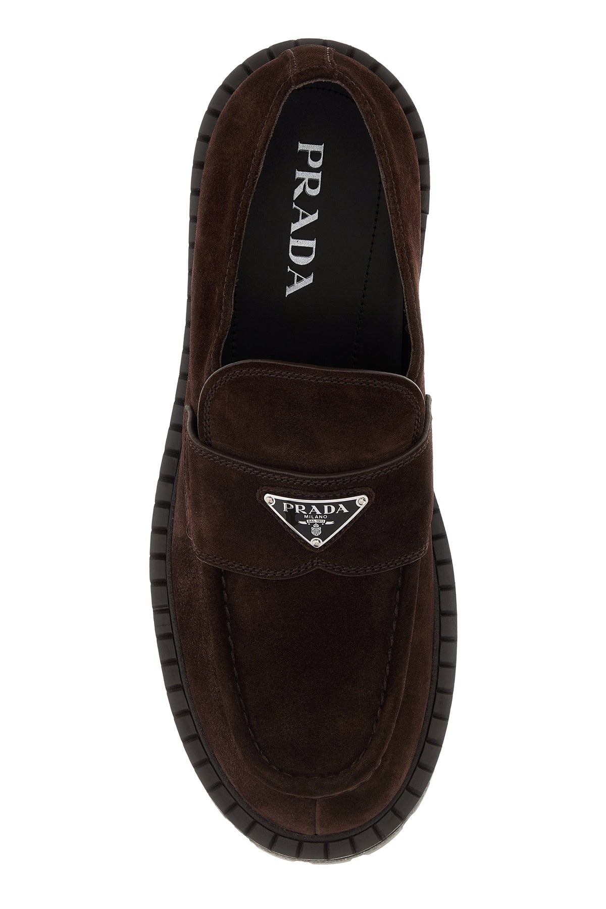 Loafers realized in suede enriched by iconic logoed metal triangle on the vamp.
