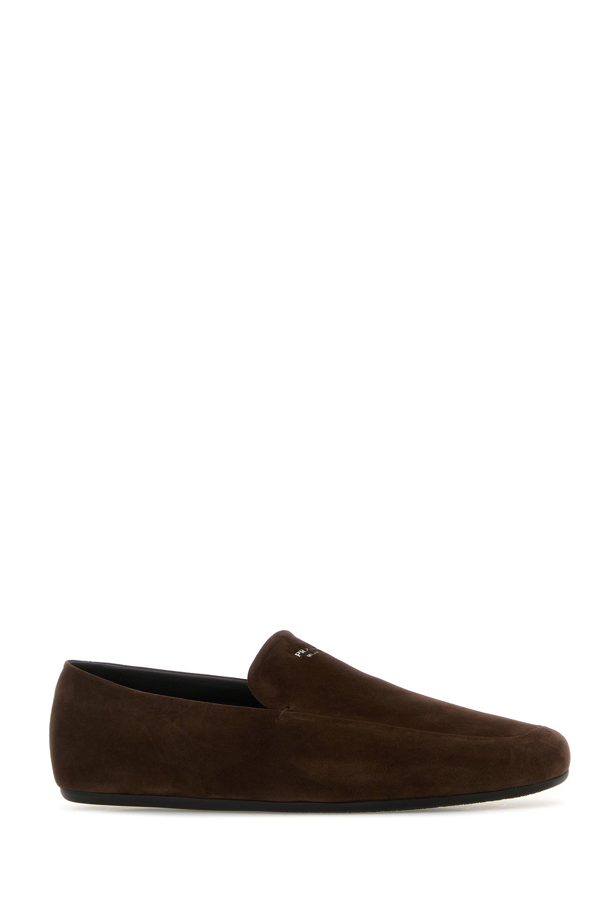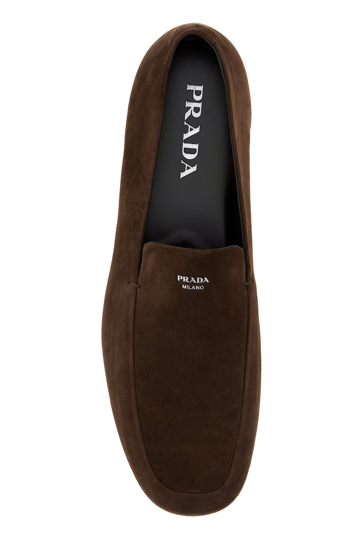 Loafers realized in suede characterized by laminated printed logo on the instep.
