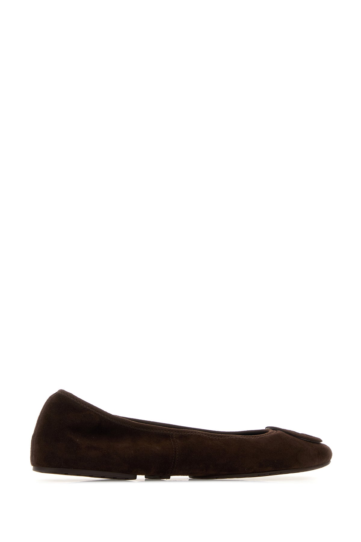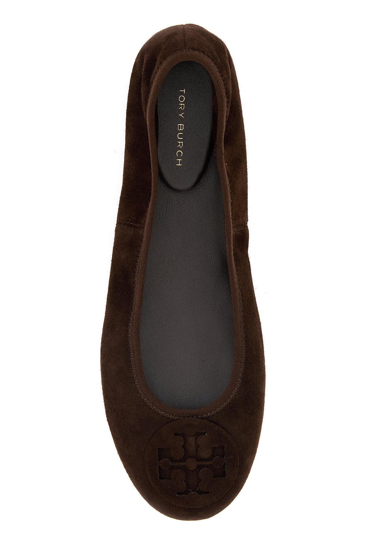 Ballerinas realized in suede enriched by tonal logoed patch on the round toe.
