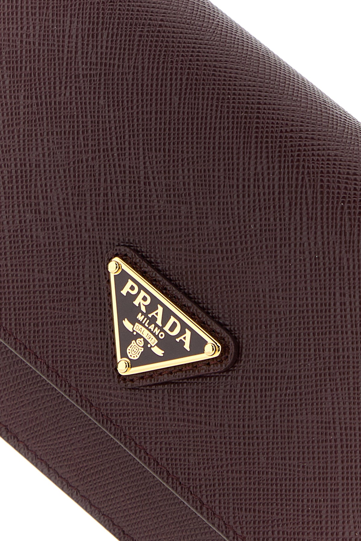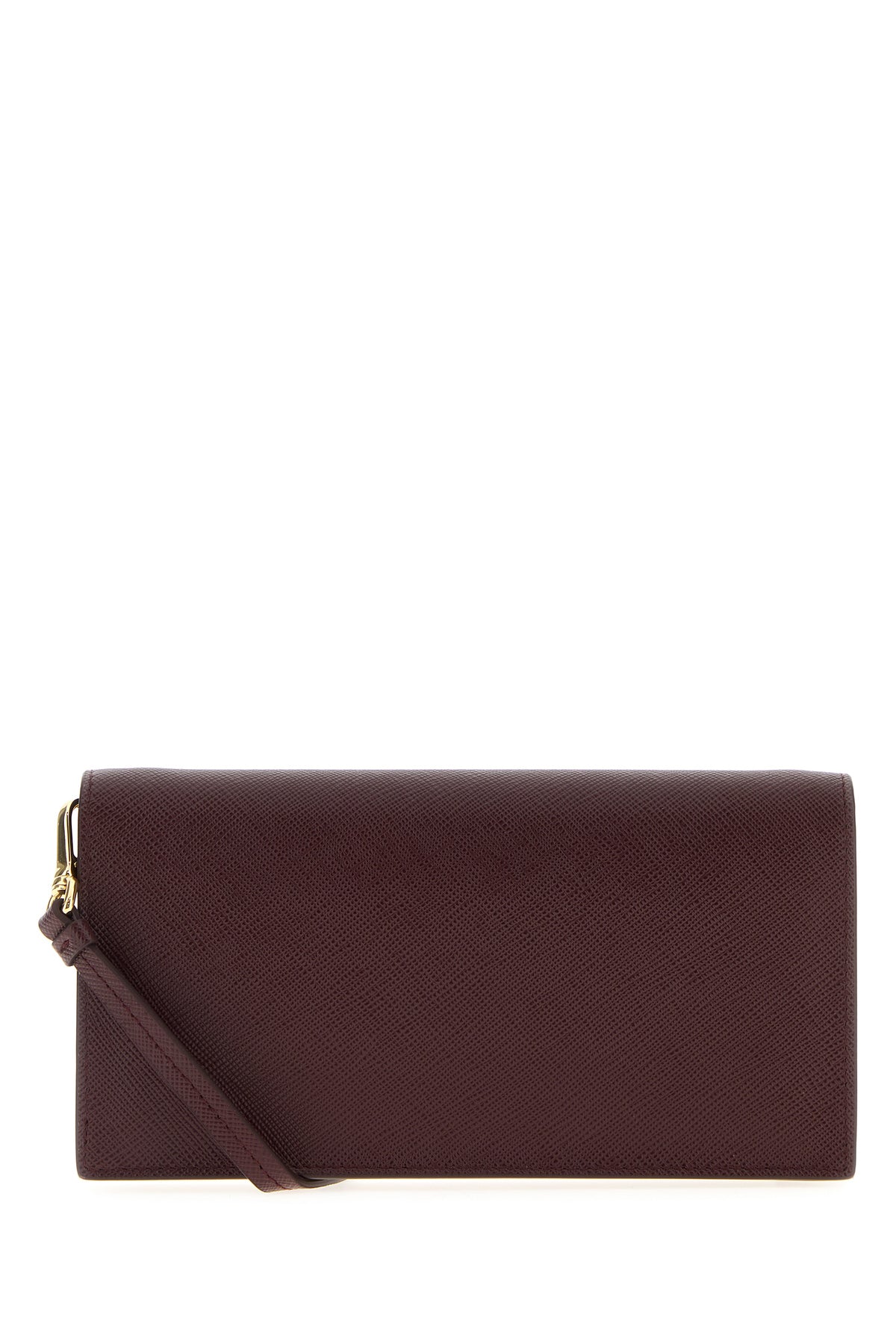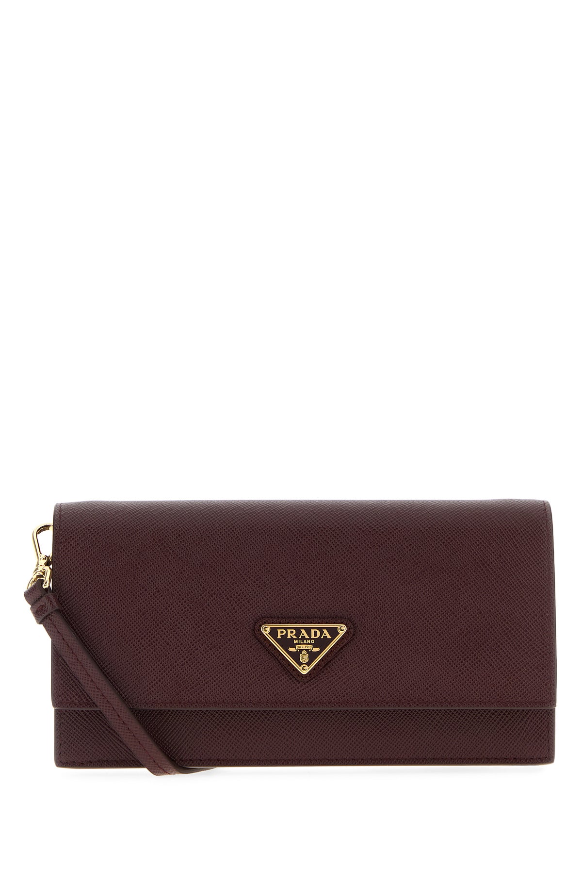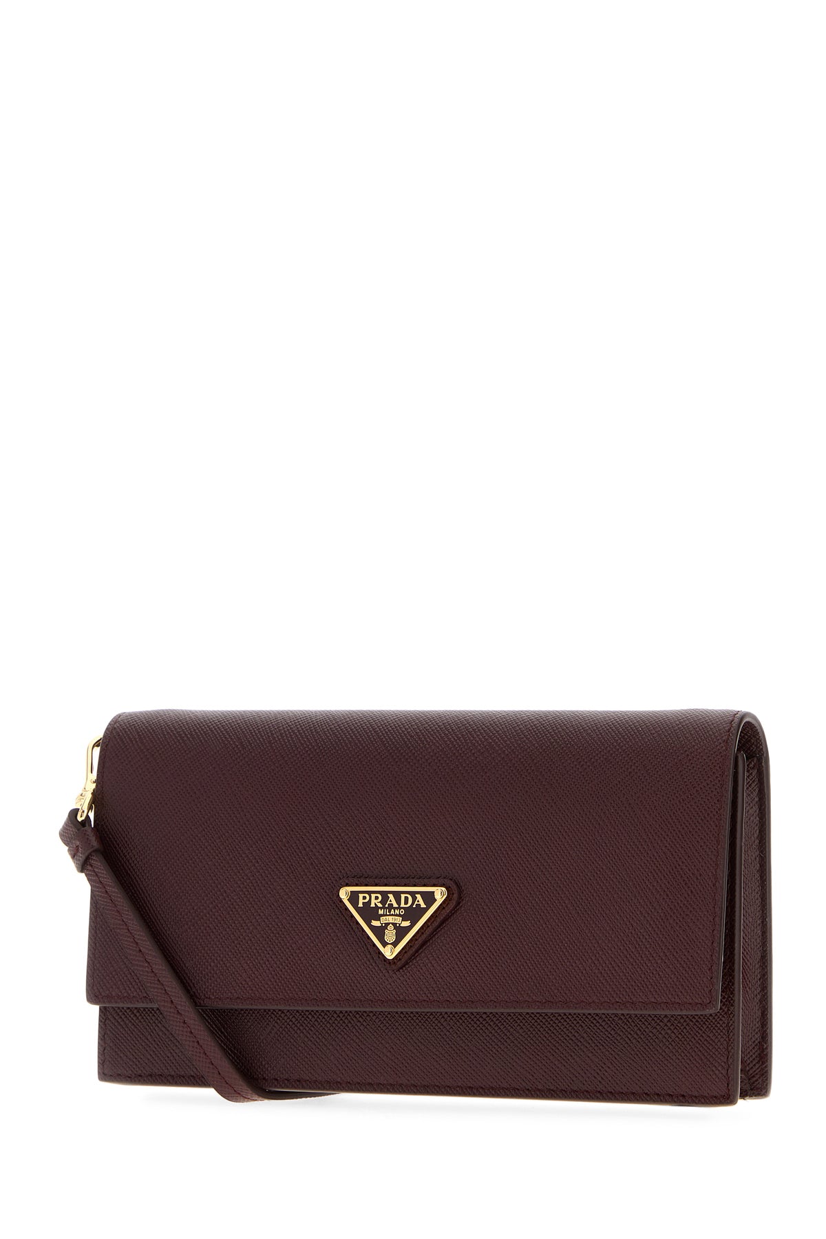 Clutch realized in Saffiano leather enriched by ionic logoed triangle on the flap.