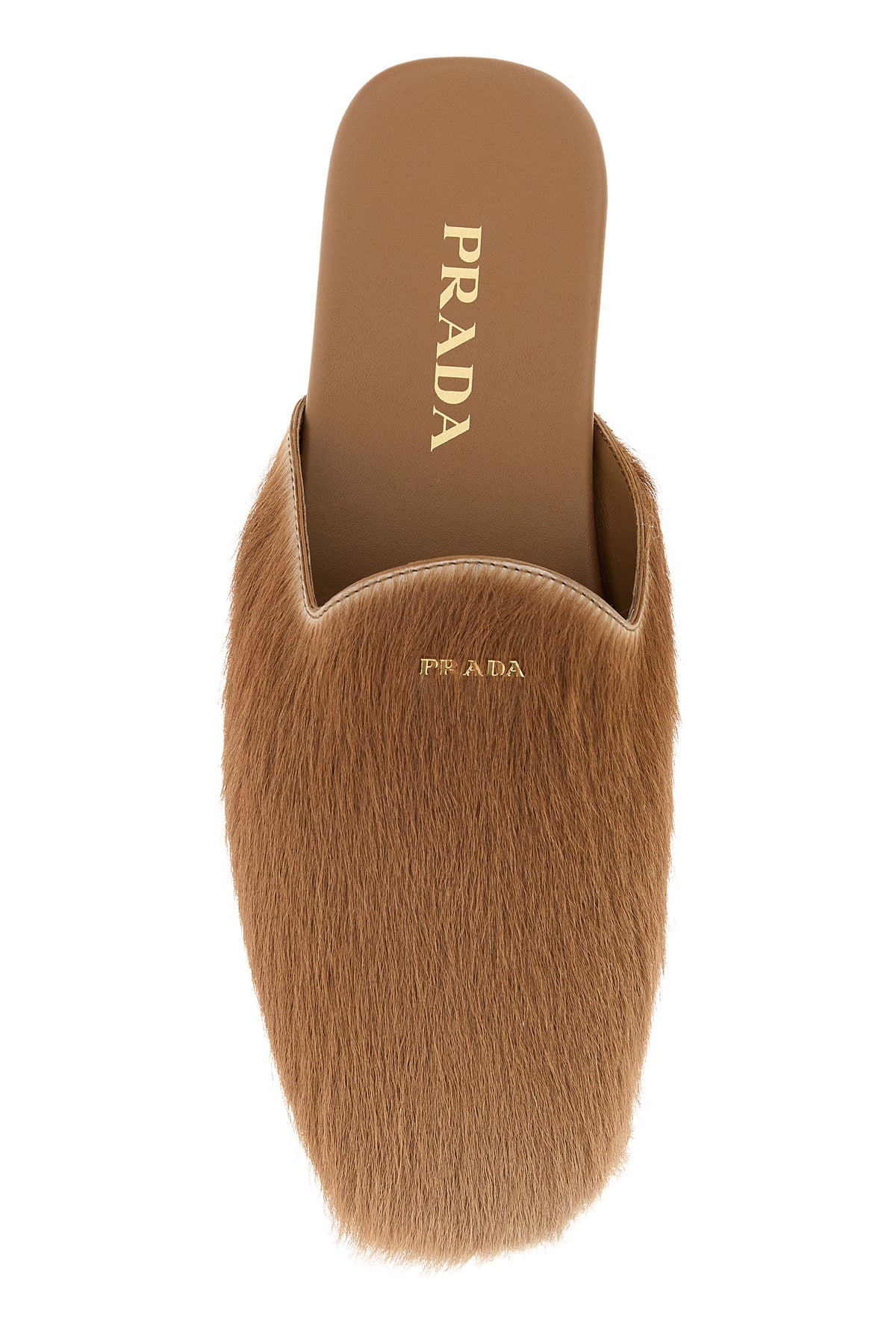 Slippers realized in calf hair enriched by metal lettering logo on the instep.
