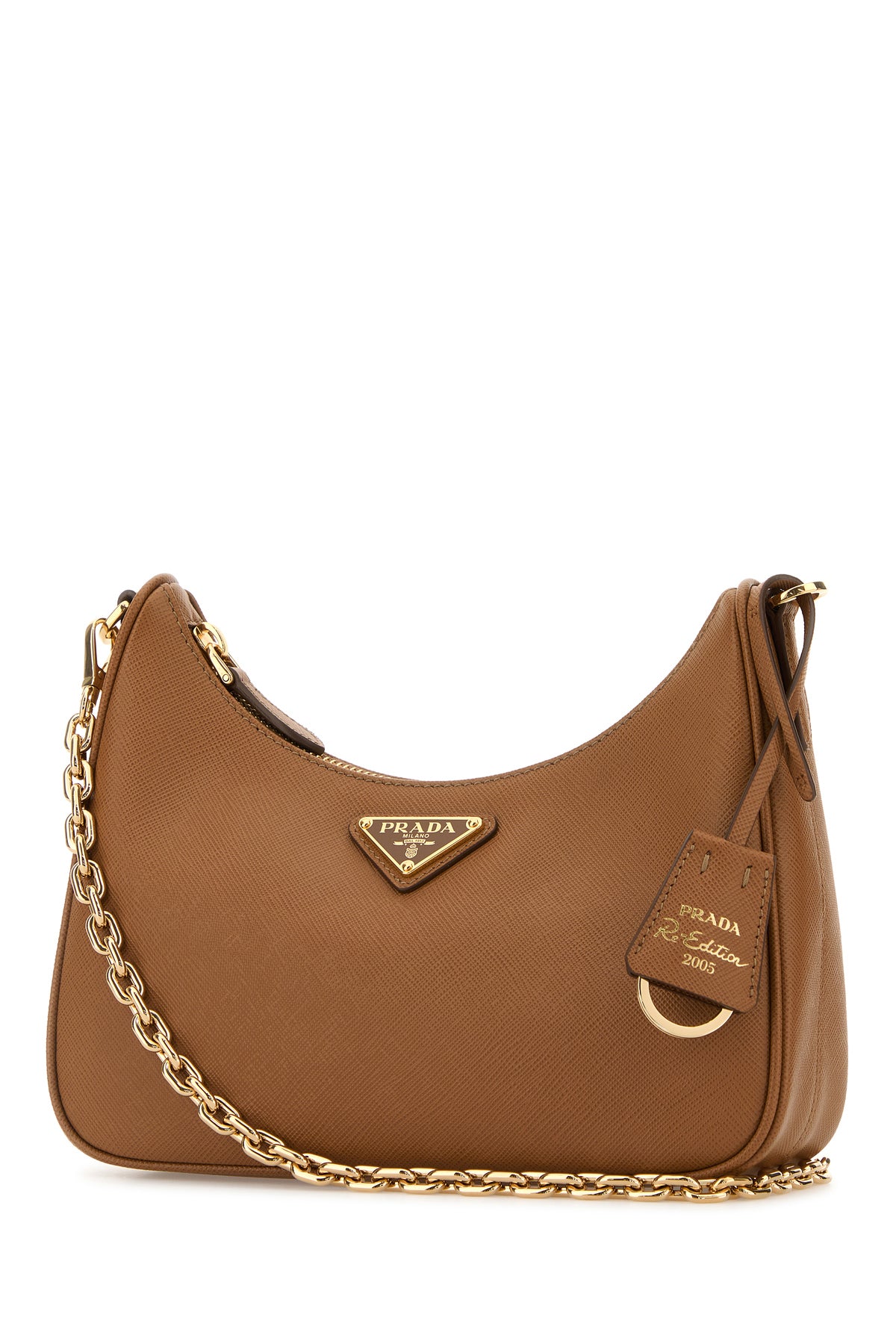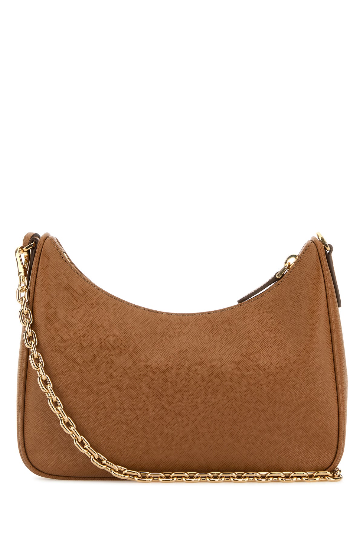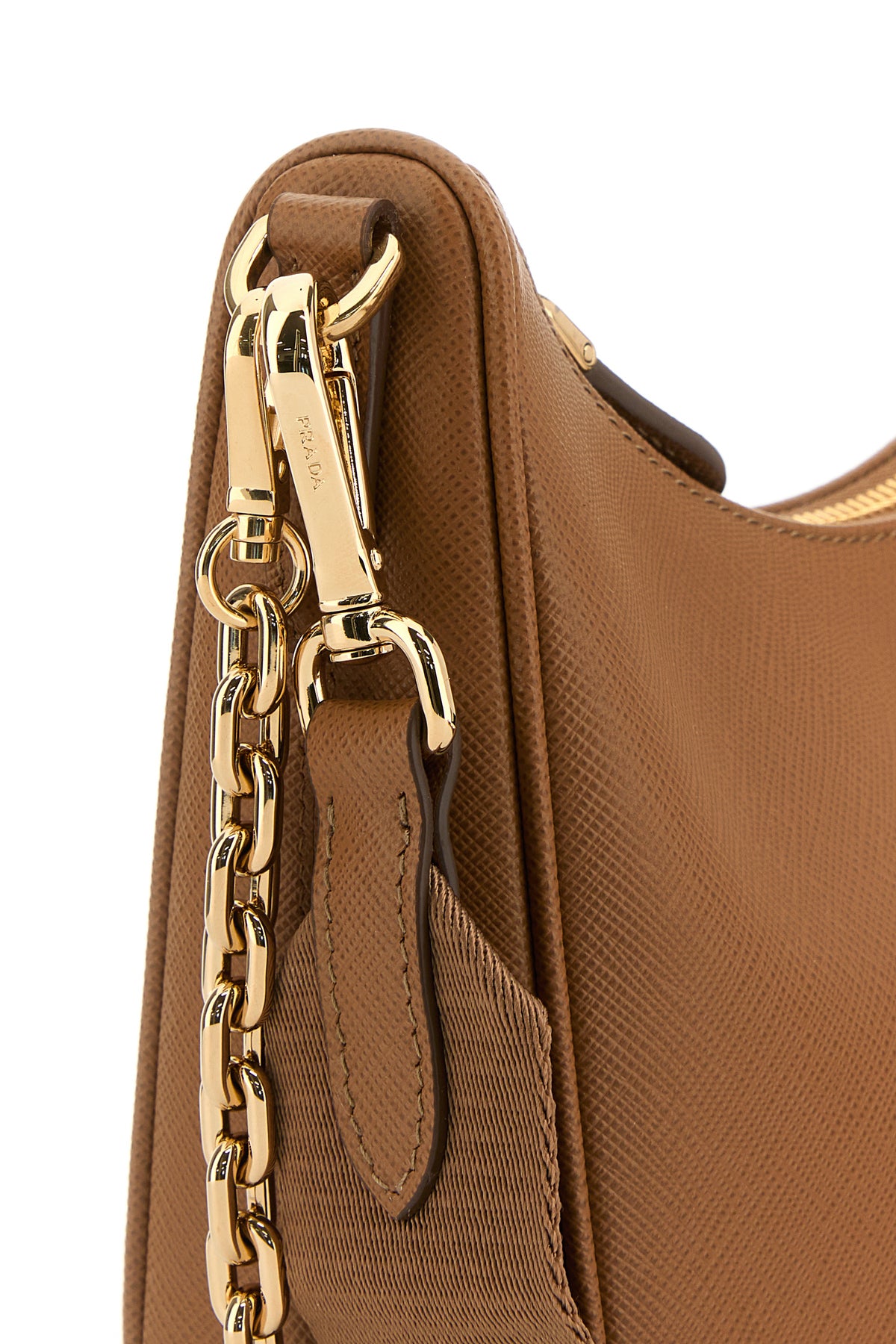 Shoulder bag realized in Saffiano leather enriched by metal iconic logoed triangle at the front and detachable tonal leather accessory with key ring.