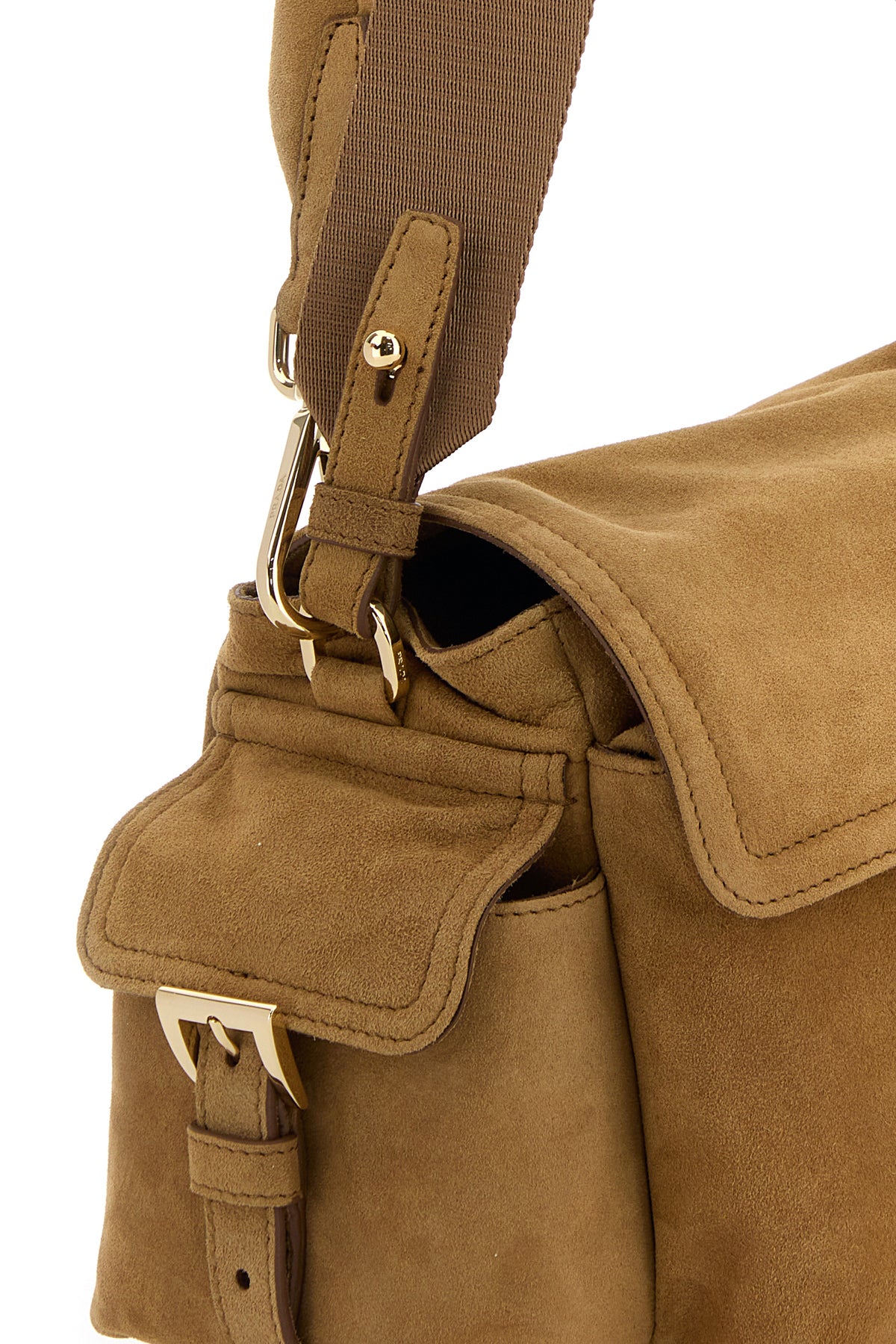 Shoulder bag realized in suede enriched by iconic logoed metal triangle at the front.