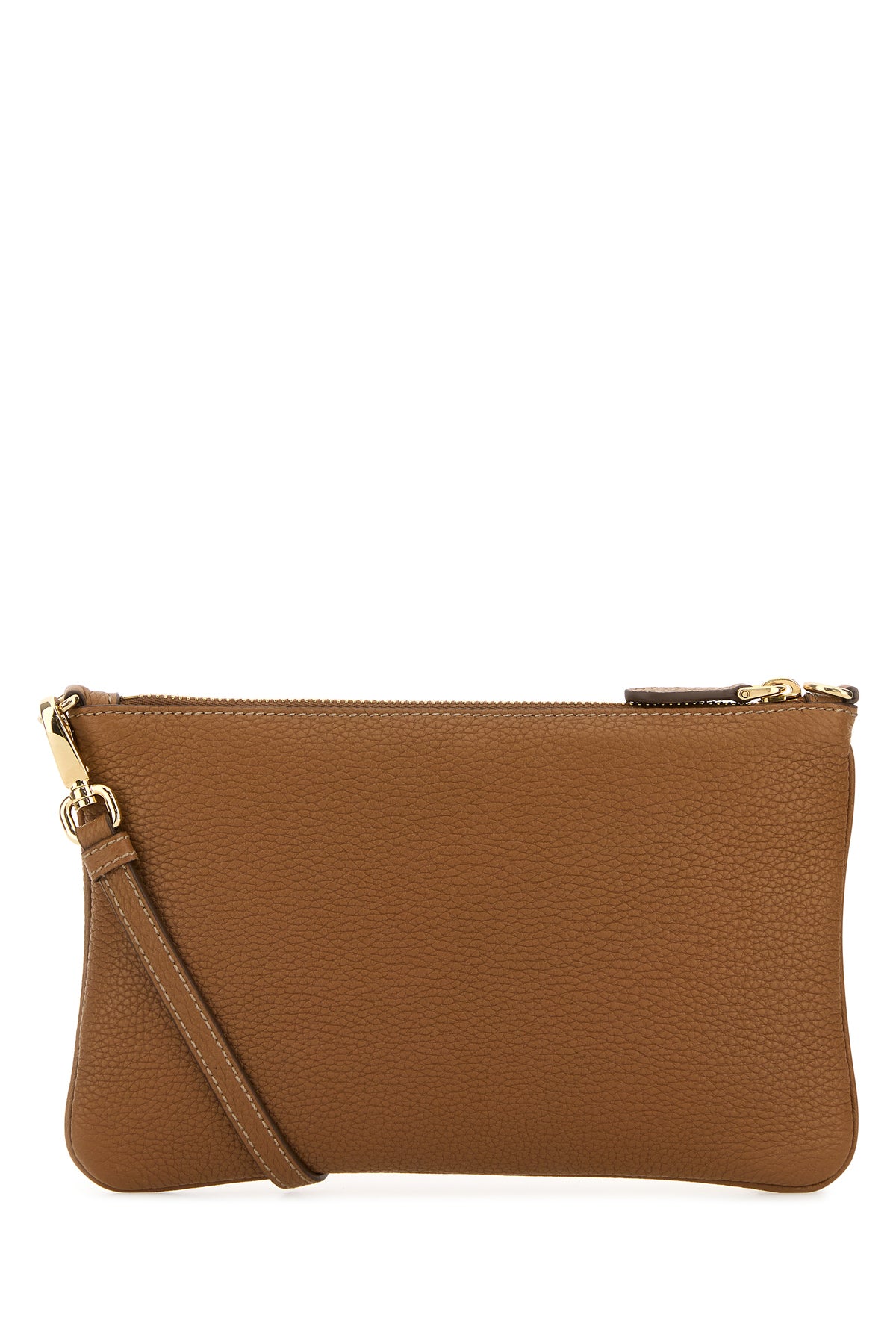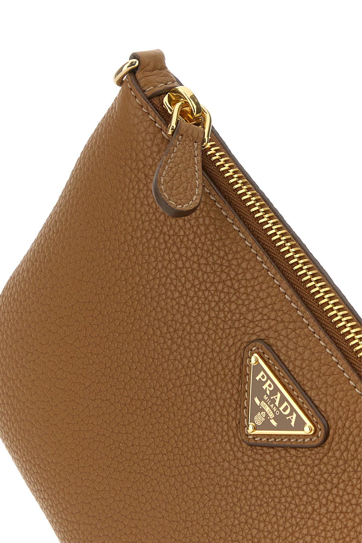 Crossbody bag realized in pebble leather enriched by iconic logoed metal triangle at the front.