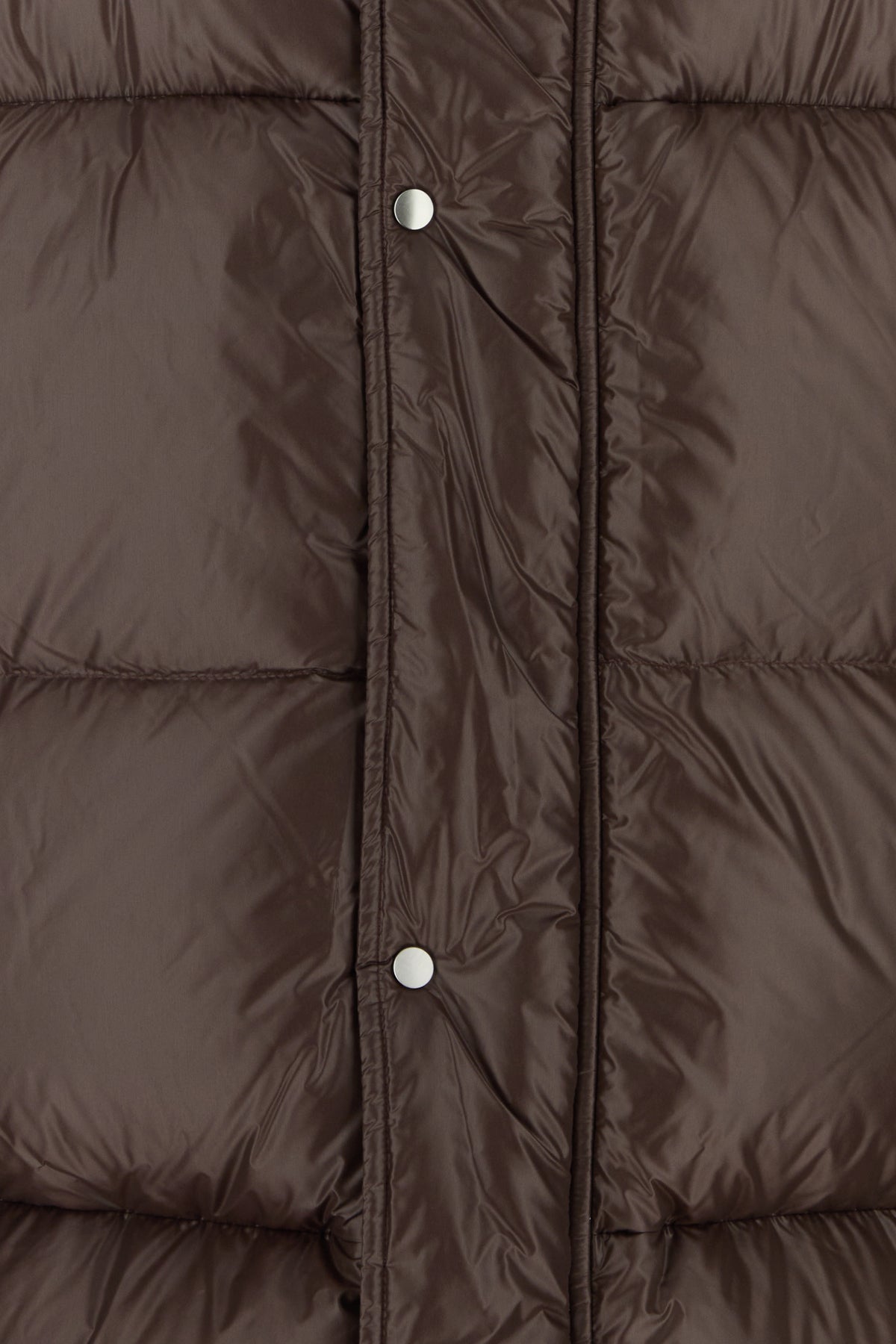 Down jacket realized in quilted nylon characterized by drawstring hood.
