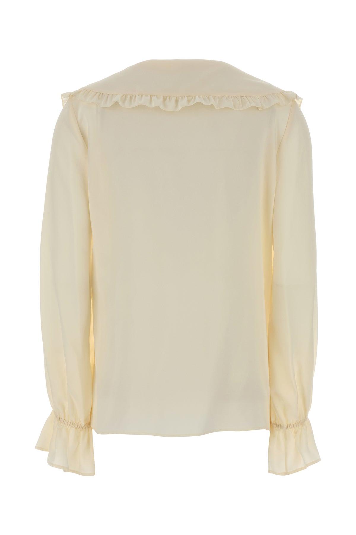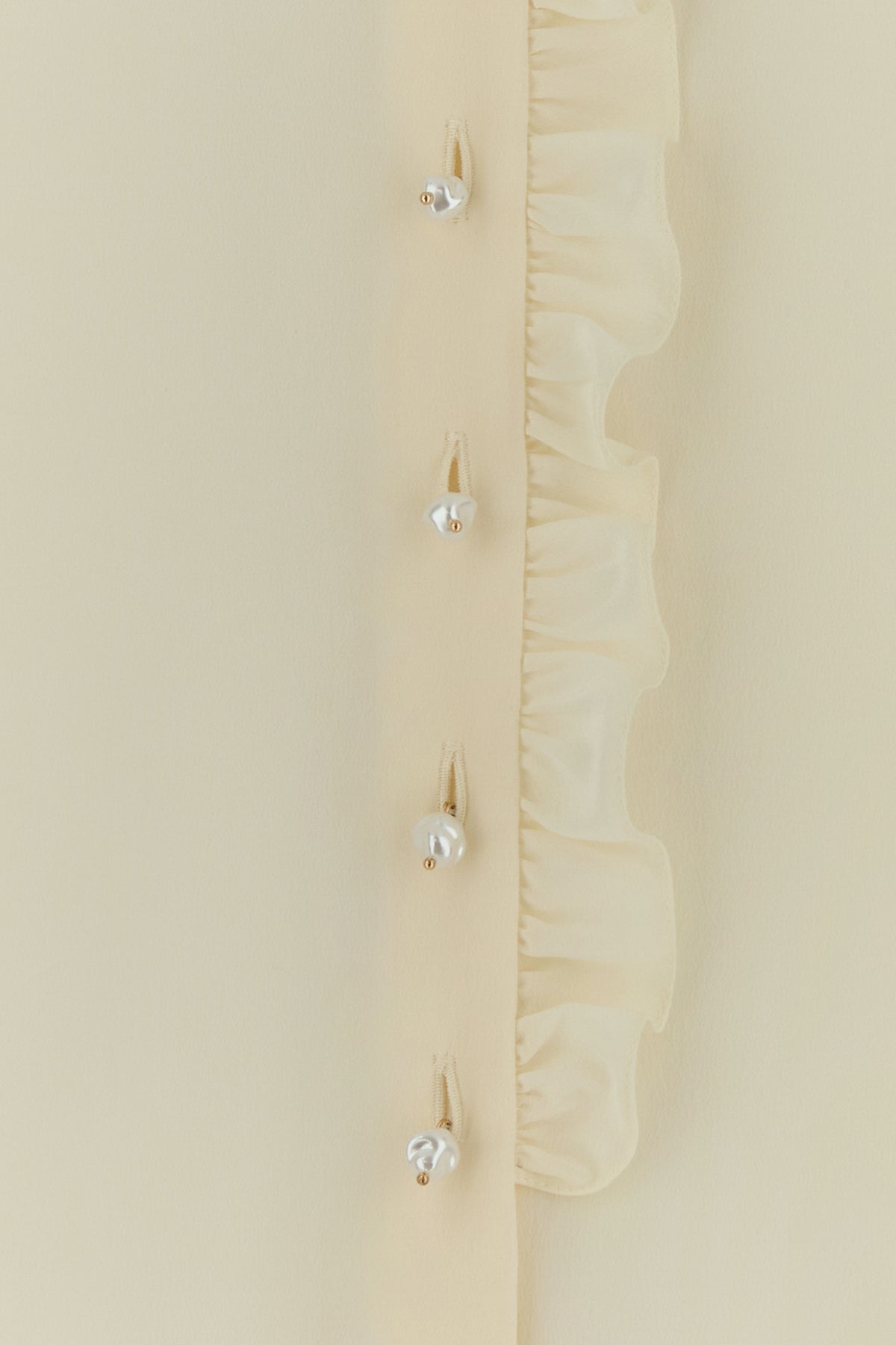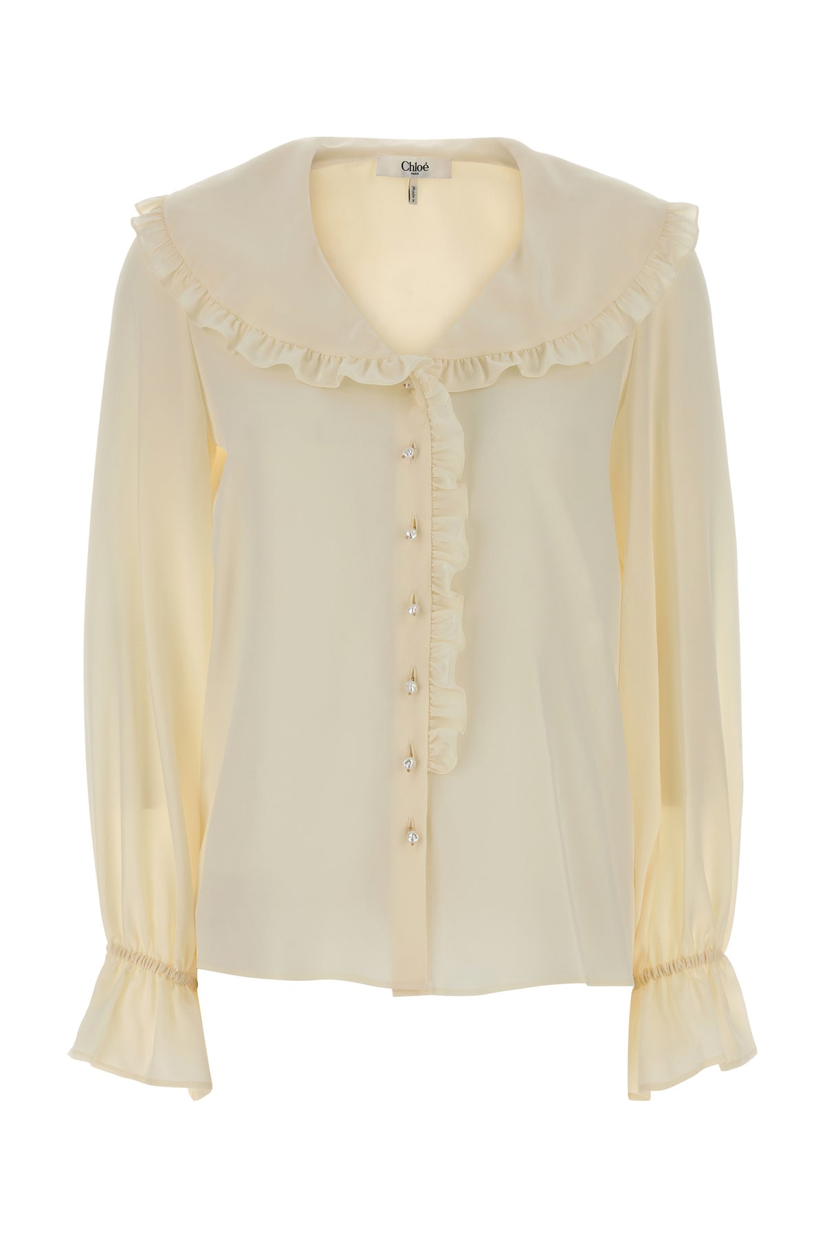 Shirt realized in crepe characterized by flounces on the collar and on the butts closure