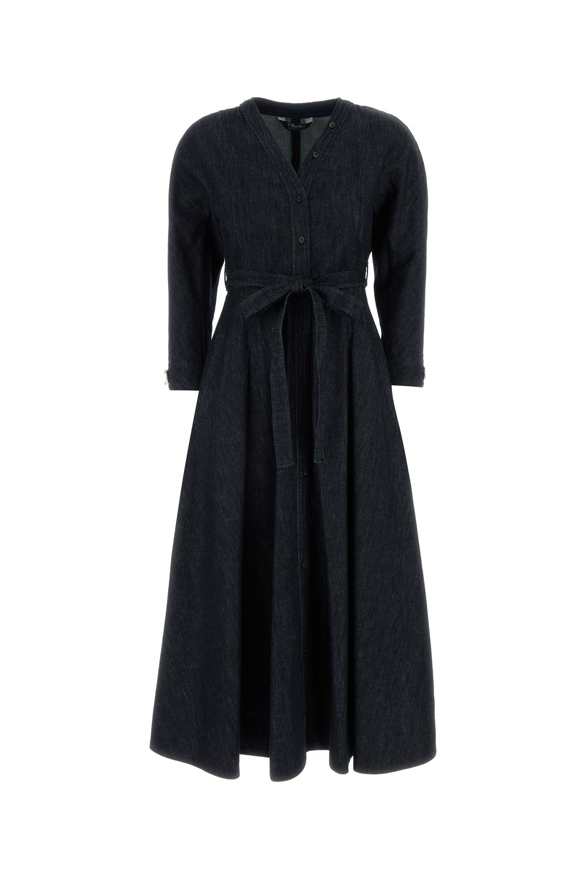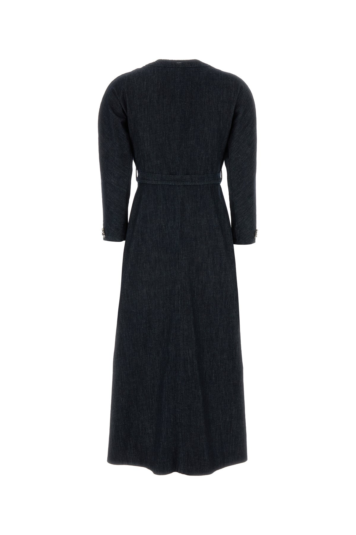 Midi-length dress realized in cotton blend denim enriched by jewel embellishment on the cuffs and logoed label at the back.