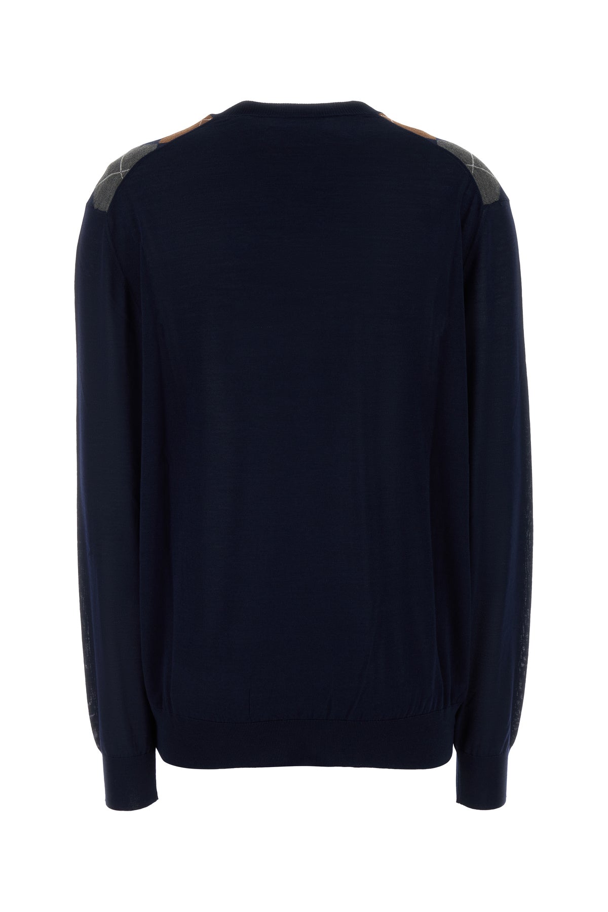 Sweater realized in pure virgin wool characterized by checked embroidery at the front and embroidered logo on the chest.