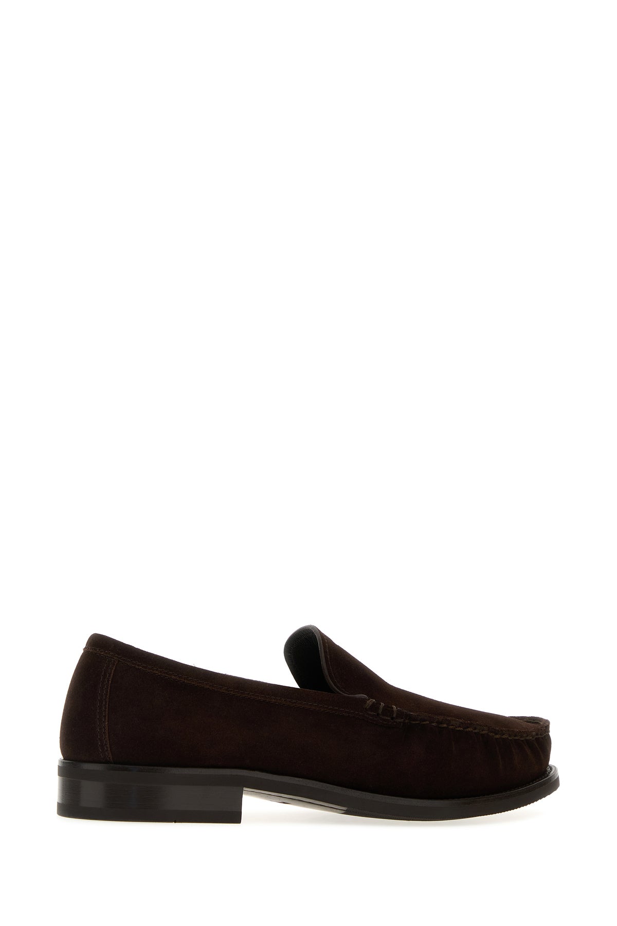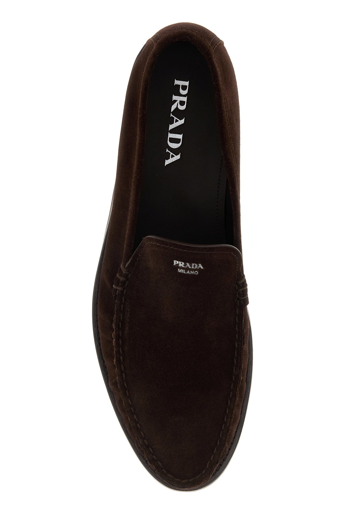 Loafers realized in suede characterized by laminated printed logo on the instep.