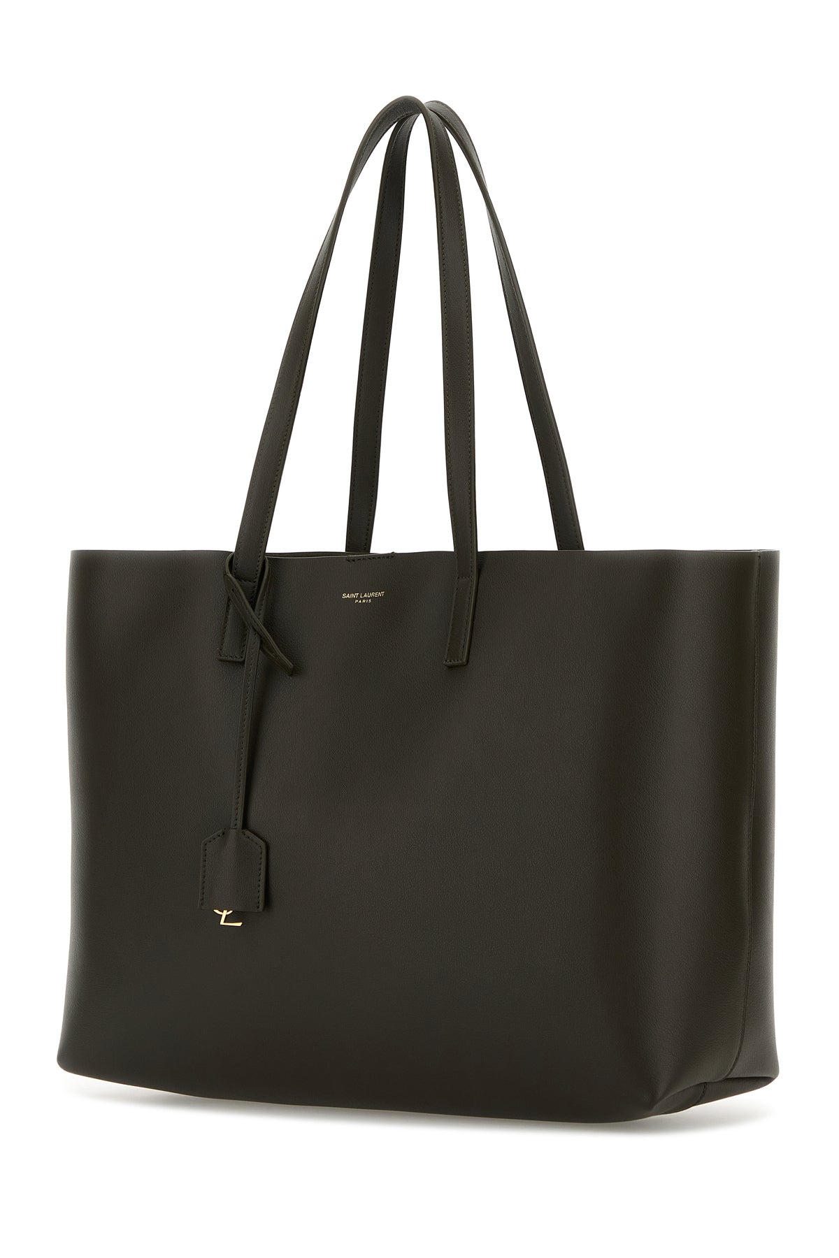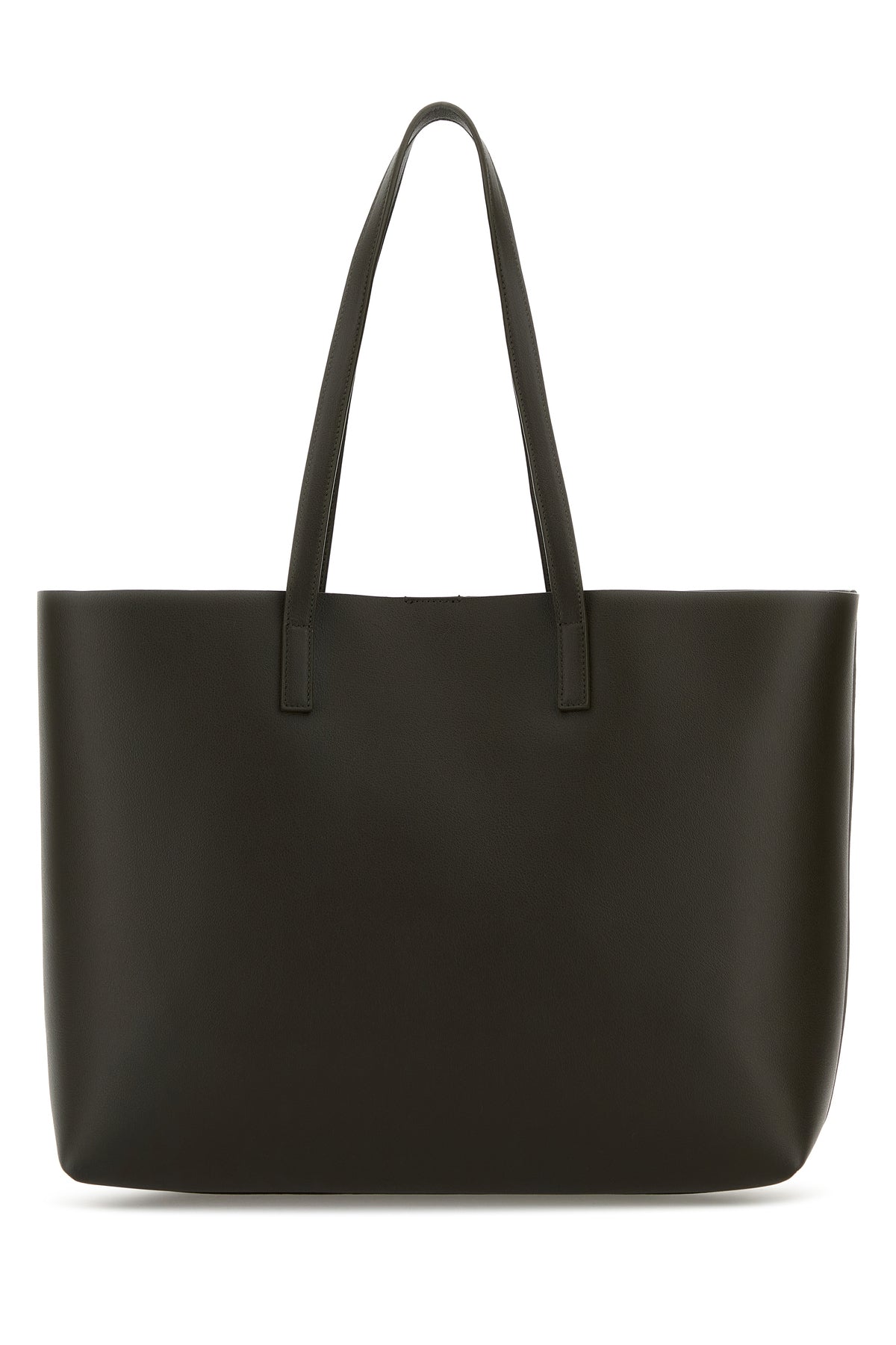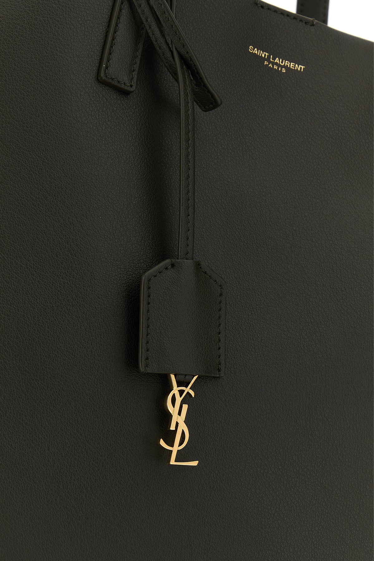 Shopping bag realized in soft calf leather characterized by contrasting printed logo at the front enriched by tonal leather detachable accessory at the front.