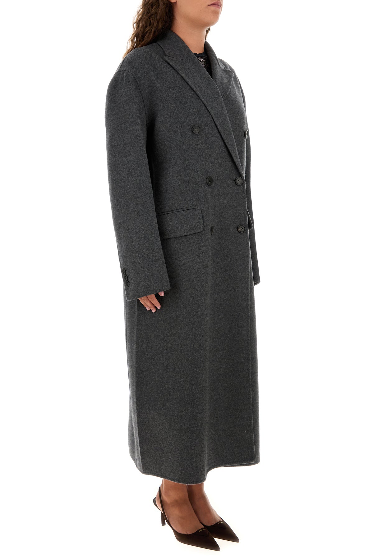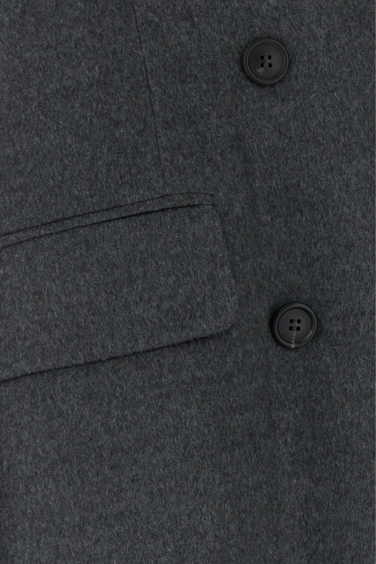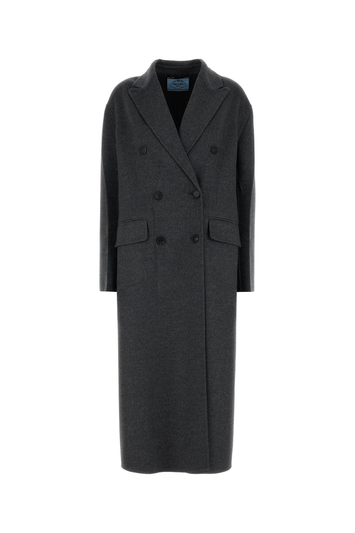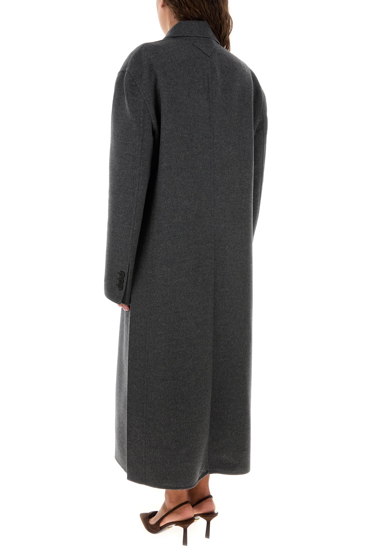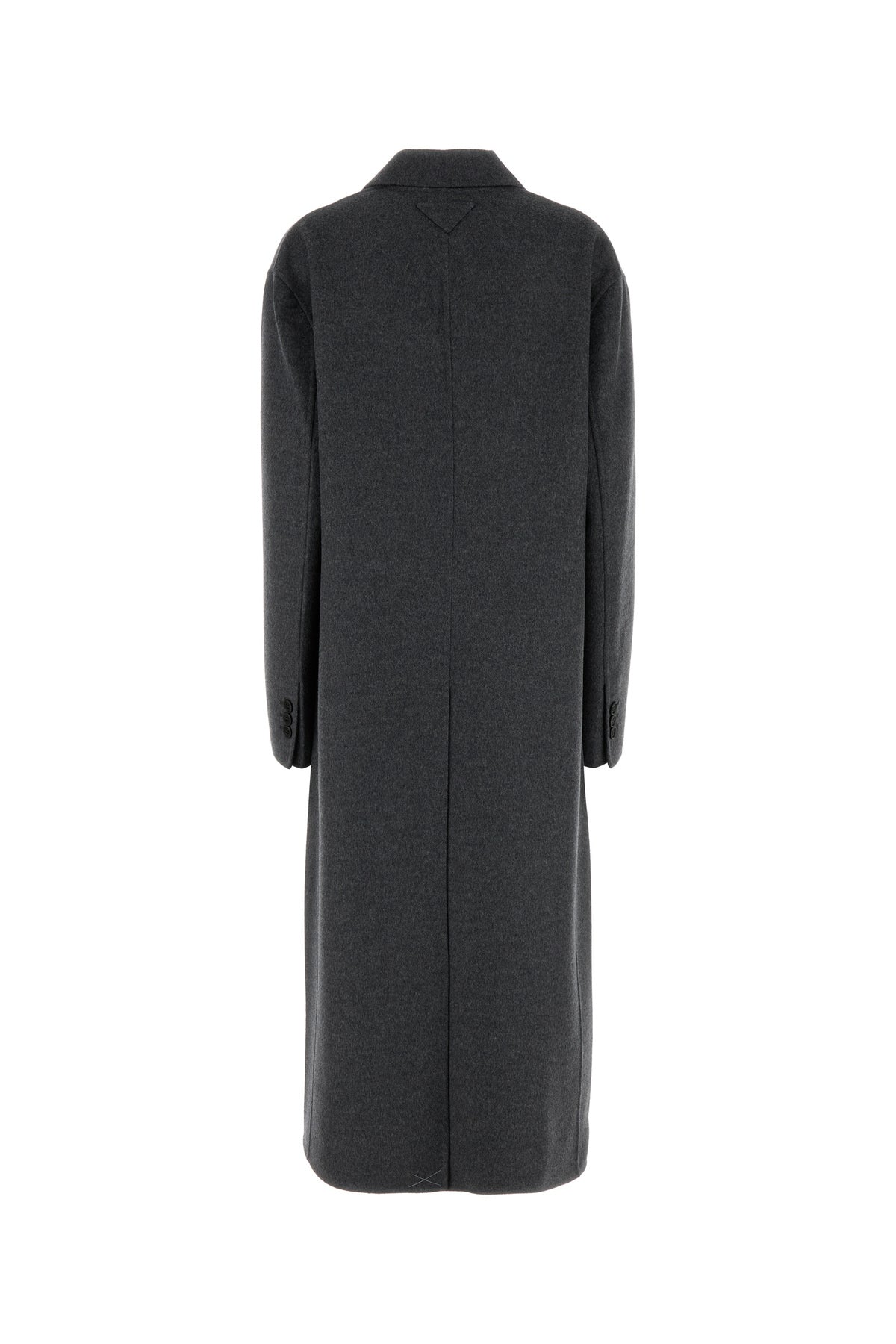 Long-cut coat realized in wool and cashmere enriched by tonal fabric iconic triangle at the back.